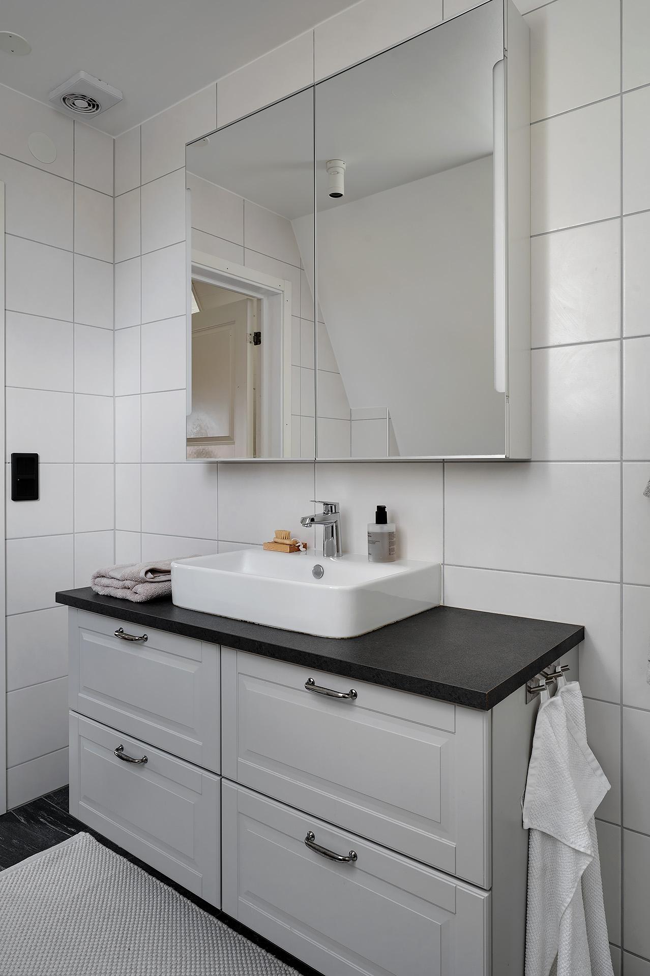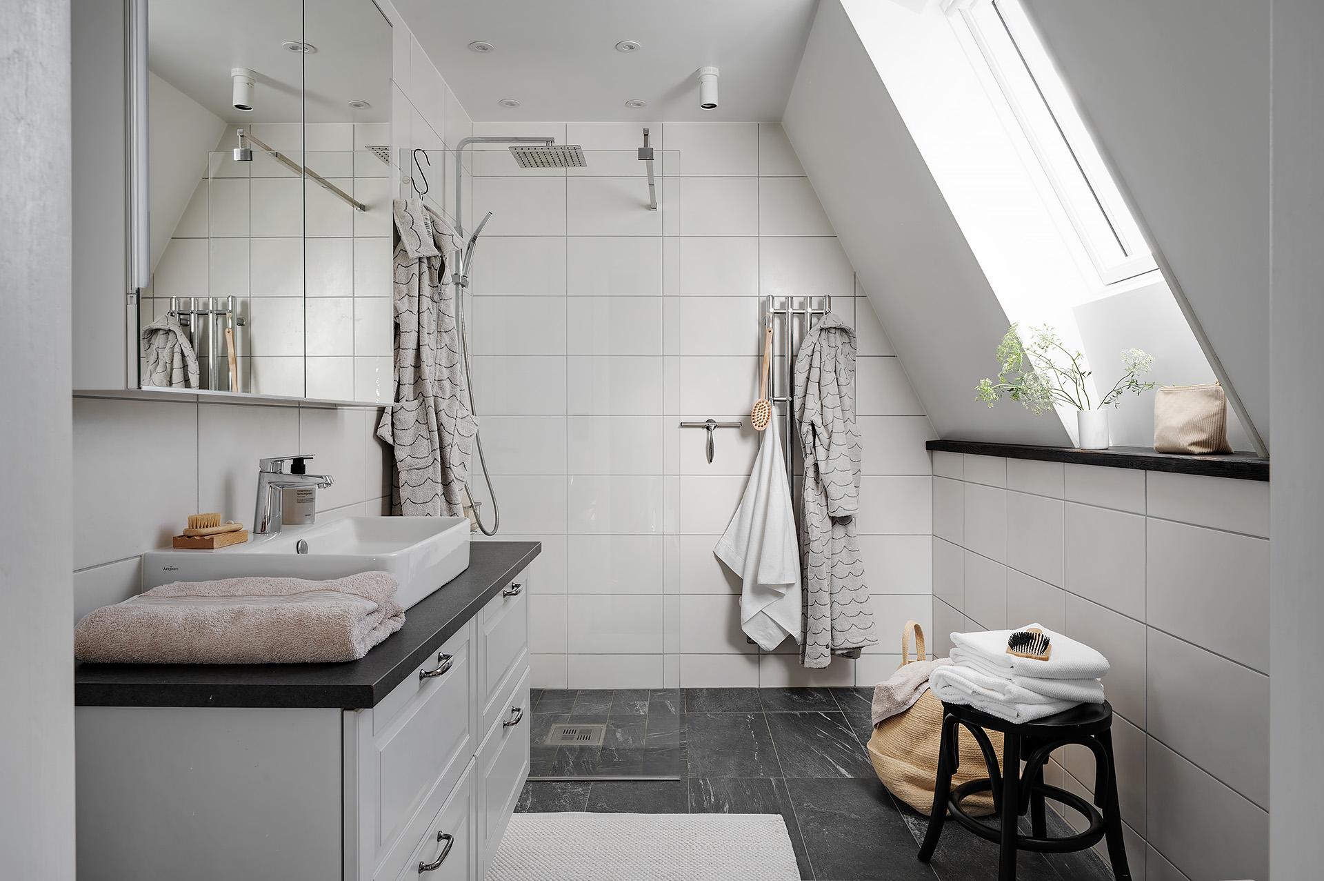 Det fräscha badrummet, totalrenoverat 2019, inrymmer duschhörna, handdukstork, tvättkommod, spegelskåp och wc. Duschhörnan, som skärmas av med en glasskiva, är utrustad med både takdusch och handmunstycke. Spegelskåpet är extra brett, och kommoden har fyra rymliga lådor. Handfatet vilar på en bred bänk med gott om avställningsyta. Väggarna är helakaklade i vitt och golvet belagt med mörk klinker med golvvärme. Ett vädringsfönster i sydväst fyller badrummet med dagsljus och kvällssol.