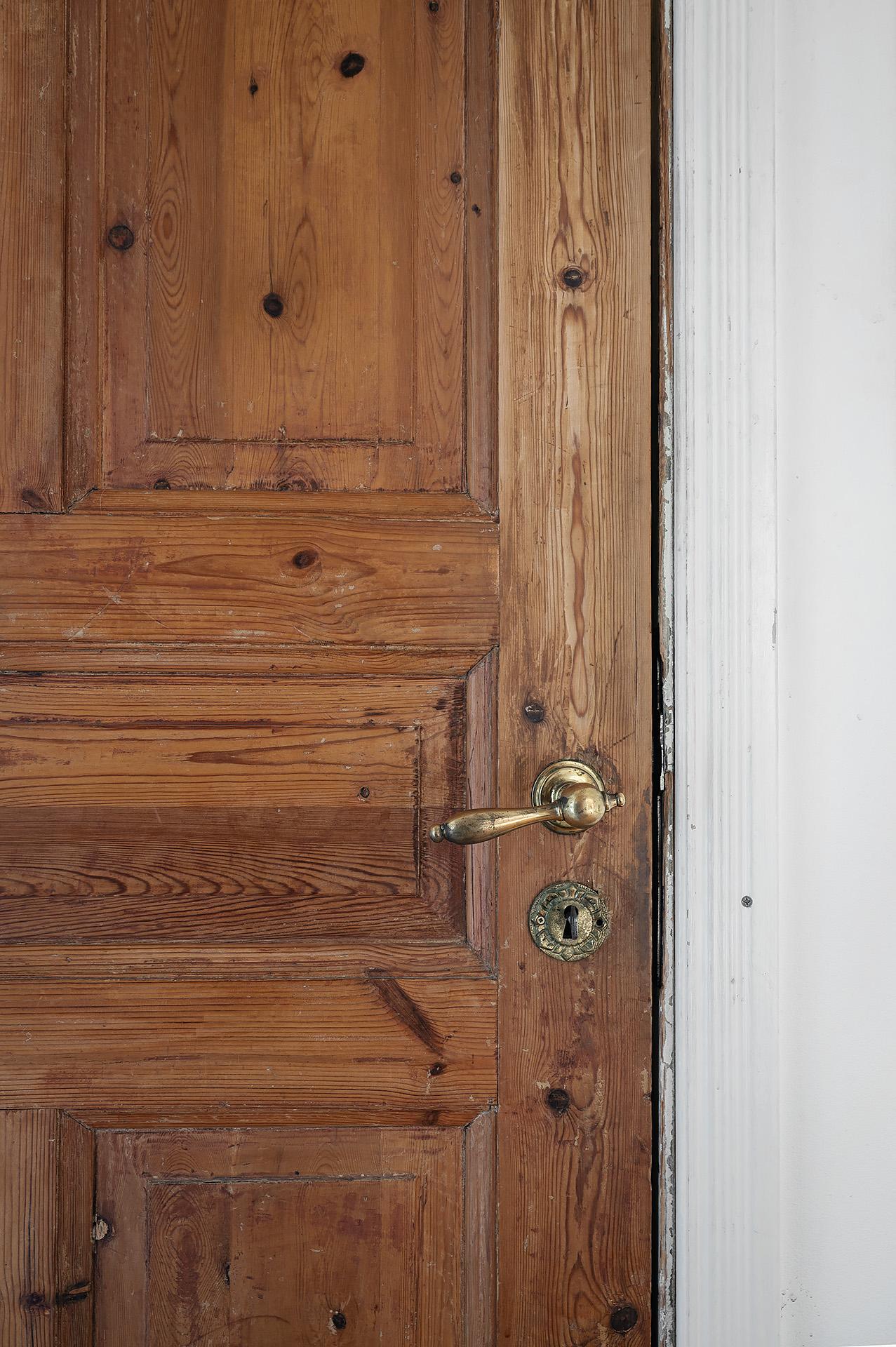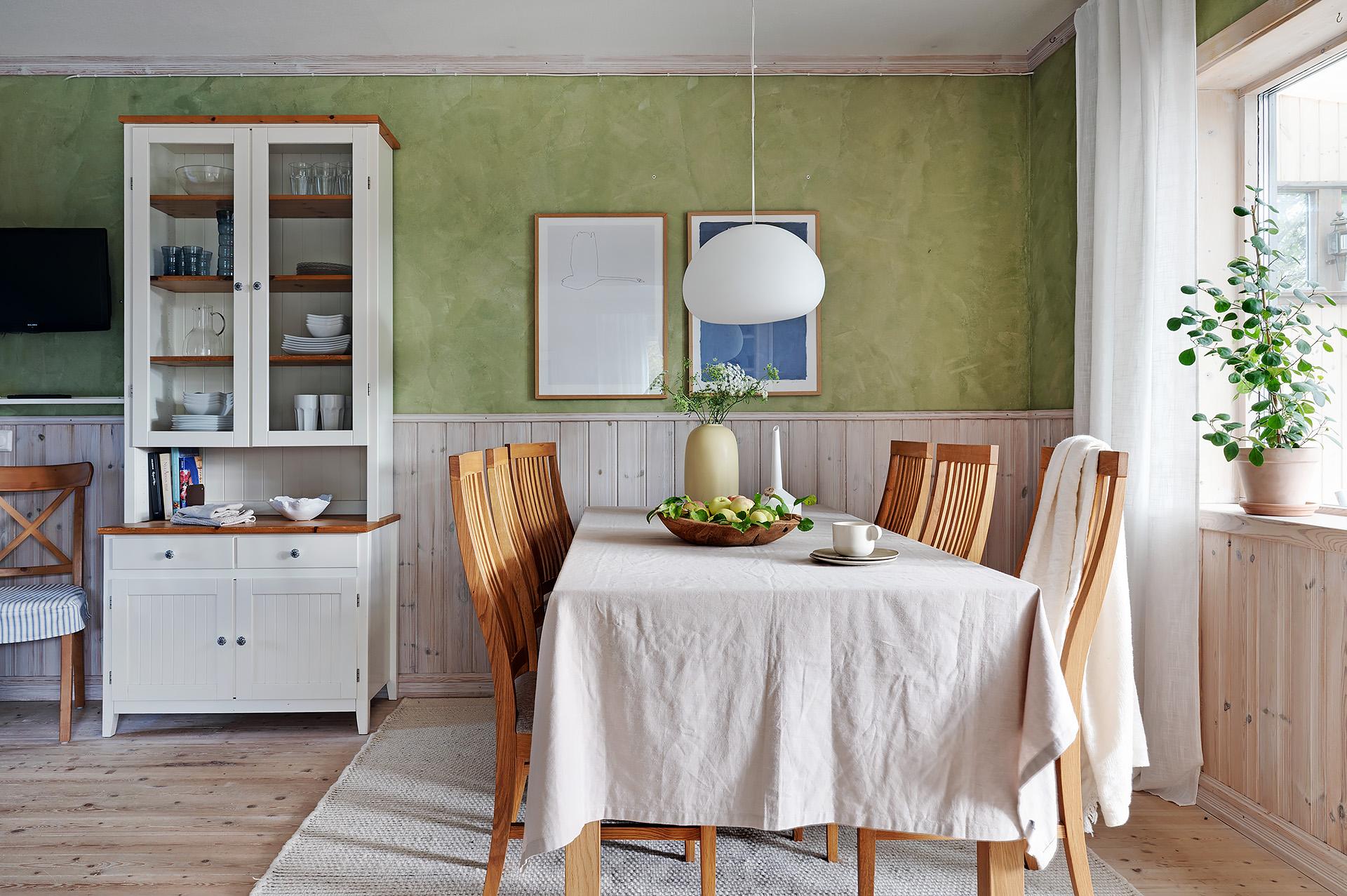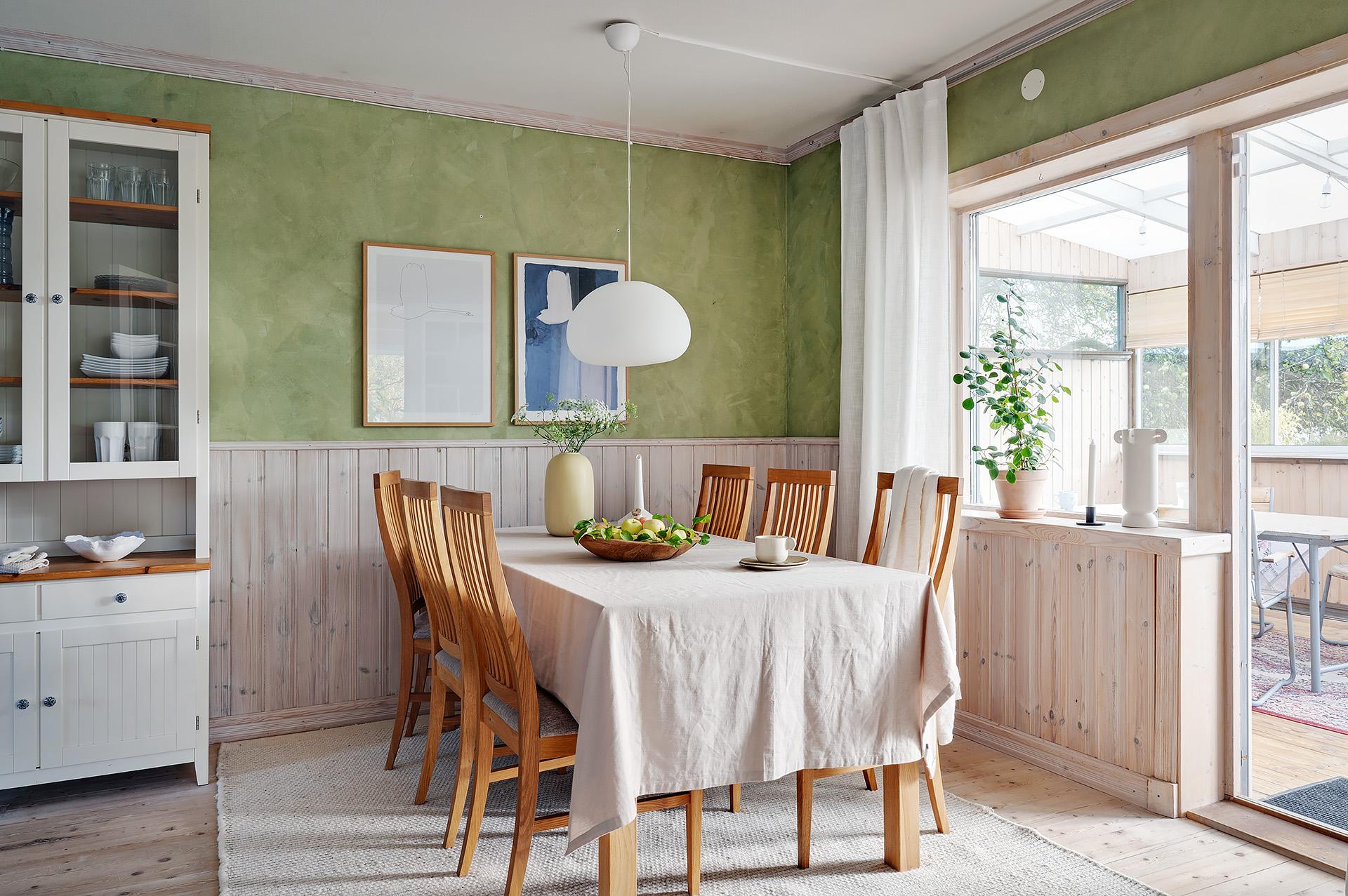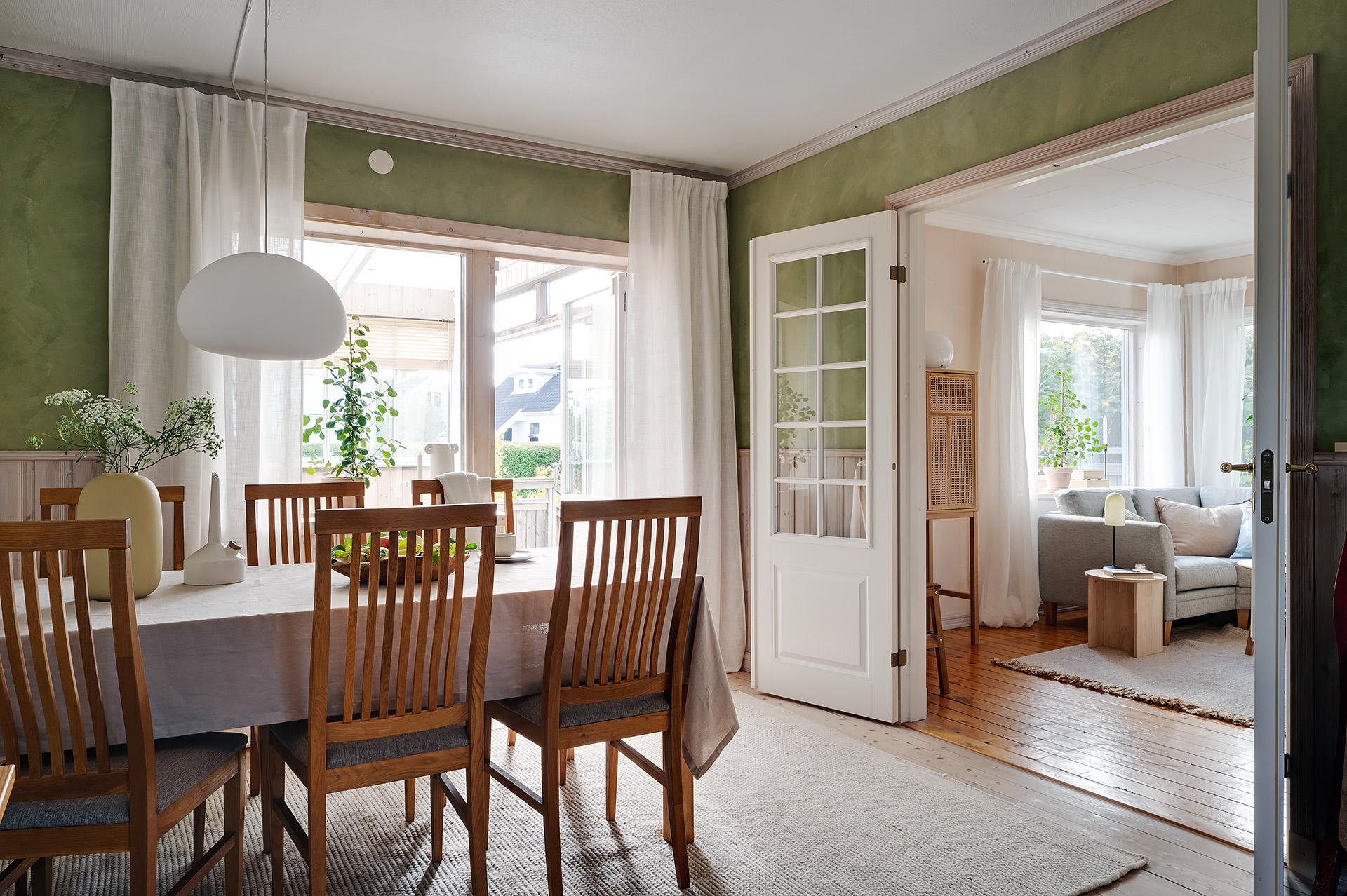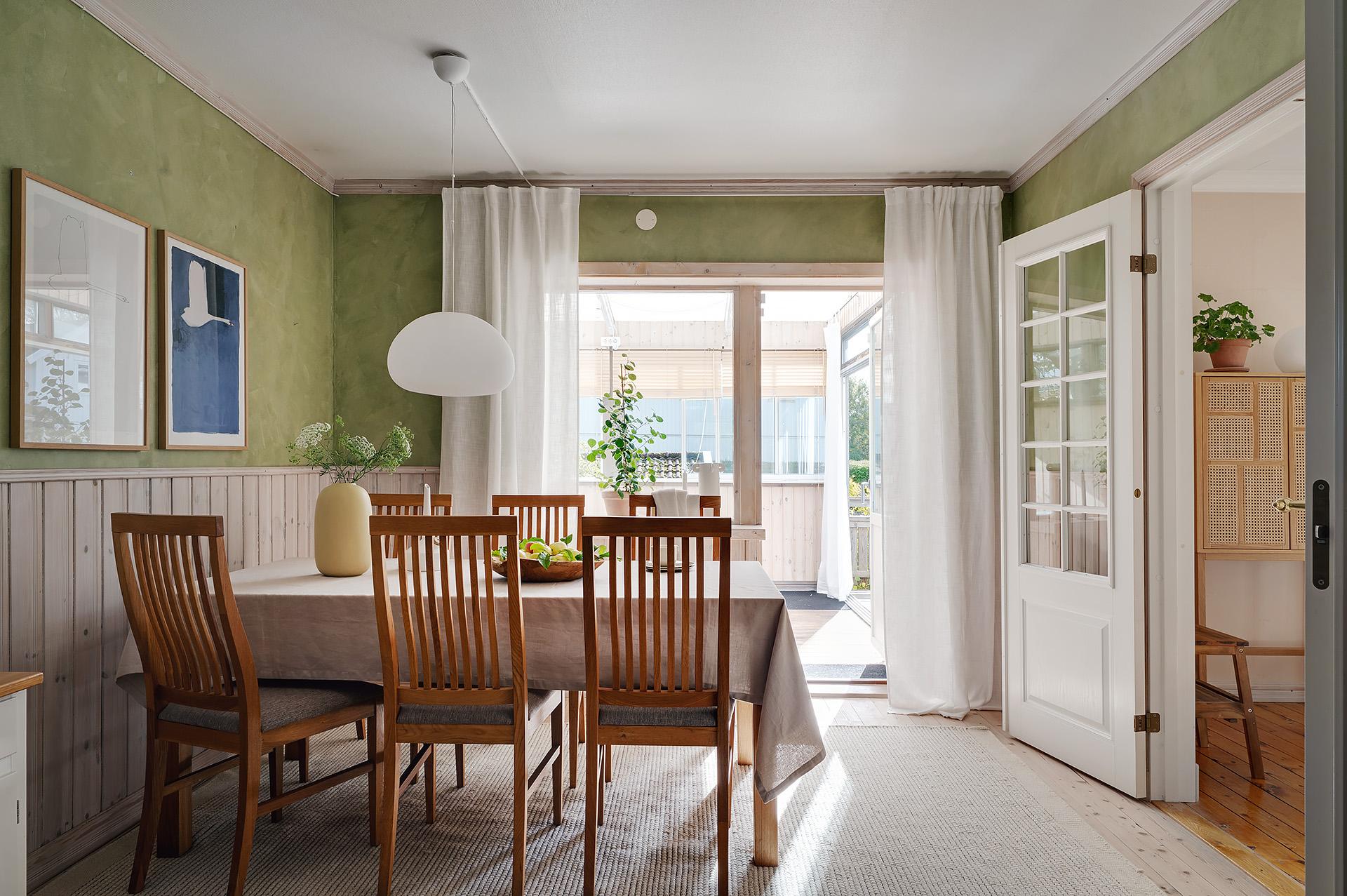 Från vardagsrummet leder parspegeldörrar in till husets matsal med gott om plats för att duka upp till stora middagar med många gäster. Här är väggarna klädda med bröstpanel i ljust trä och tapetserade med grön tapet. Det framtagna brädgolvet är vitpigmenterat.