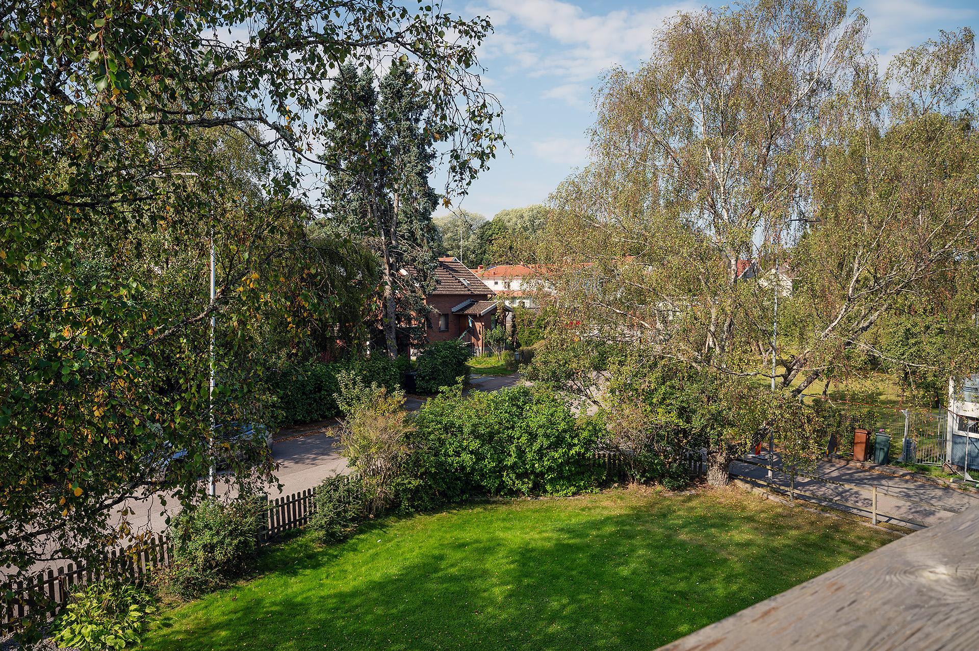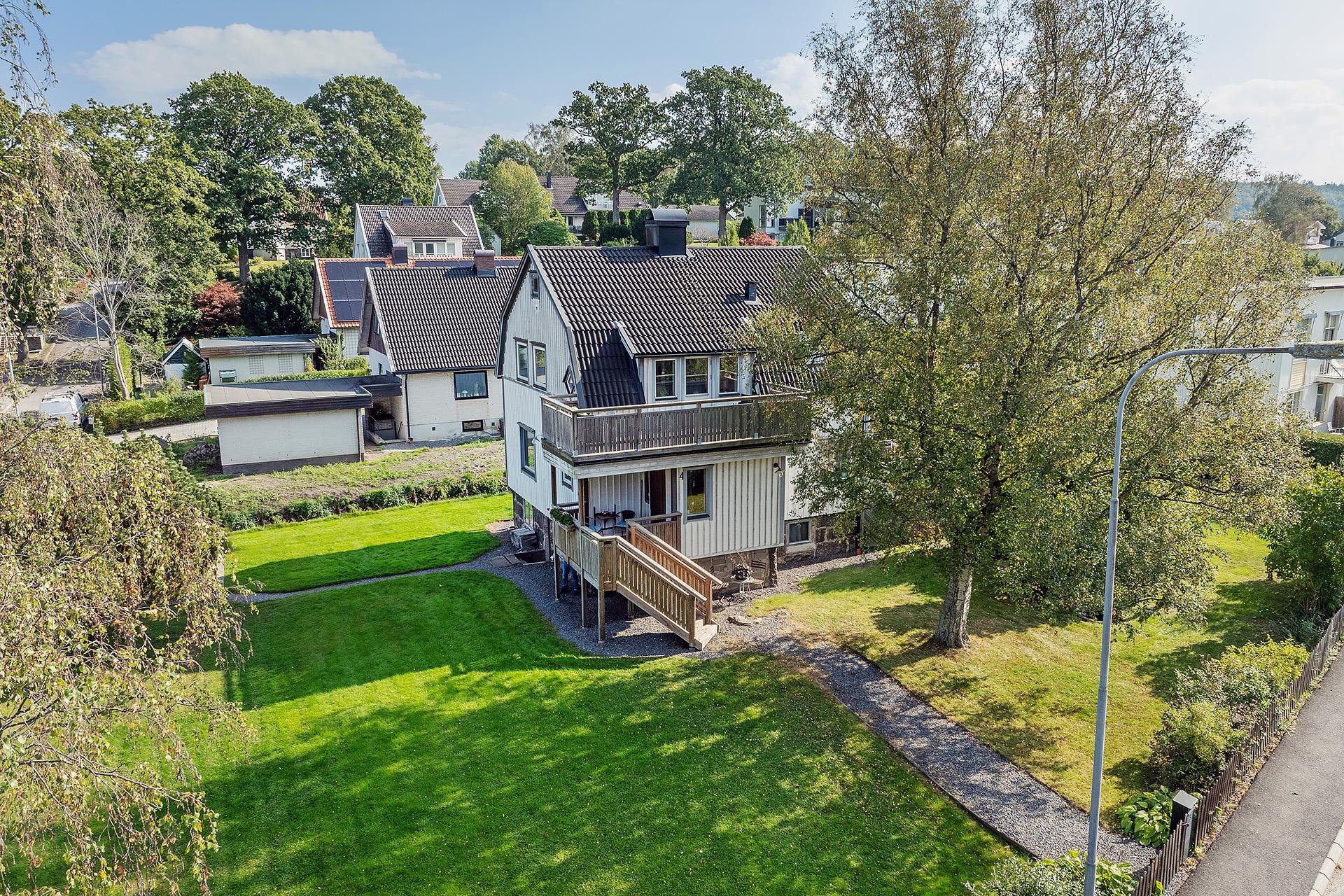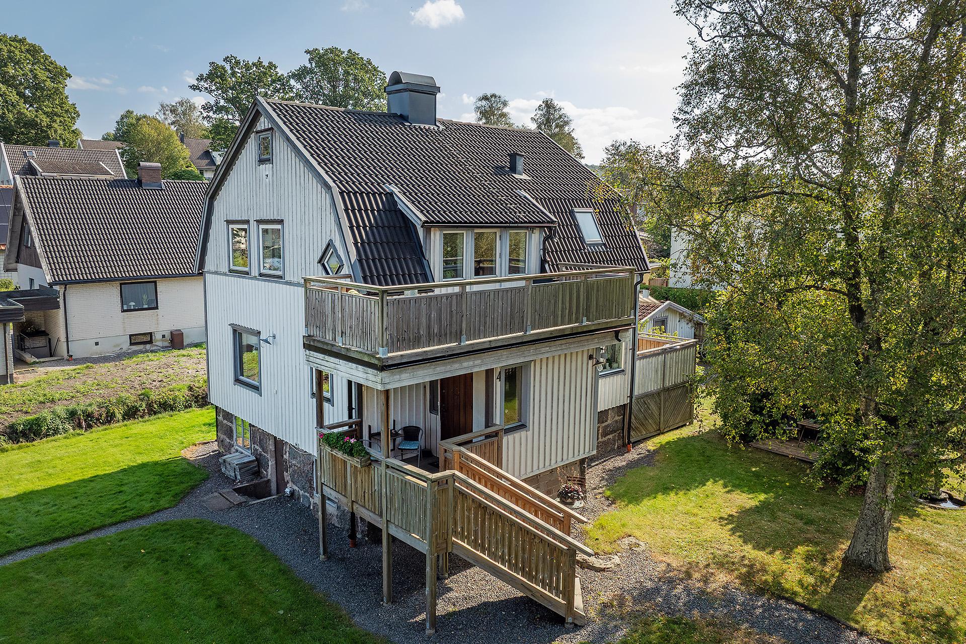 I över hundra år har denna fina villa i nationalromantisk stil vilat på sin vackra naturstensgrund. Det är ett välbyggt hus som tagits väl om hand genom decennierna. Huset bjuder in till umgänge, och på entrévåningen förenas vardagsrummet, matsalen, köket och den välkomnande hallen i en rundgående planlösning. Det finns gott om utrymme för att samla släkt och vänner för middagar, högtidsfirande och kalas, och från tidig vår till sen höst växer sällskapsytan genom uterummet och den soliga altanen intill. Ljuset strömmar in, och mörka höst- och vinterkvällar är det mysigt att elda i vardagsrummets braskamin. Övervåningen är en privat sfär med tre möjliga sovrum, ett smakfullt renoverat badrum och utgång till en solig terrass med intagande vy över takåsarna, trädtopparna och himlen. Källaren, vars stenväggar verkligen får en att känna av historiens vingslag, består av tvättstuga, fjärrvärmerum och allrum.
