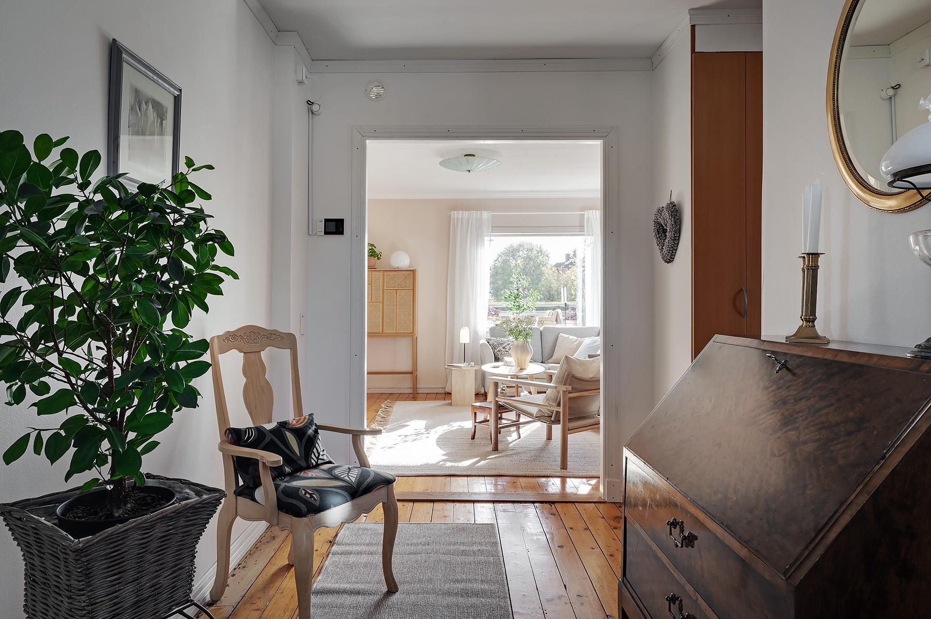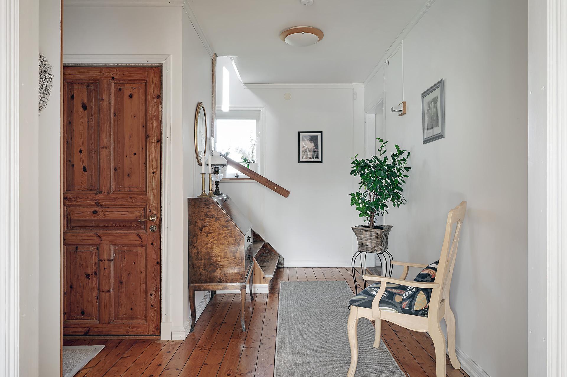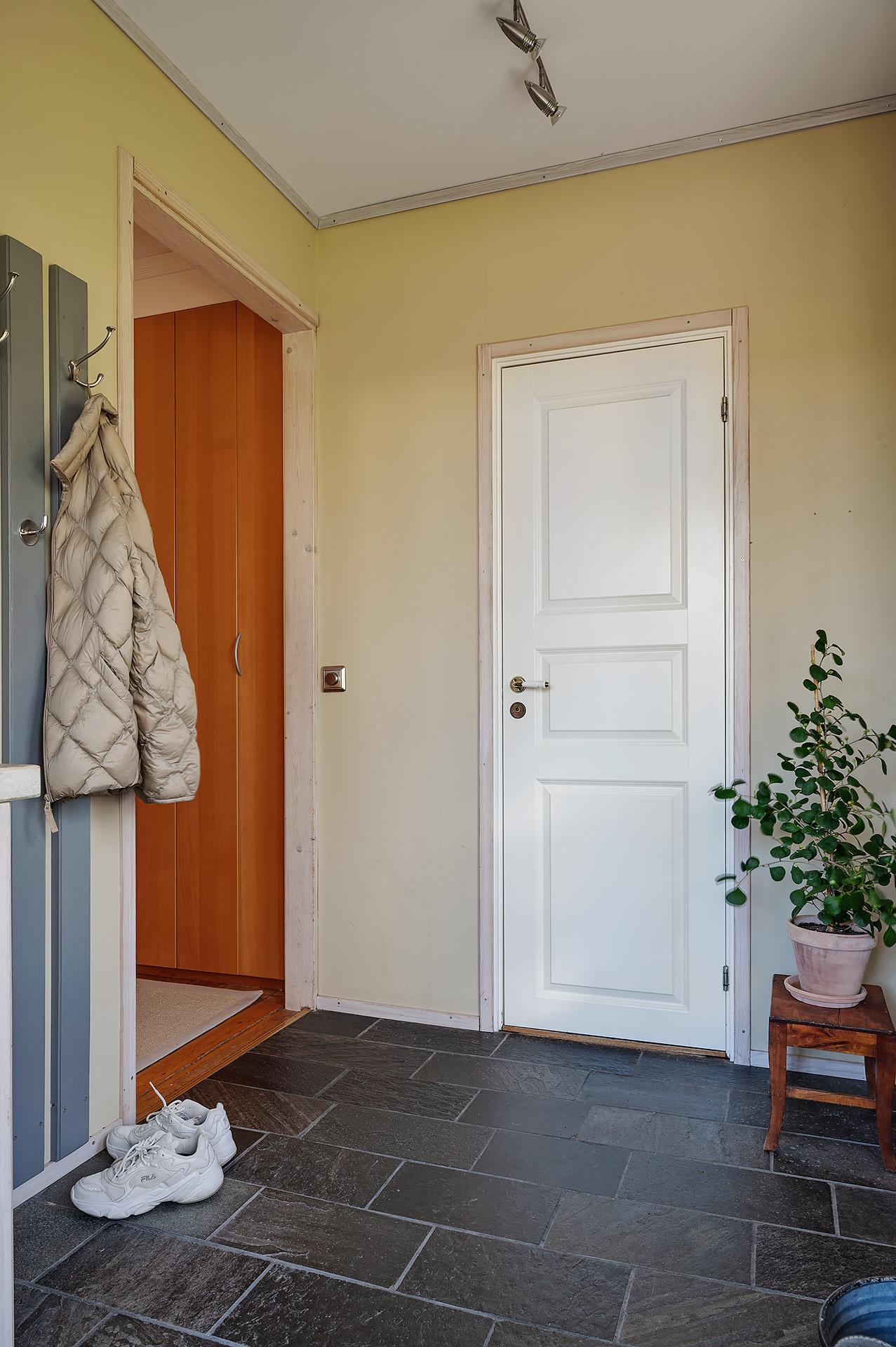 En grusgång genom trädgården leder fram till trappan upp till husets farstukvist med plats för sittmöbler. Innanför ytterdörren väntar en tambur med gott om plats för jackavhängning. Väggarna är ljusmålade och golvet belagt med skifferklinker med golvvärme.