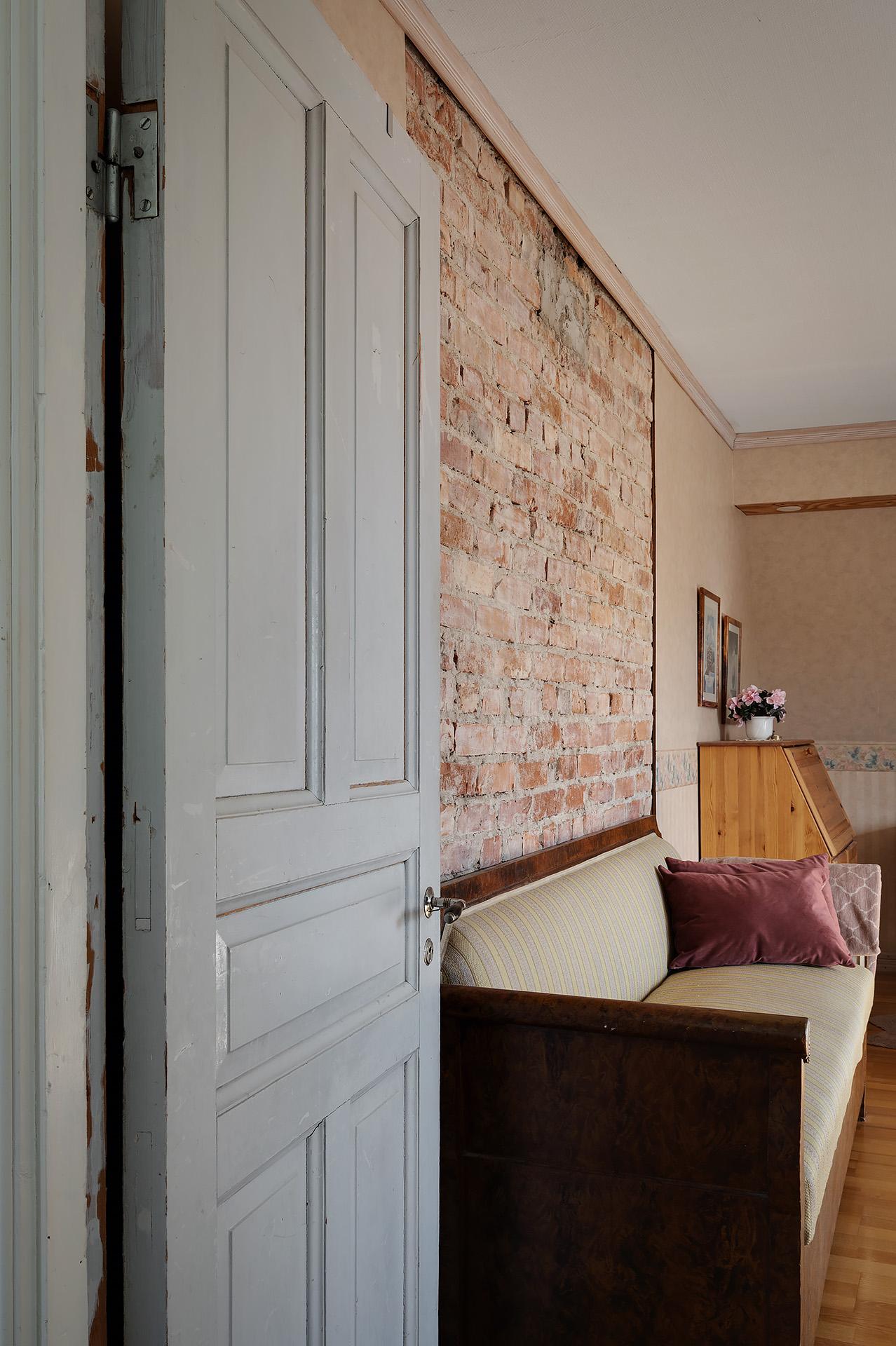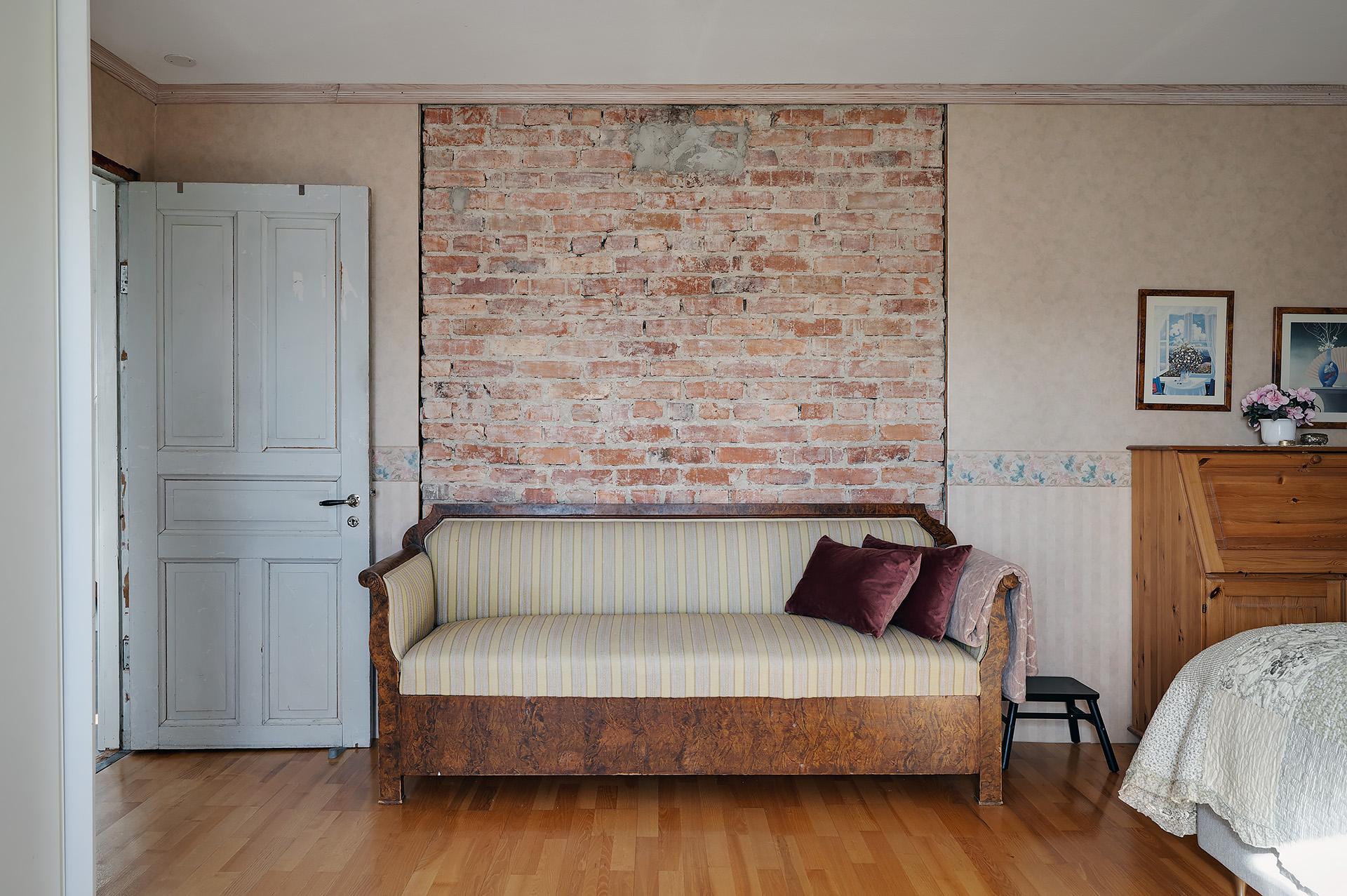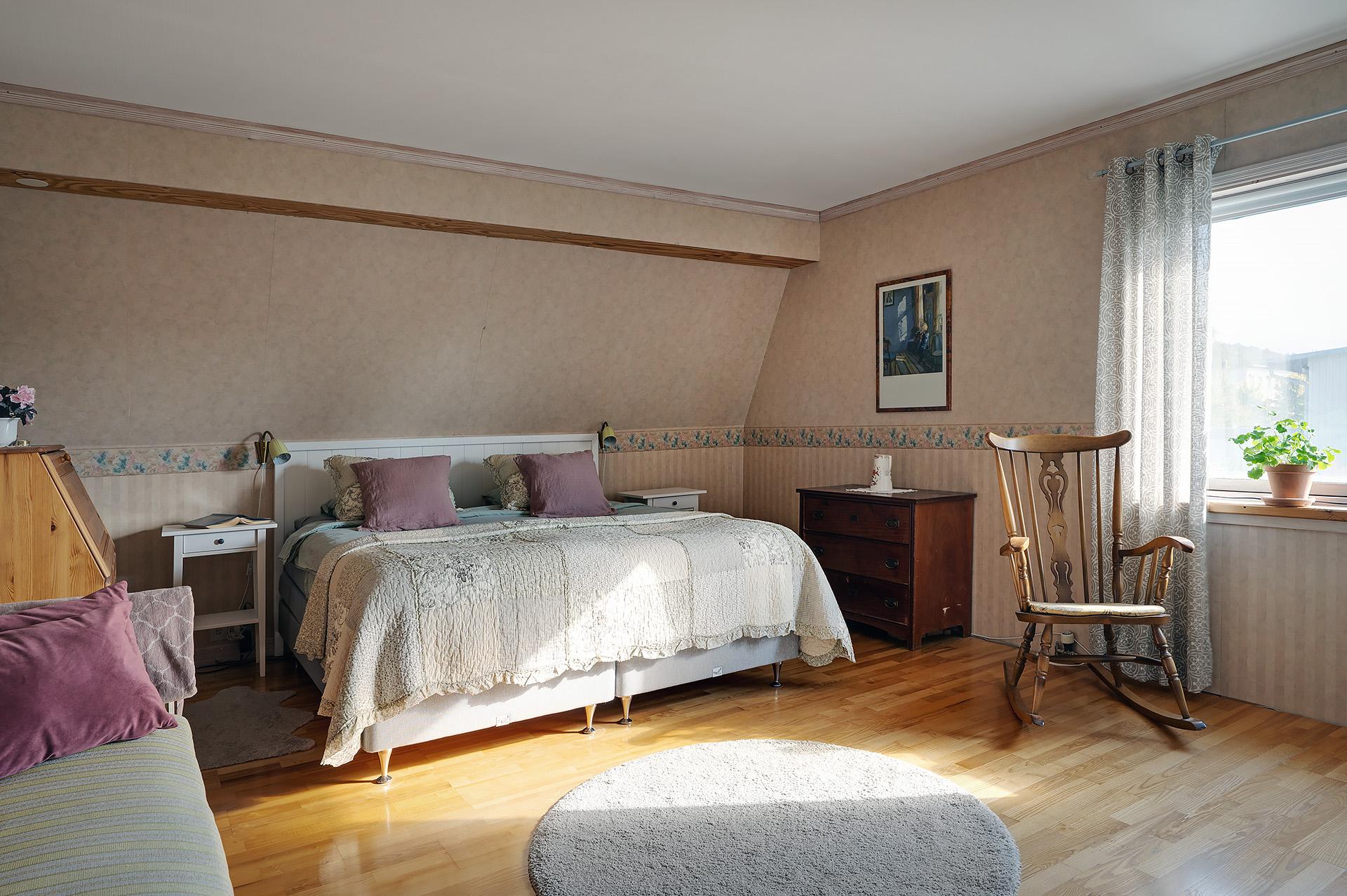 Övervåningens stora sovrum rymmer lätt och ledigt både dubbelsäng och annat möblemang. Dessutom finns förvaringsmöjligheter utöver det vanliga i form av platsbyggda skjutdörrsgarderober som sväljer allt i klädväg. Väggarna är tapetserade med ljus tapet och golvet belagt med parkett. Det frilagda murstocksteglet är ett charmigt inslag.
