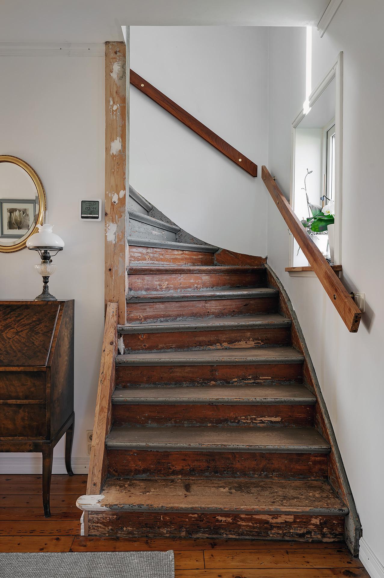 Från hallen leder en rustik originaltrappa upp till ett halvöppet allrum med plats för soffa, tv-bänk, läsfåtölj med mera. Här finns även utgången till husets stora terrass som är helt fantastisk soliga sommarkvällar. Utsikten är intagande, och solnedgångarna magiska.