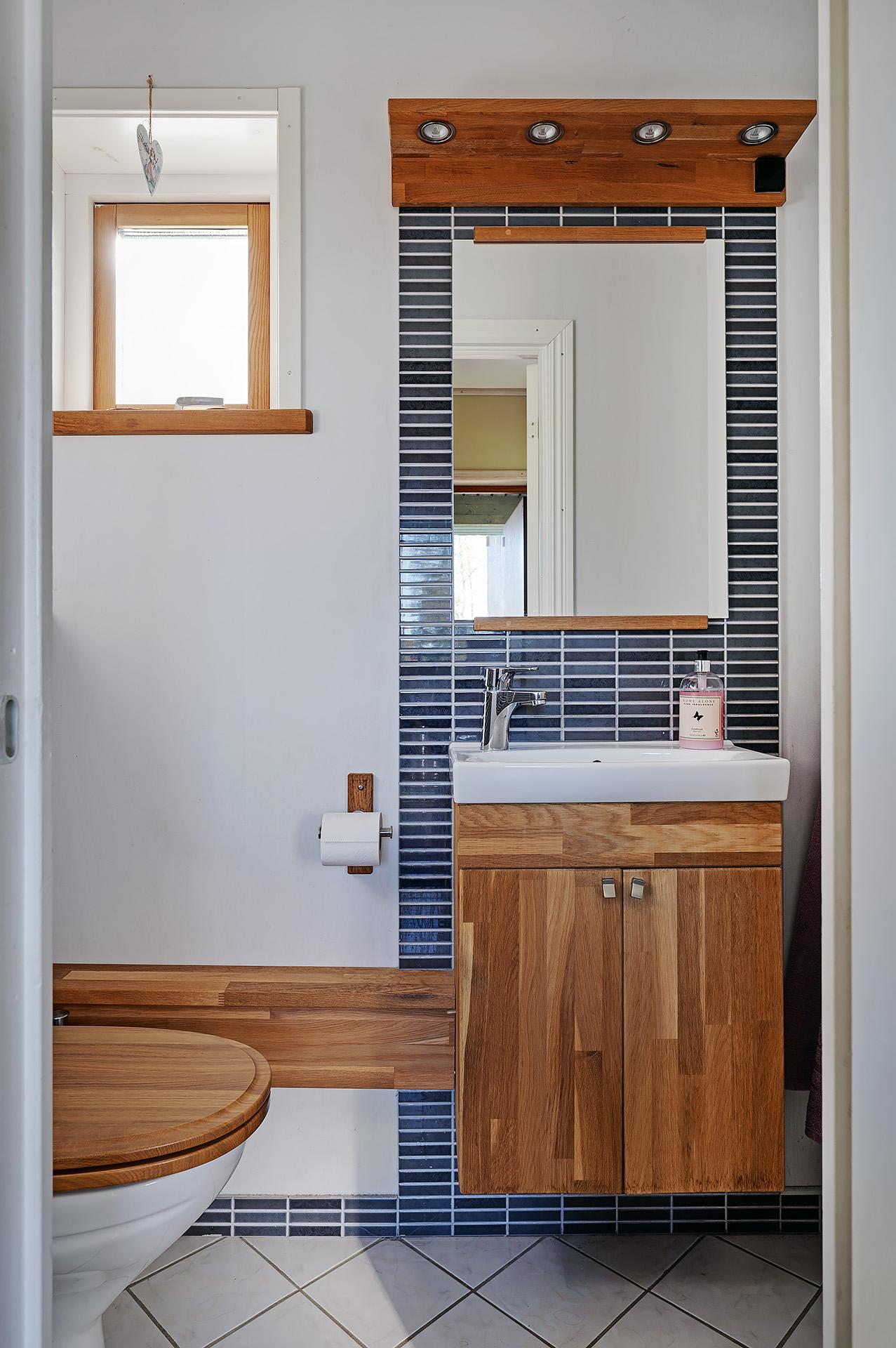 I direkt anslutning till tamburen finns en gästtoalett med handfat och wc. Väggarna är ljusmålade och klädda med stavmosaik i olika grå toner. Golvet är belagt med ljus klinker. Ett vädringsfönster släpper in dagsljus och frisk luft.