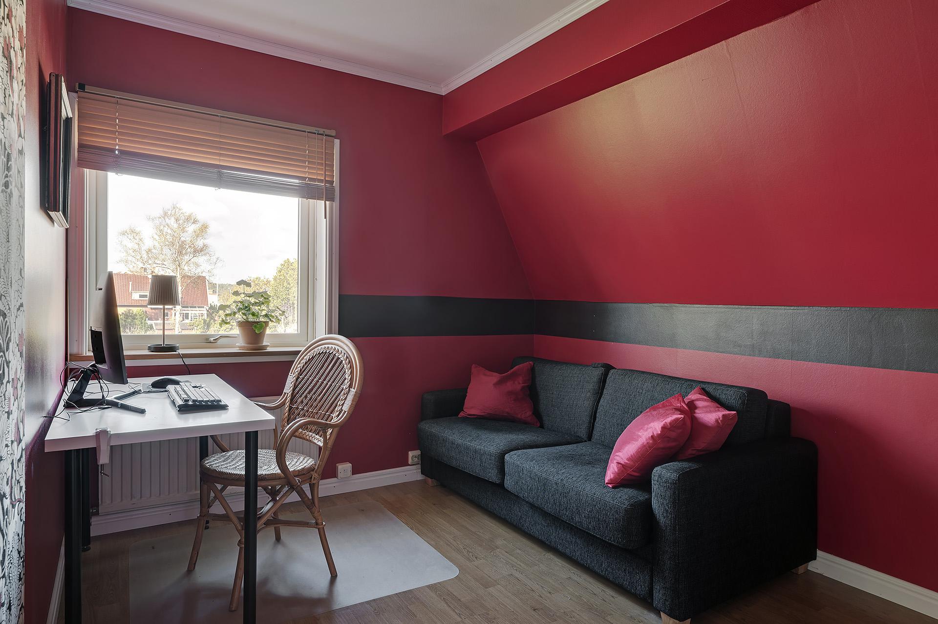 Det mindre sovrummet är ett perfekt barnrum, gästrum eller hemmakontor. Väggarna är rödmålade och golvet belagt med parkett.