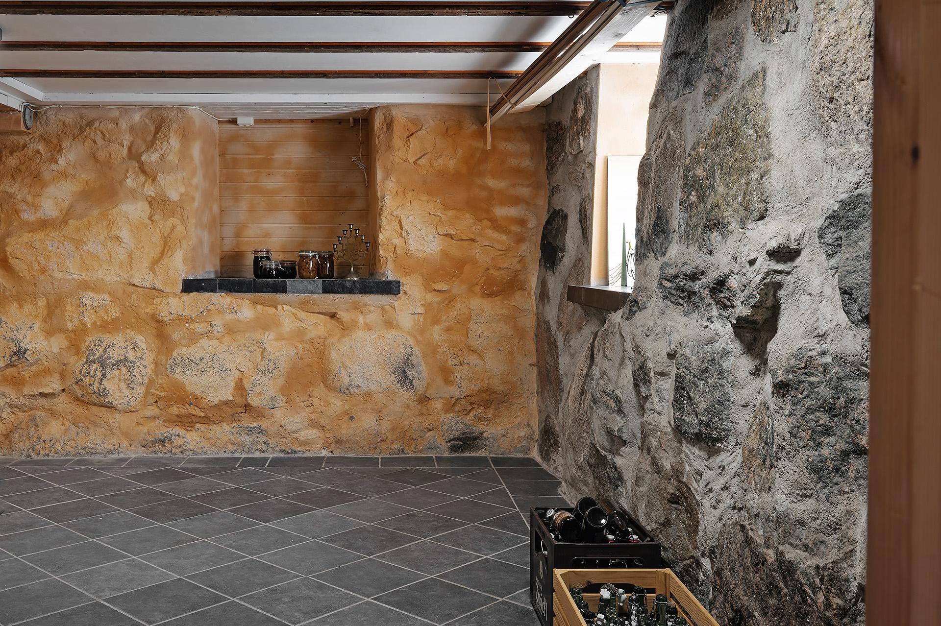 Husets källarvåning består av hall, allrum, tvättstuga och ett fjärrvärmerum som även kan användas som förråd. Tvättstugan är utrustad med både tvättmaskin och torktumlare. Naturstensväggarna ger en rustik känsla, och i allrummet är golvet belagt med grafitgrå klinker med golvvärme.
