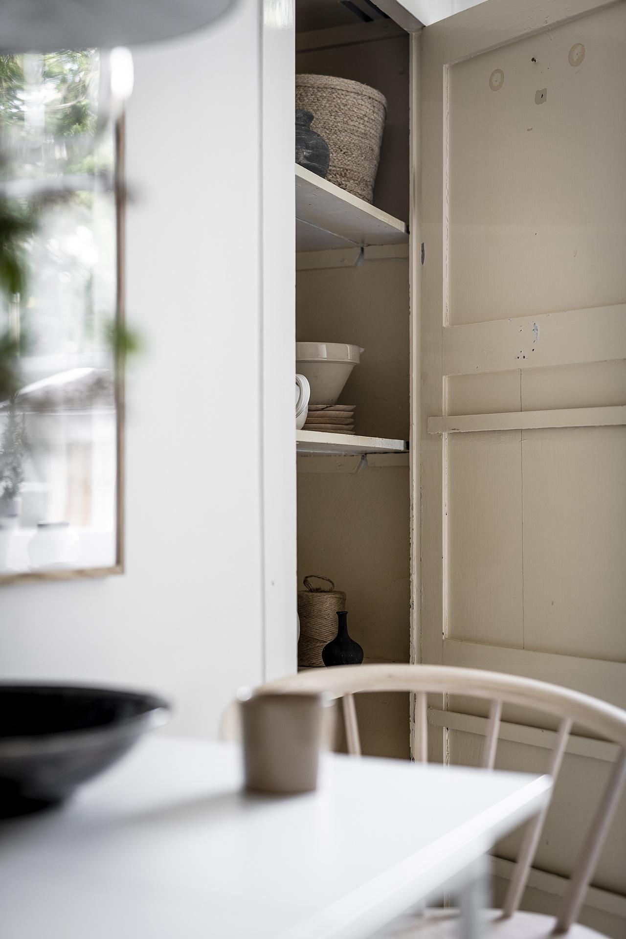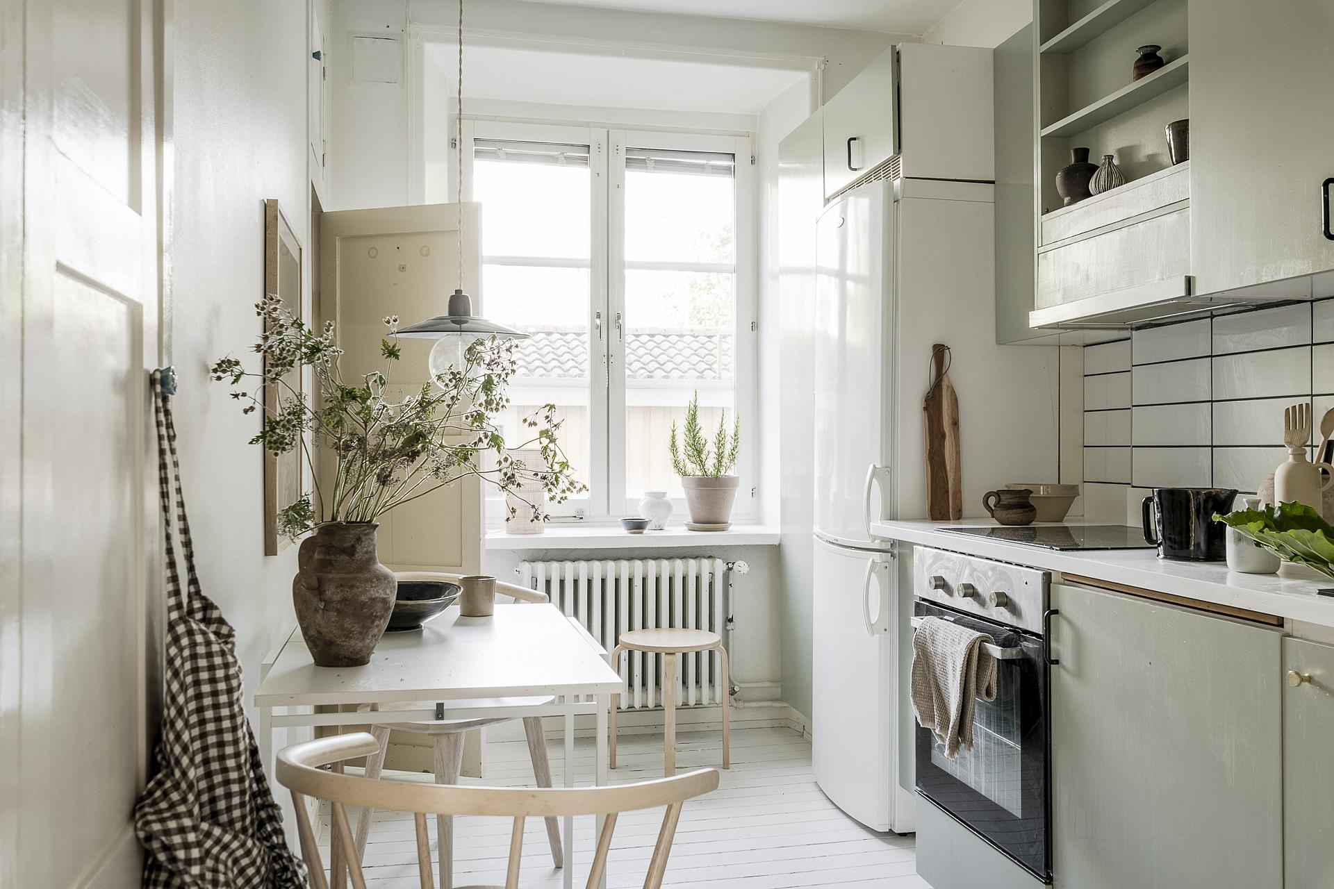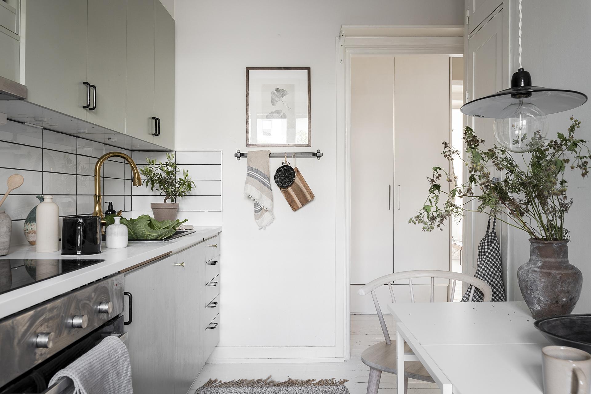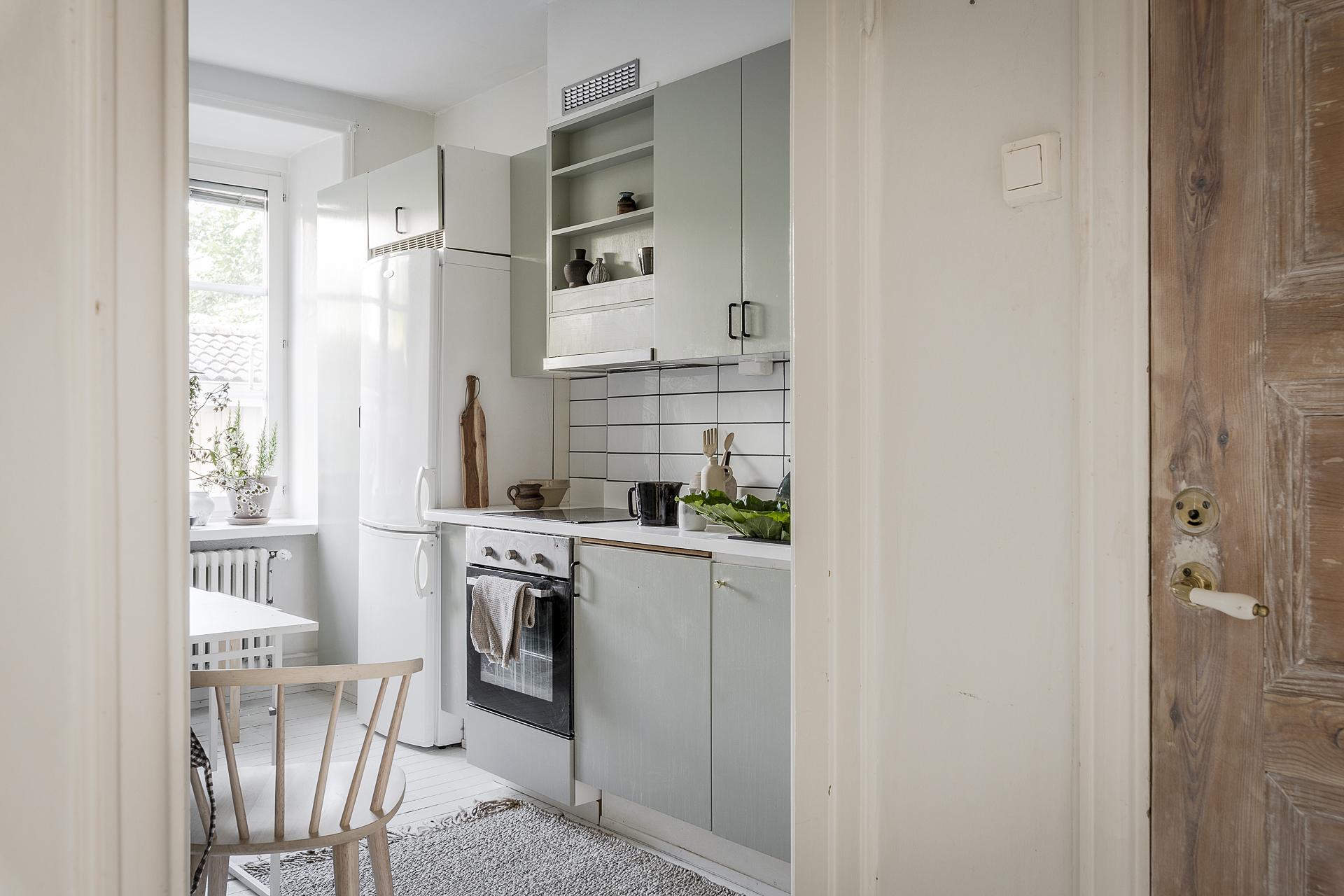 Köket är av bra storlek, med gott om plats för matlagning. Det är fräscht, med dovt gröna luckor, vit bänkskiva, och vitt kakel som stänkskydd. Här finns naturlig yta för ett matbord, och bevarade skafferier erbjuder massor av förvaring. Den maskinella utrustningen består av kyl/frys, spishäll, inbyggnadsugn, och diskmaskin. Köket vetter mot den mysiga gården, så på sommaren när man vill grilla eller äta ute är det smidigt att langa ut porslin och annat genom fönstret. Det framtagna brädgolvet är målat i vitt, precis som väggarna.