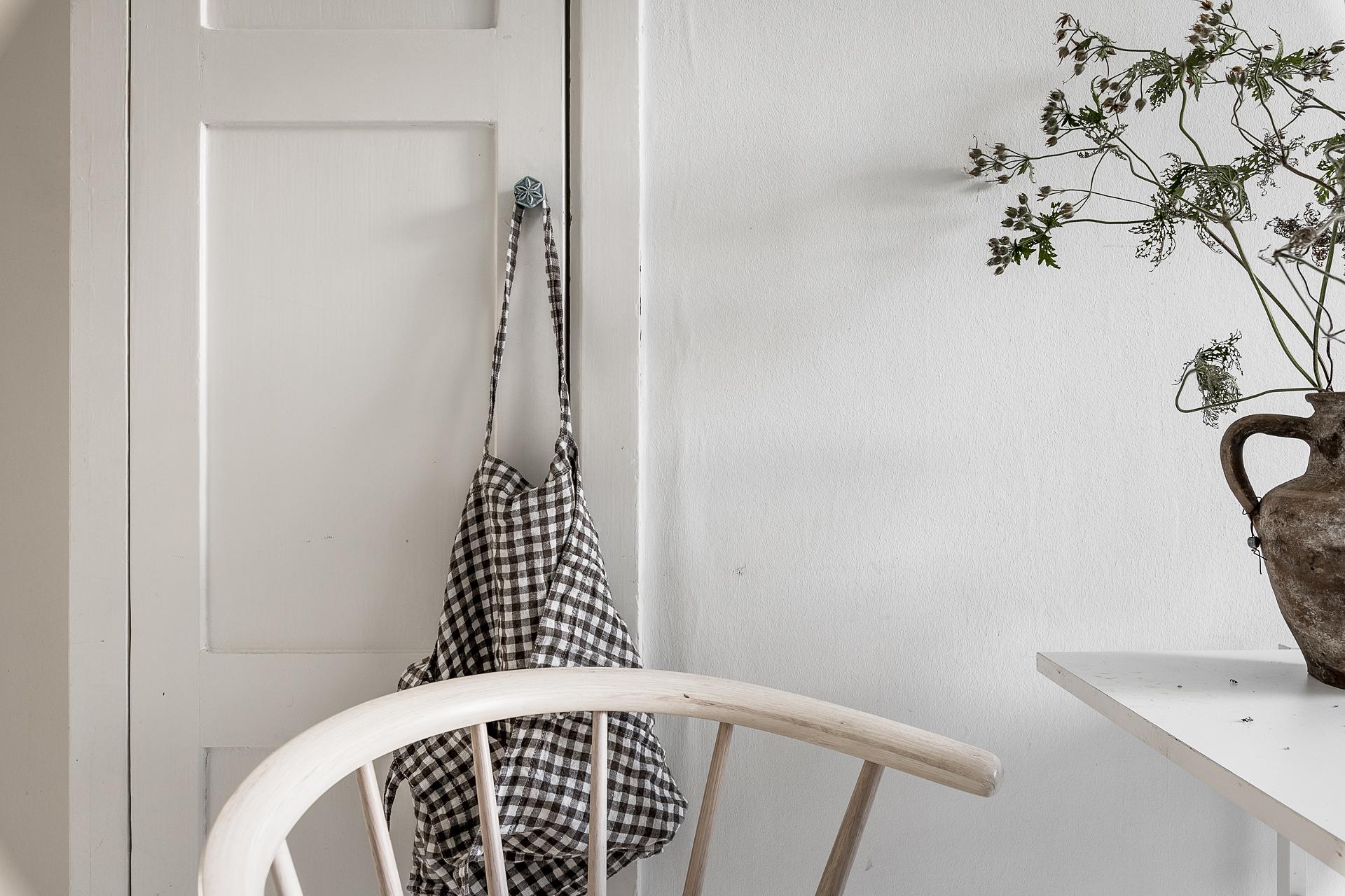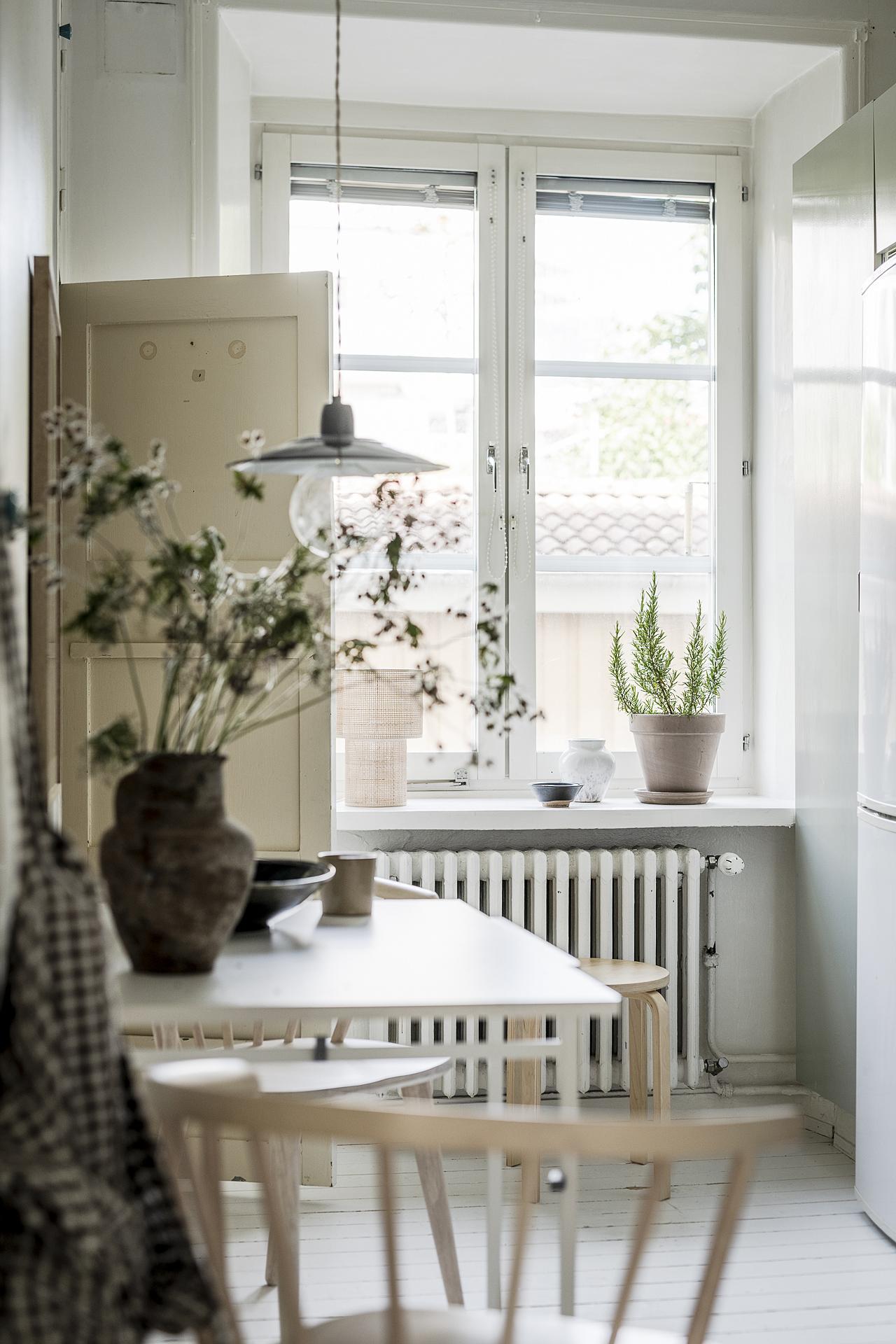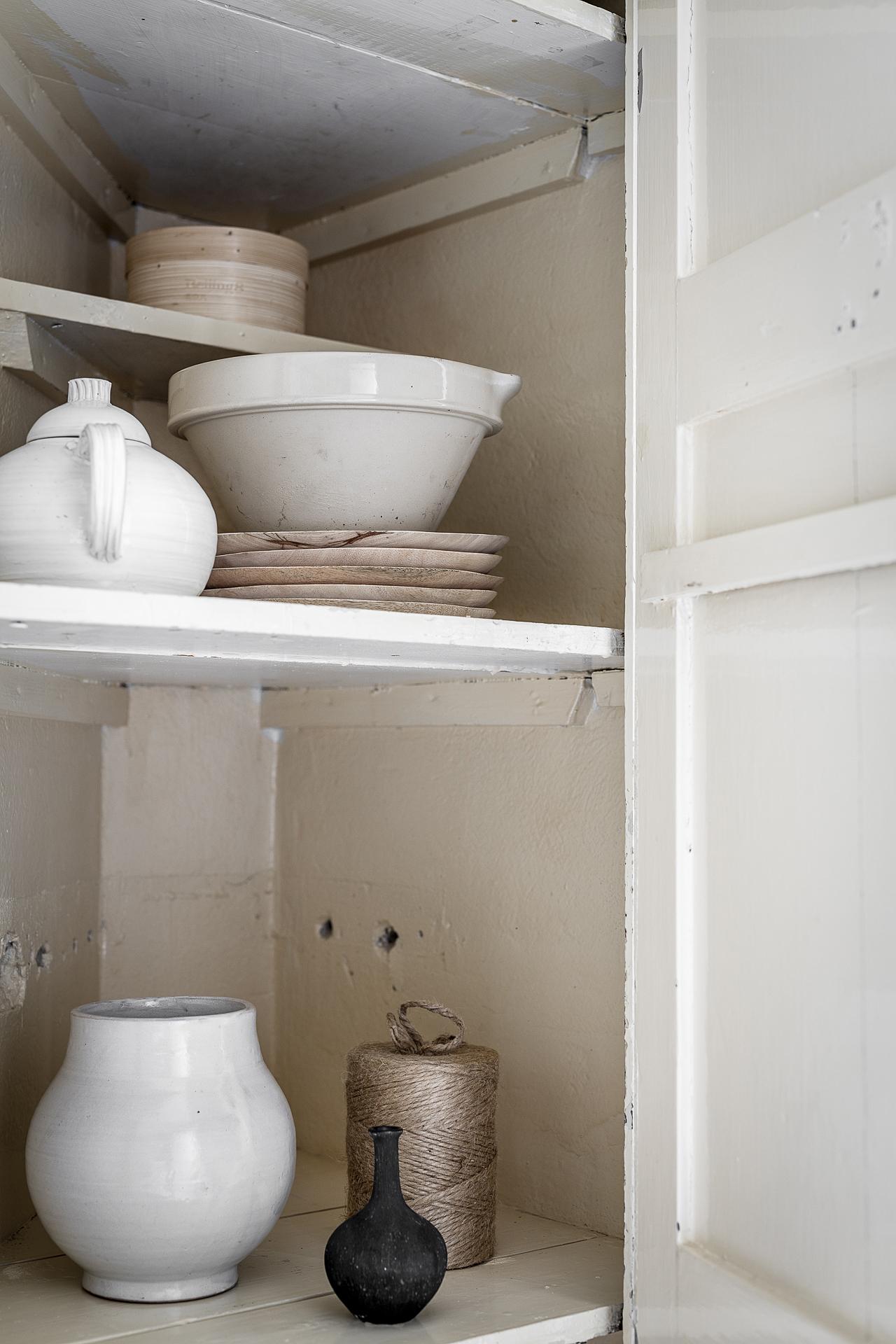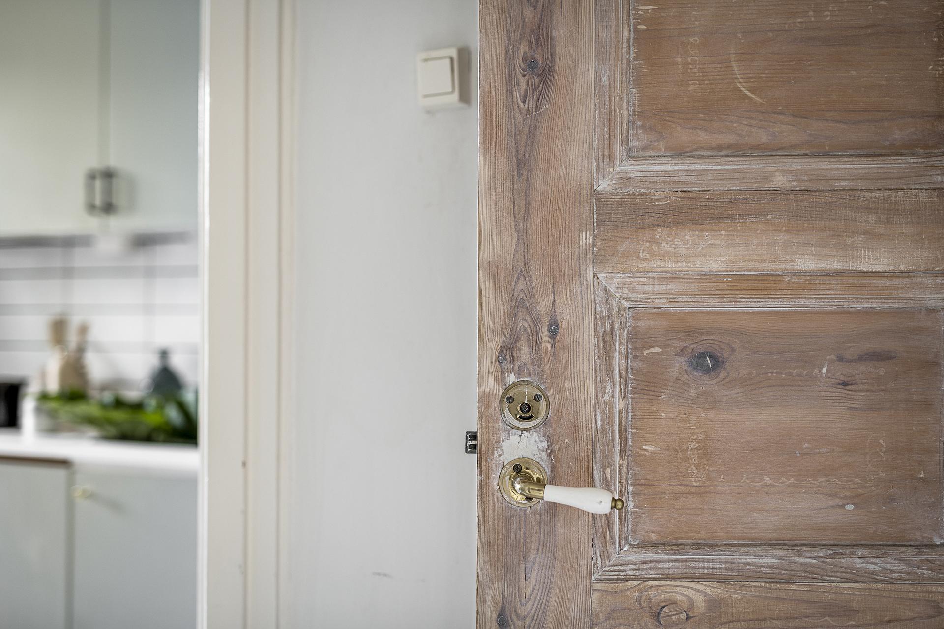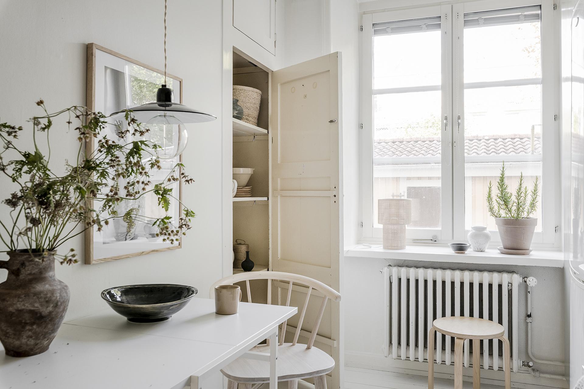 Köket är av bra storlek, med gott om plats för matlagning. Det är fräscht, med dovt gröna luckor, vit bänkskiva, och vitt kakel som stänkskydd. Här finns naturlig yta för ett matbord, och bevarade skafferier erbjuder massor av förvaring. Den maskinella utrustningen består av kyl/frys, spishäll, inbyggnadsugn, och diskmaskin. Köket vetter mot den mysiga gården, så på sommaren när man vill grilla eller äta ute är det smidigt att langa ut porslin och annat genom fönstret. Det framtagna brädgolvet är målat i vitt, precis som väggarna.