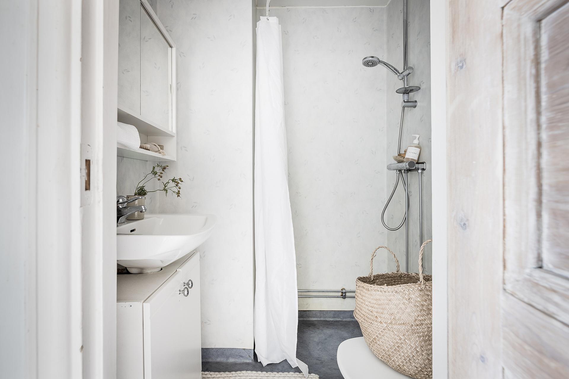 Yteffektivt badrum med duschhörna, handfat, kommod, spegelskåp, och handdukstork. Väggarna är klädda med en ljusblå våtrumstapet, och golvet är belagt med en blå våtrumsmatta.