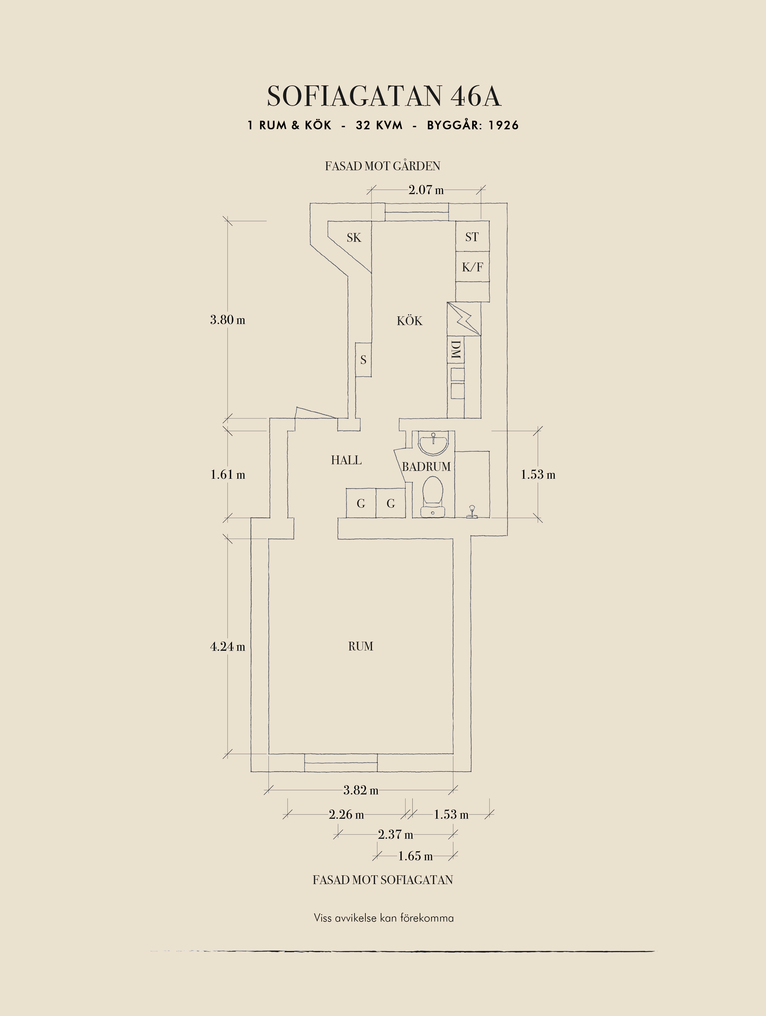 På första våningen, men ändå med högt och ostört läge mot Sofiagatan, ligger den här hemtrevliga ettan. Det är en klassisk landshövdingsetta, där känslan är att det är lätt att finna sig tillrätta och trivas. Hemmet är charmigt inramat av bevarade 20-talsdetaljer, såsom brädgolv, kallskafferi, gjutjärnsradiatorer, spegeldörrar och listverk. Hög takhöjd och stort ljusinsläpp från höga fönster ger bostaden en luftig känsla. Tack vare att man bor i husets murade del är väggarna maffiga, och fönsternischerna är djupa med sittvänliga fönsterbrädor. Läget på husets nedre plan gör att man får en fin kontakt med utemiljön, som är något alldeles extra.