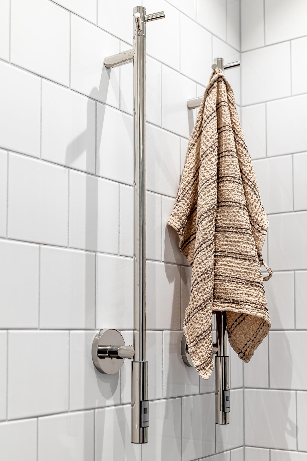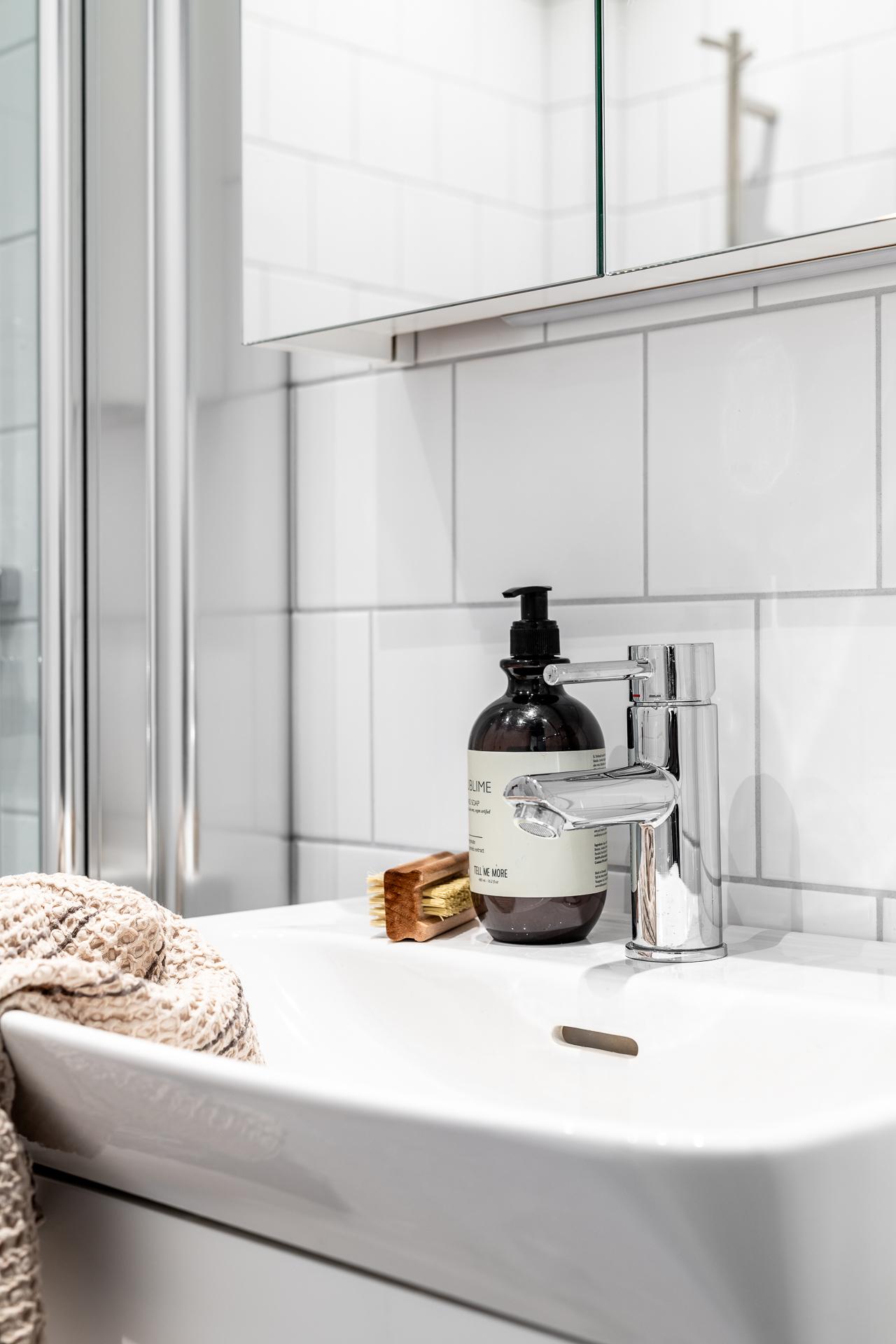 Badrummet inrymmer duschhörna, dubbla elektriska handdukstorkar, tvättkommod, spegelskåp och toalett. Möblemanget kommer från Svedbergs, och handfatsblandaren från Tapwell. Duschhörnan, som skärmas av med infällbara glasdörrar, är utrustad med takduscharmatur från Inr. Väggarna är klädda med vitt kakel i halvförband, och golvet belagt med vacker naturstensliknande klinker från italienska Marazzi. Den elburna golvvärmen gör gott för morgonkalla fötter.