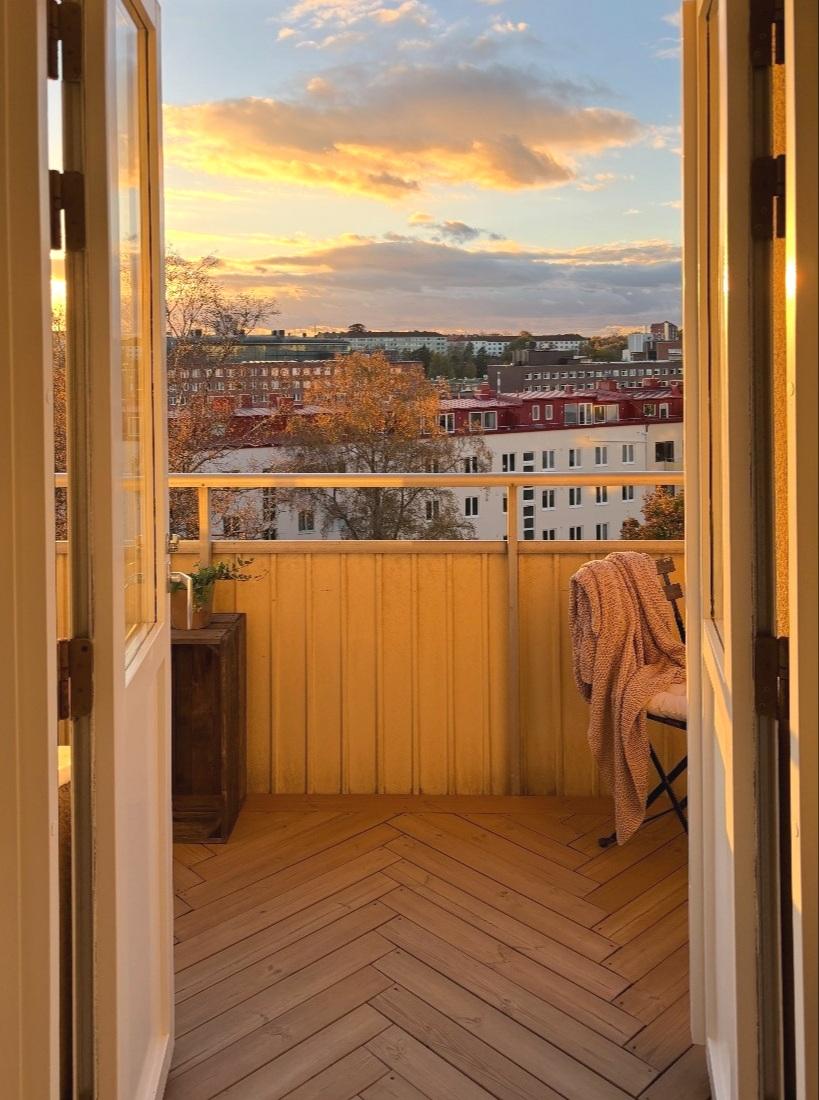Vardagsrummet är lättmöblerat, och det finns utrymme för både soffa och matgrupp, Sommartid är det trevligt att sitta och äta, umgås eller bara koppla av ute på balkongen med platsbyggda sittbänkar och fin golvtrall i fiskbensläggning. Solen är framme från tidig eftermiddag till sen kväll, och ett glas vin med solnedgången bakom Landala Egnahems landshövdingehus som kuliss sätter verkligen guldkant på tillvaron. Golvet är belagt med mattlackad fiskbensparkett från Ekebo och den svala vita väggfärgen ”Sommarsnö” från Jotun ger rummet en varm och ombonad känsla när ljuset faller in.