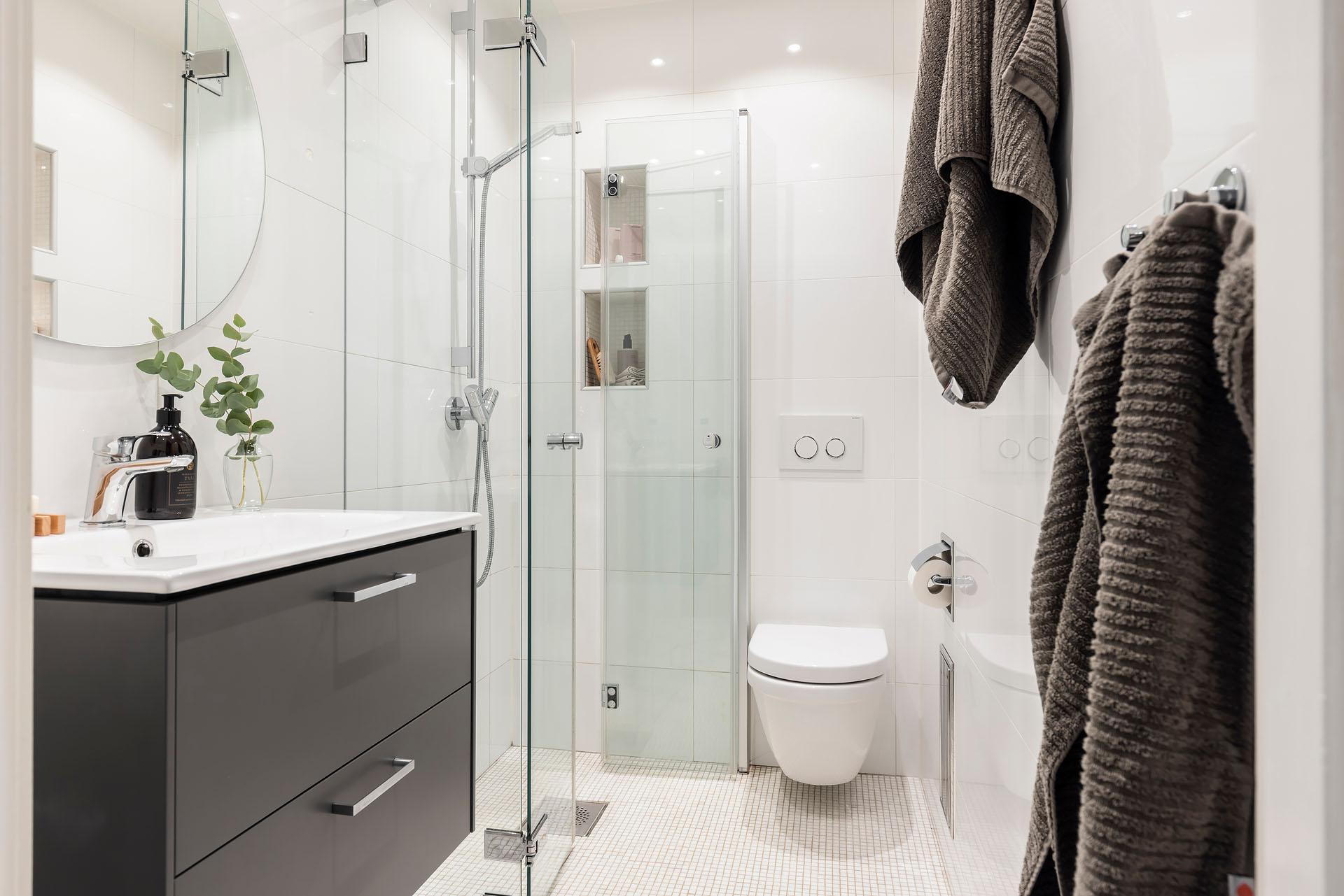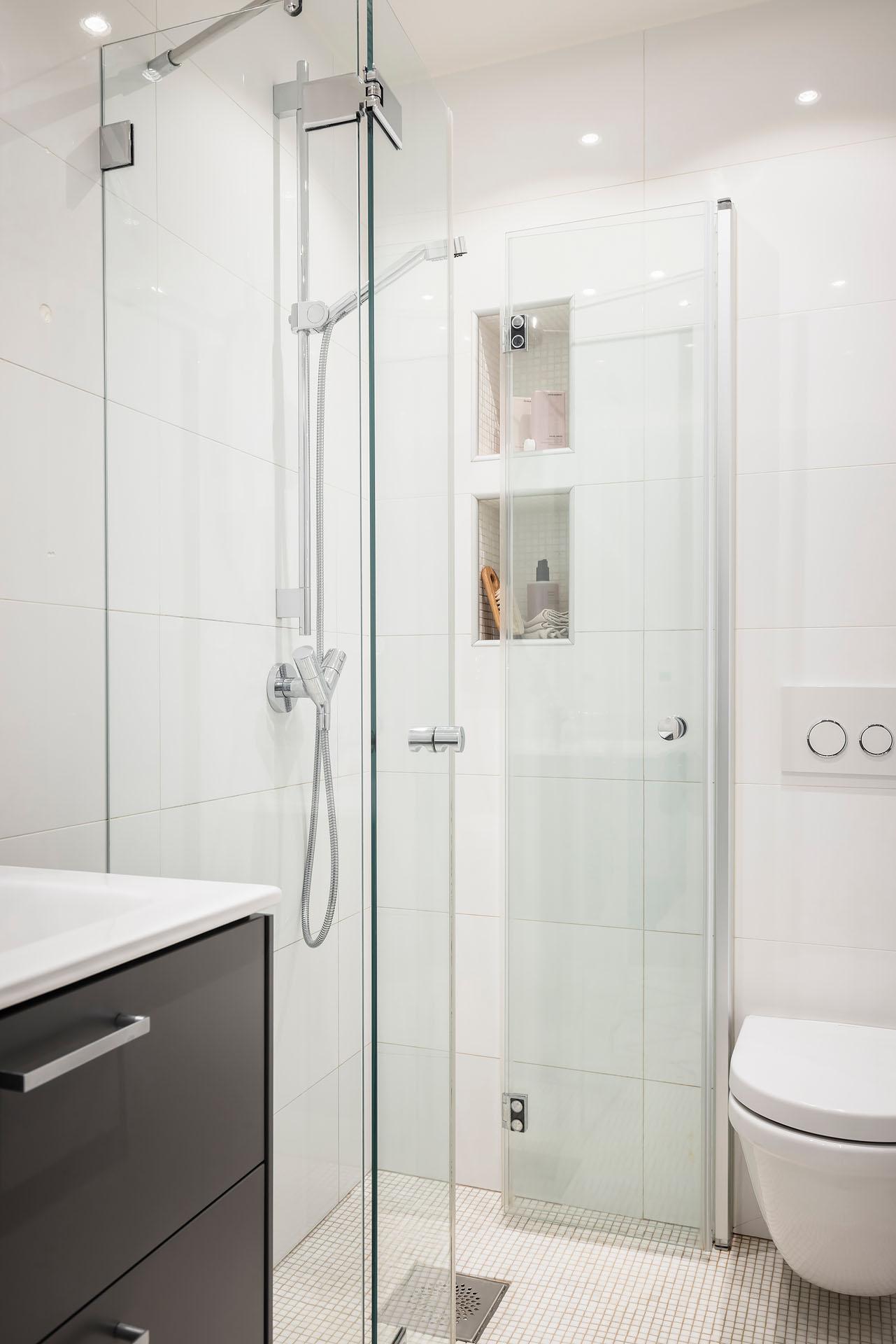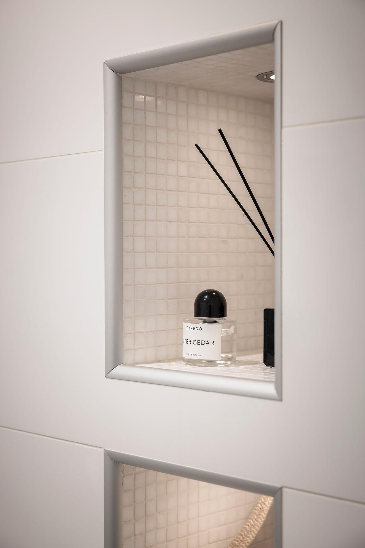 Badrummet inrymmer duschhörna, tvättkommod och vägghängd toalett. Kommoden kommer från Studio Nord och sattes in 2024. Väggarna är helkaklade i vitt och golvet belagt med ljusgrå mosaik. Nischerna med inbyggd belysning är ett stilfullt inslag.
