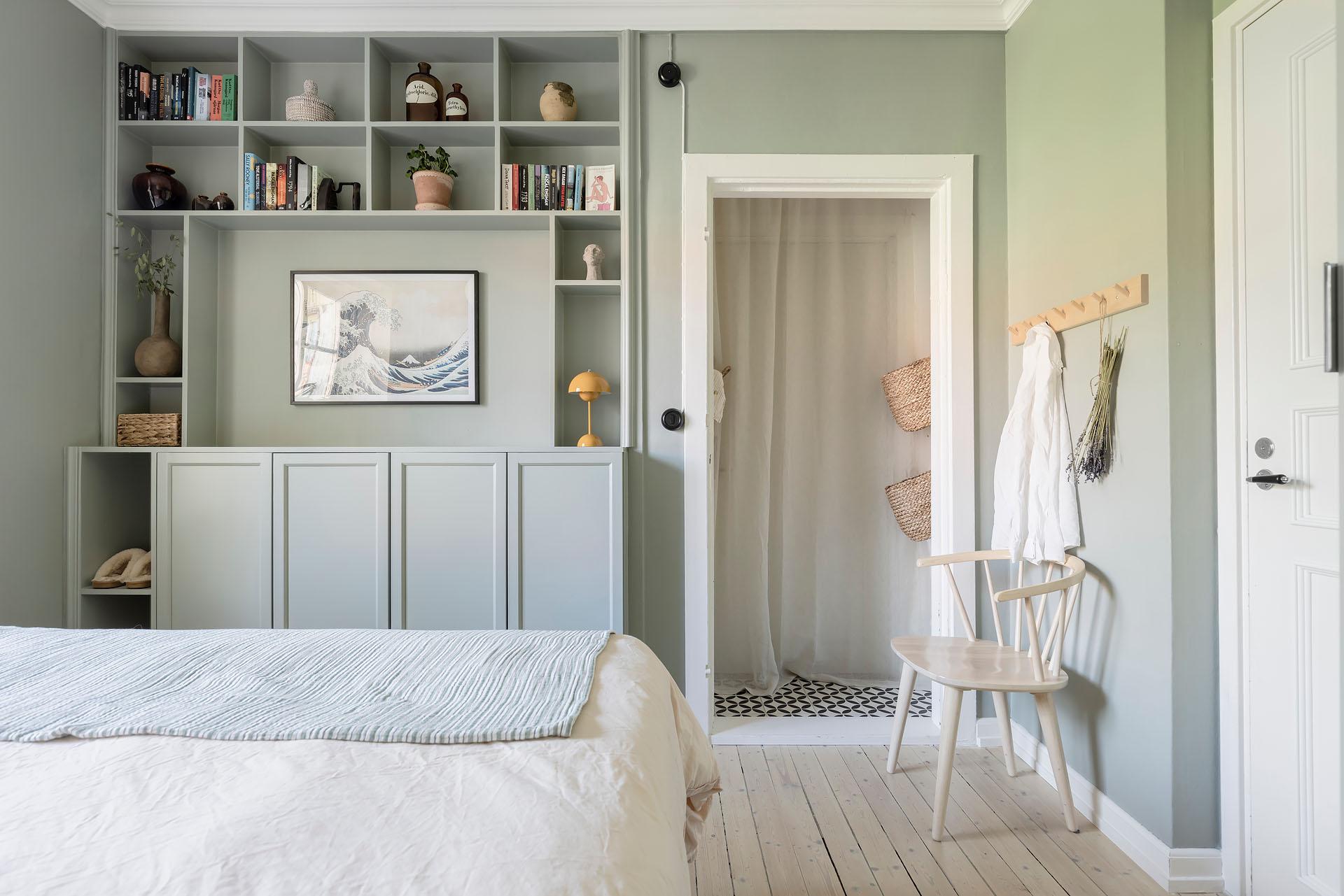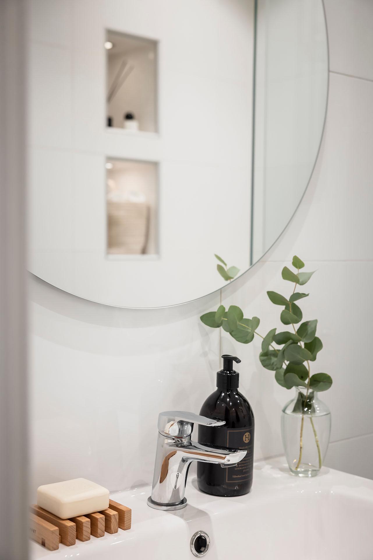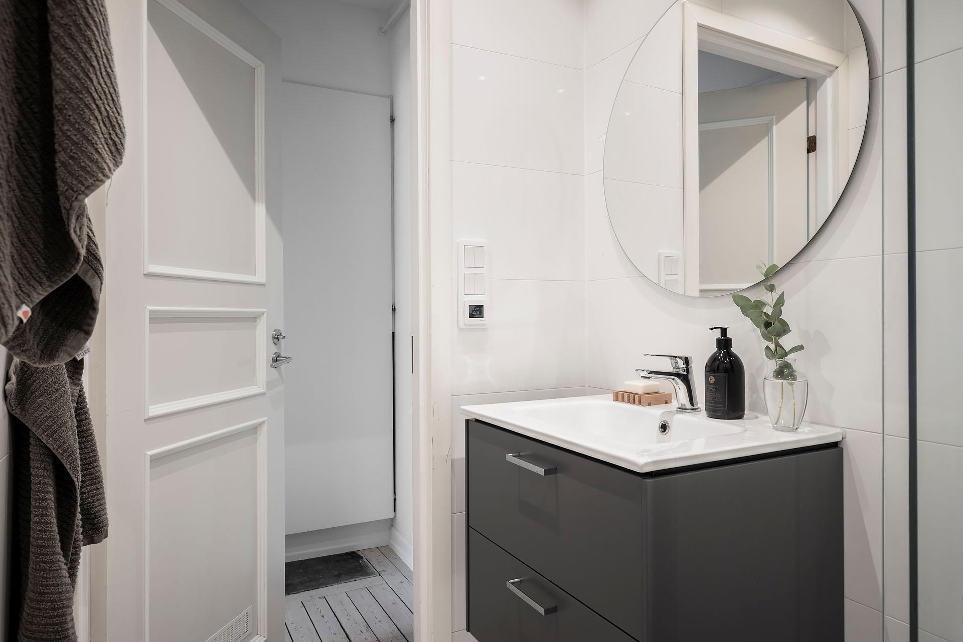 Badrummet inrymmer duschhörna, tvättkommod och vägghängd toalett. Kommoden kommer från Studio Nord och sattes in 2024. Väggarna är helkaklade i vitt och golvet belagt med ljusgrå mosaik. Nischerna med inbyggd belysning är ett stilfullt inslag.