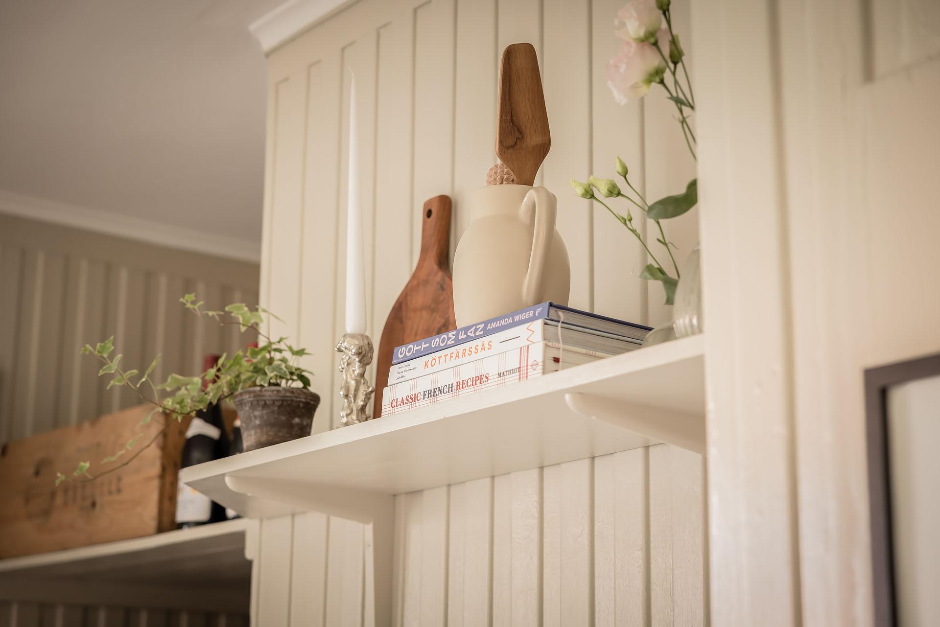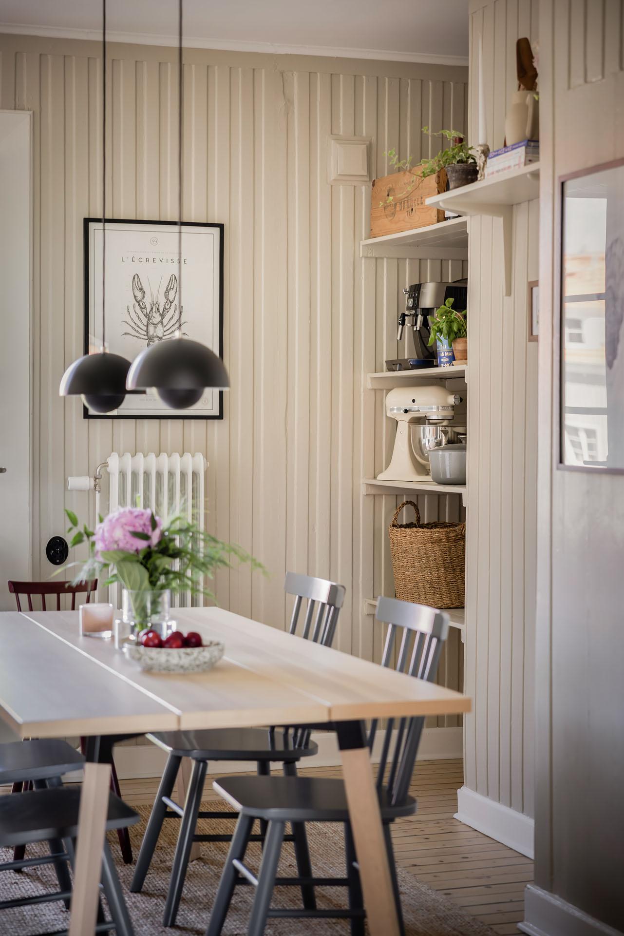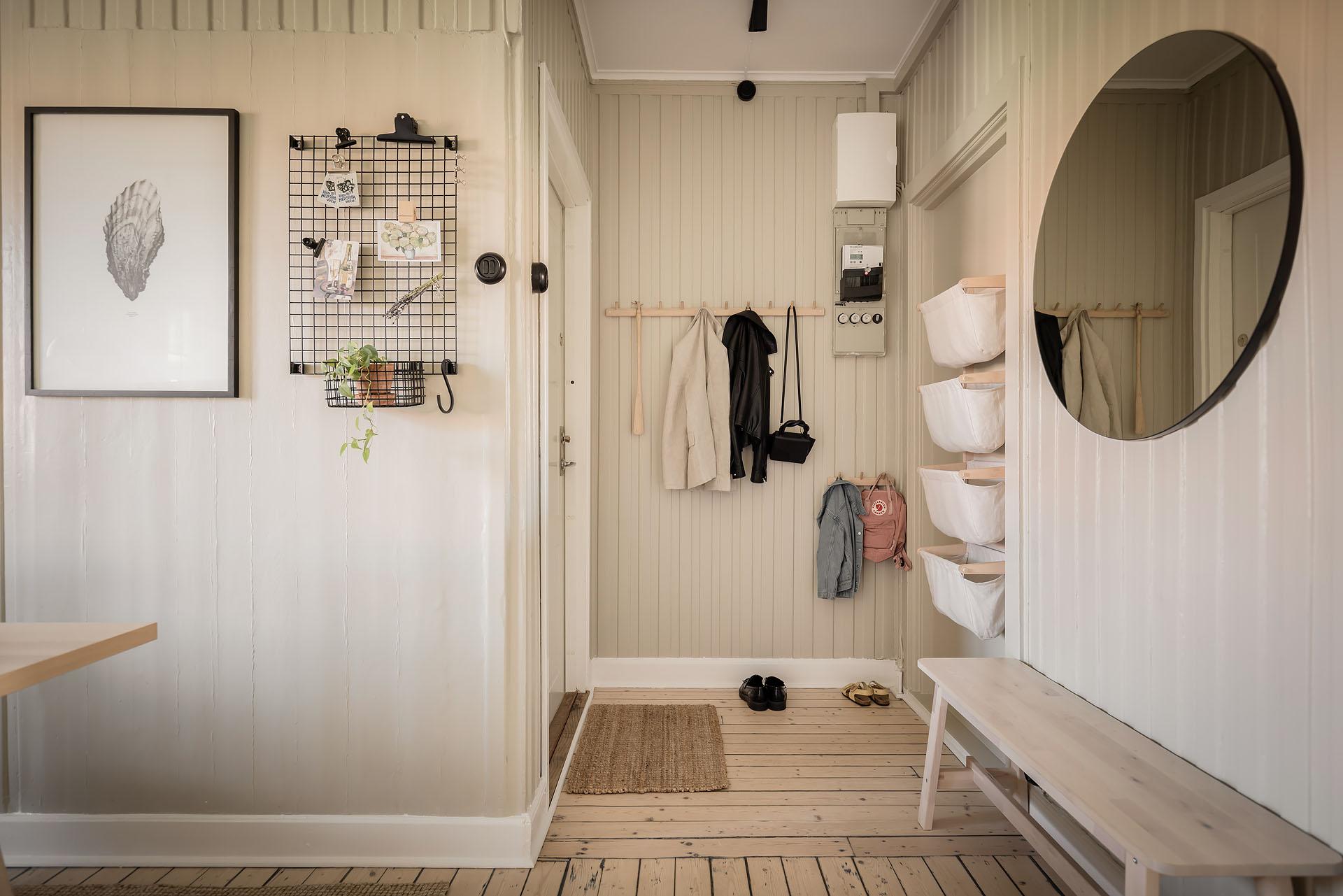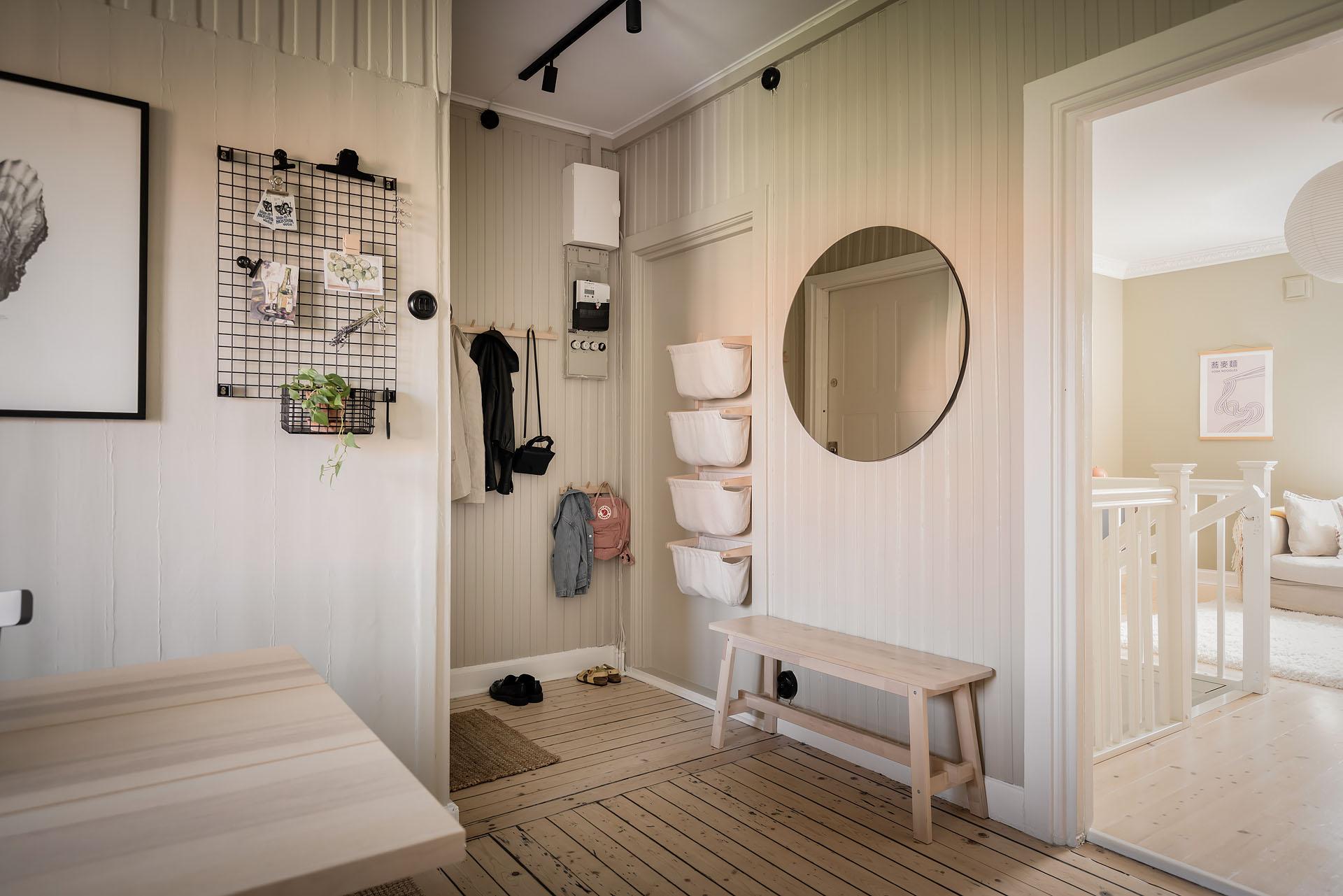Lägenhetens övre hall är en välkomnande entré med gott om plats för jackavhängning och skor. Väggarna är klädda med spontpanel som målats i en ljuvlig ljusbeige kulör, och framtaget brädgolv löper tröskelfritt genom den breda öppningen mot köket.