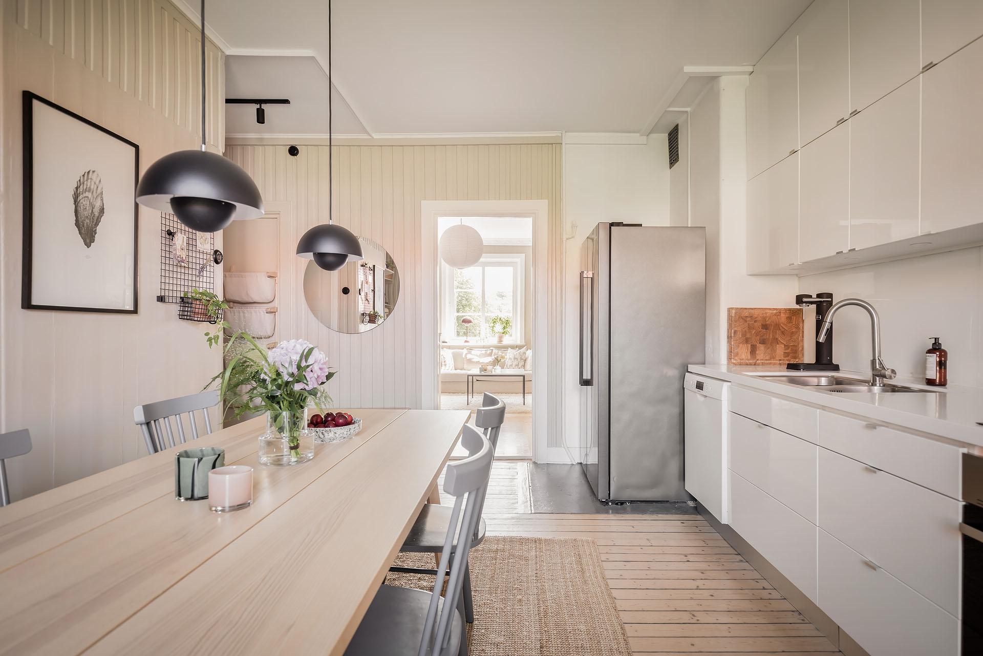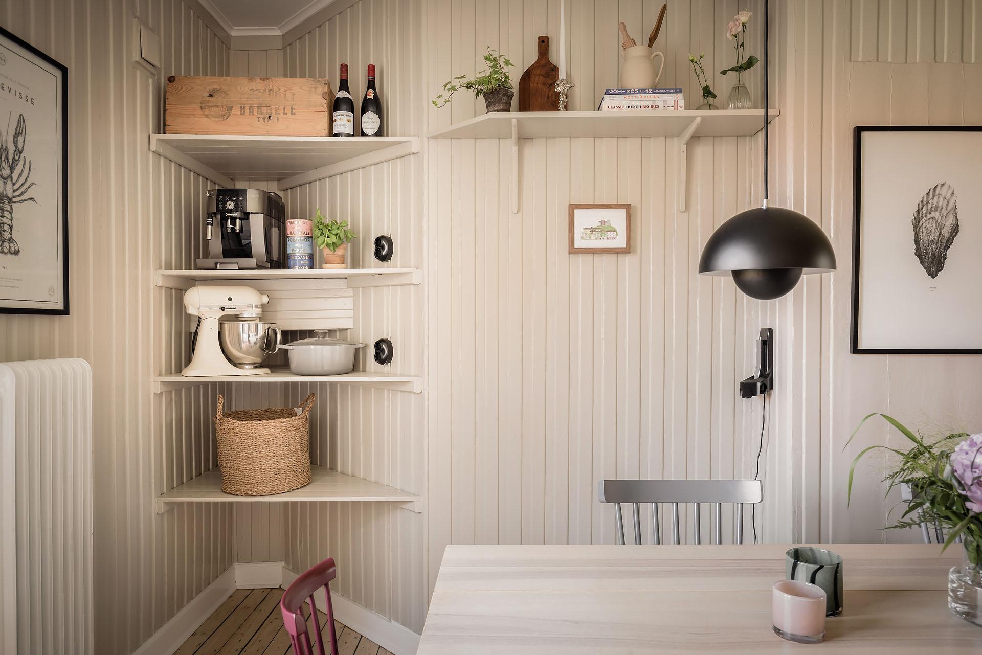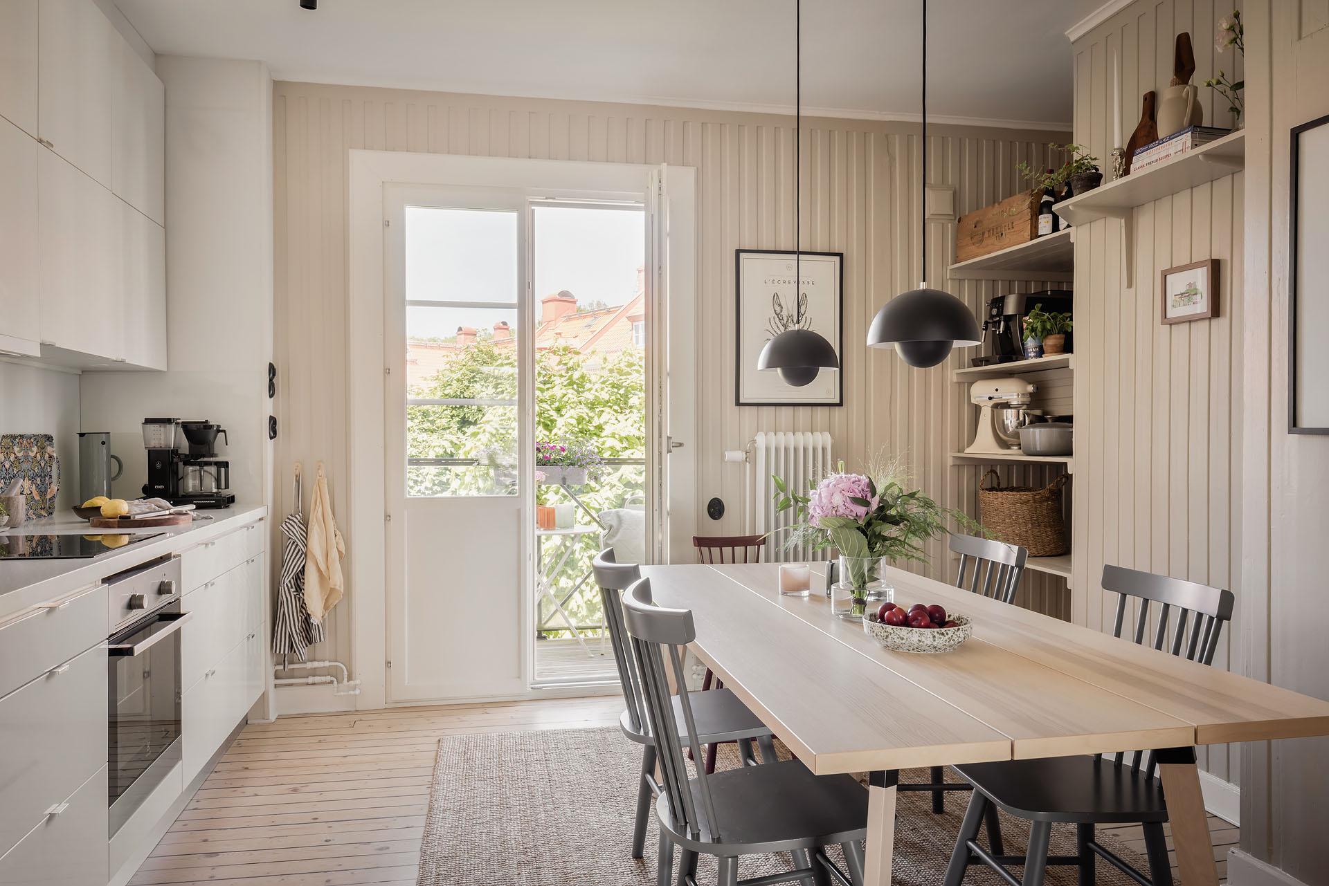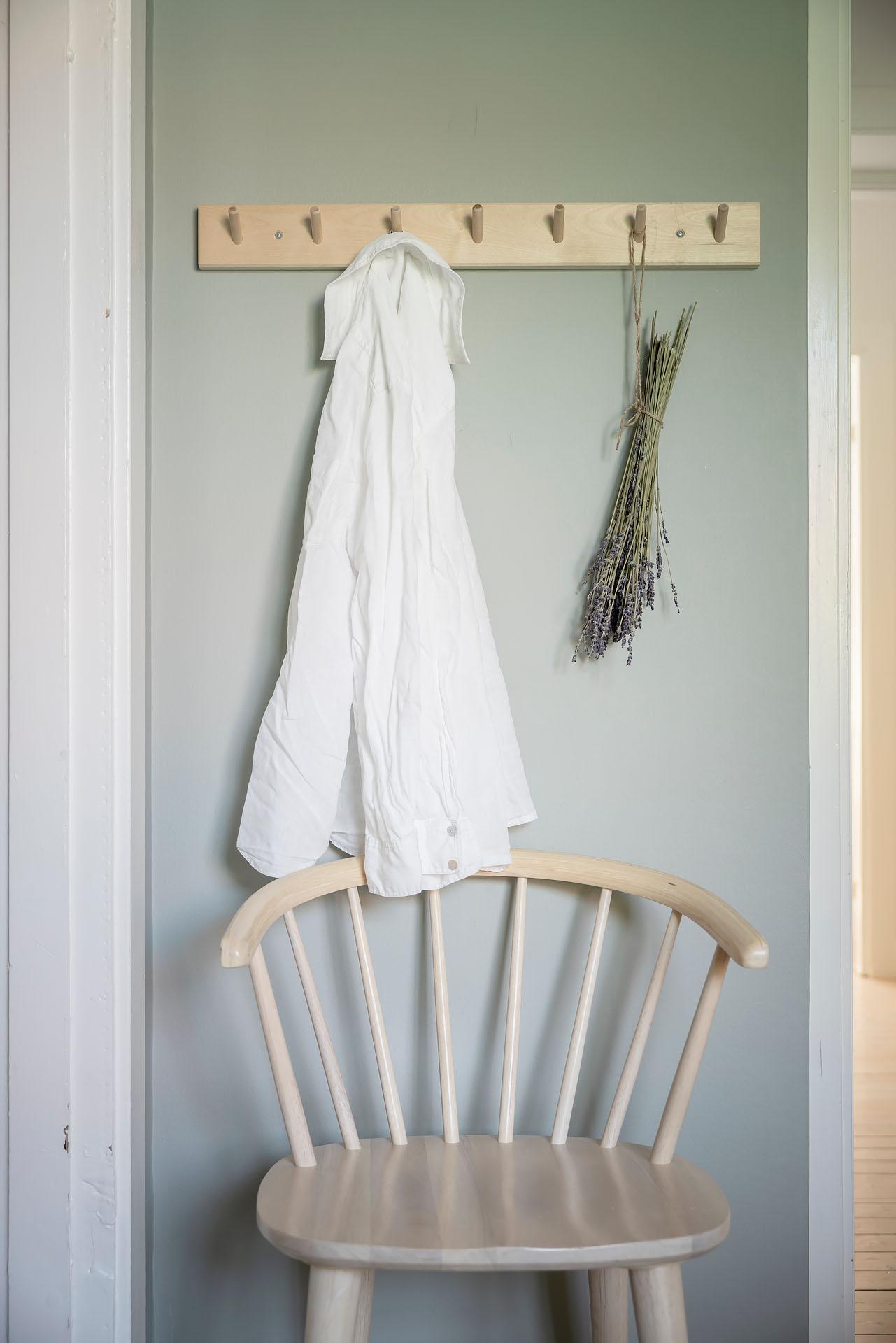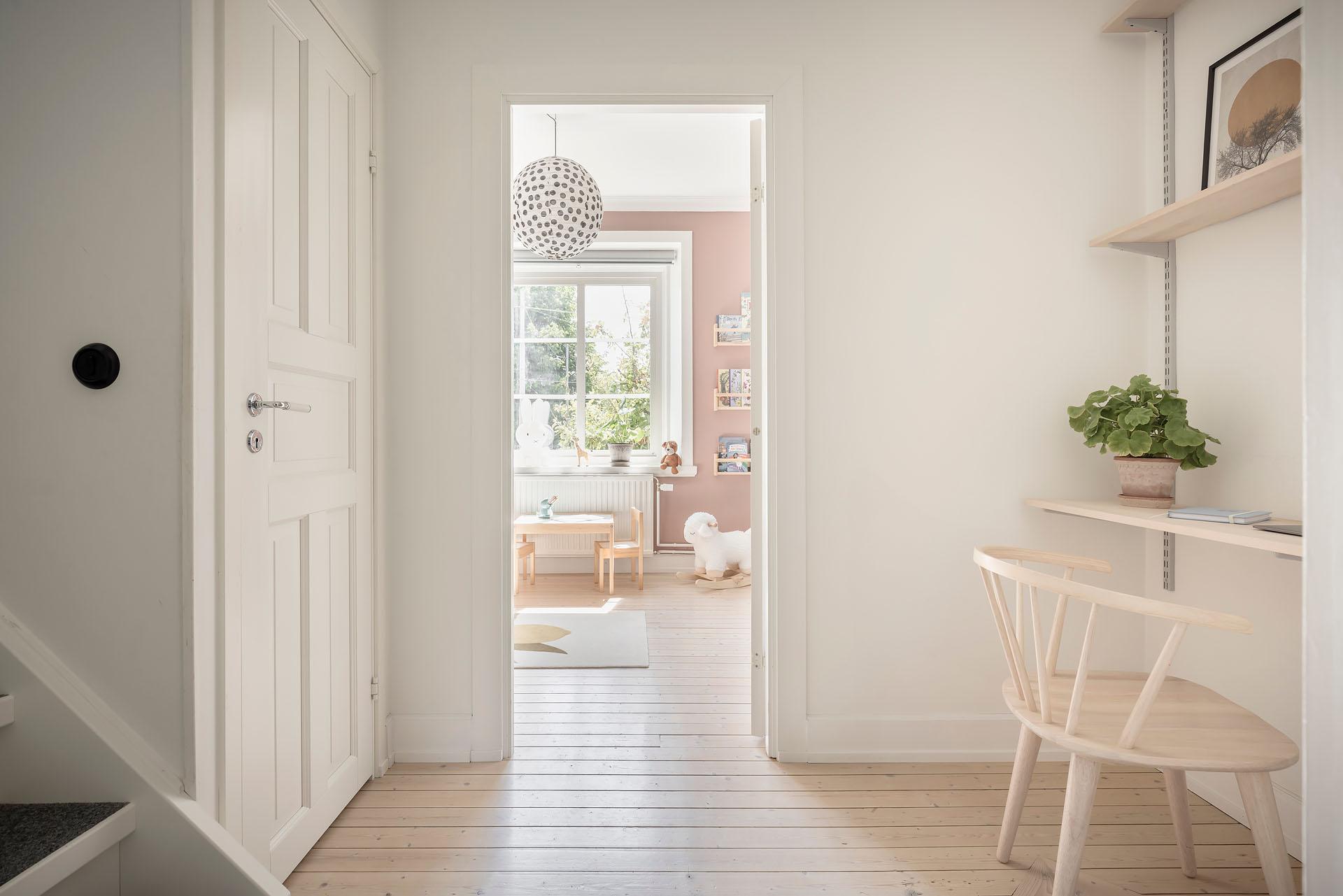 Lägenhetens övre hall är en välkomnande entré med gott om plats för jackavhängning och skor. Väggarna är klädda med spontpanel som målats i en ljuvlig ljusbeige kulör, och framtaget brädgolv löper tröskelfritt genom den breda öppningen mot köket.
