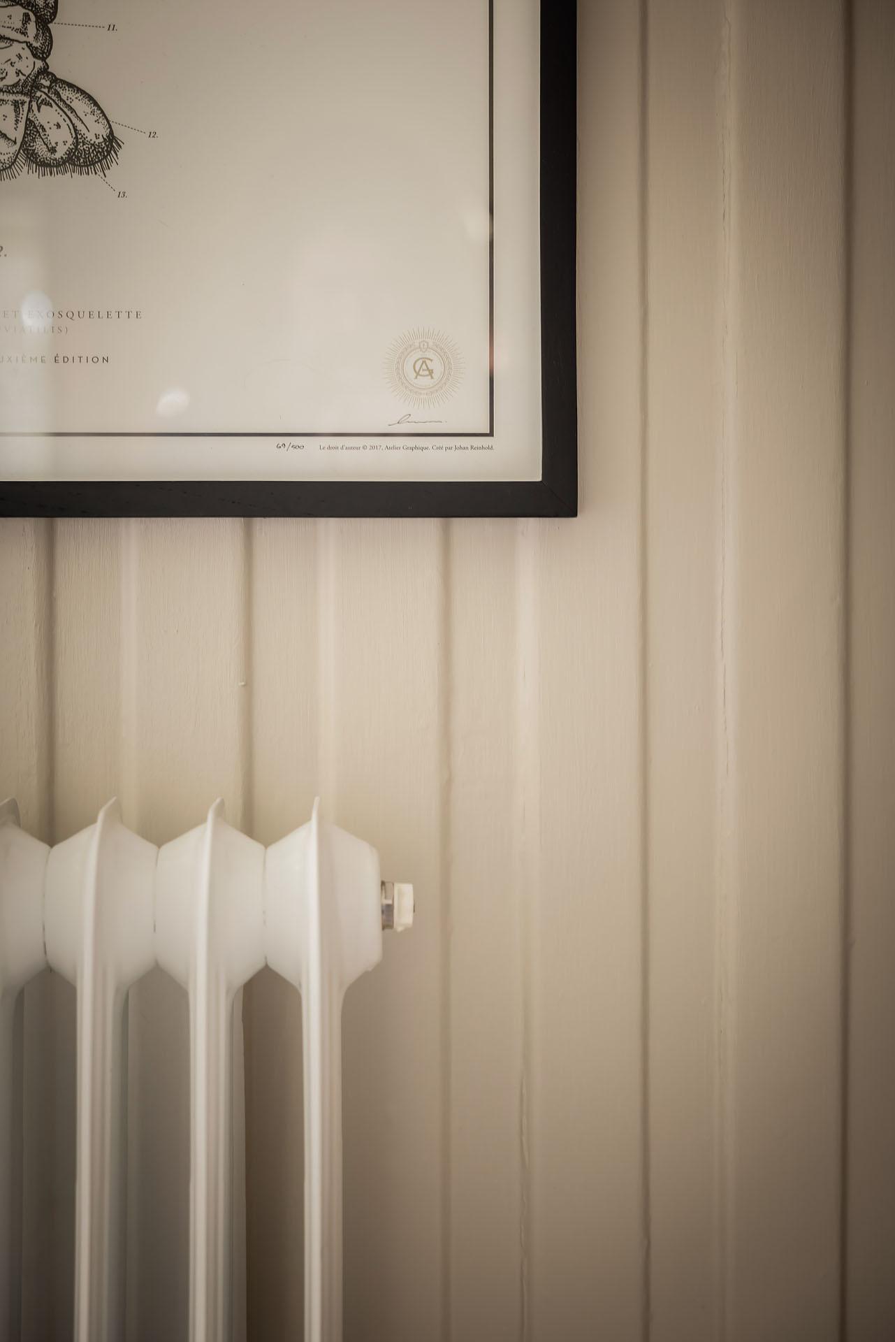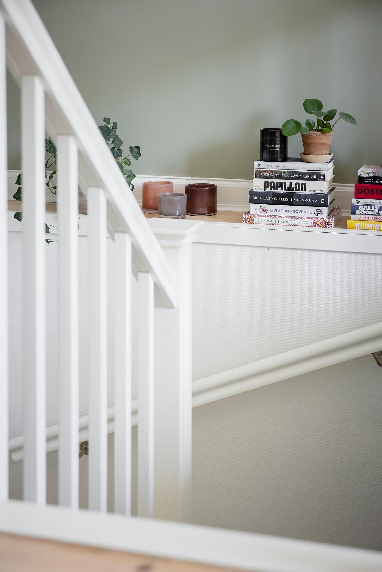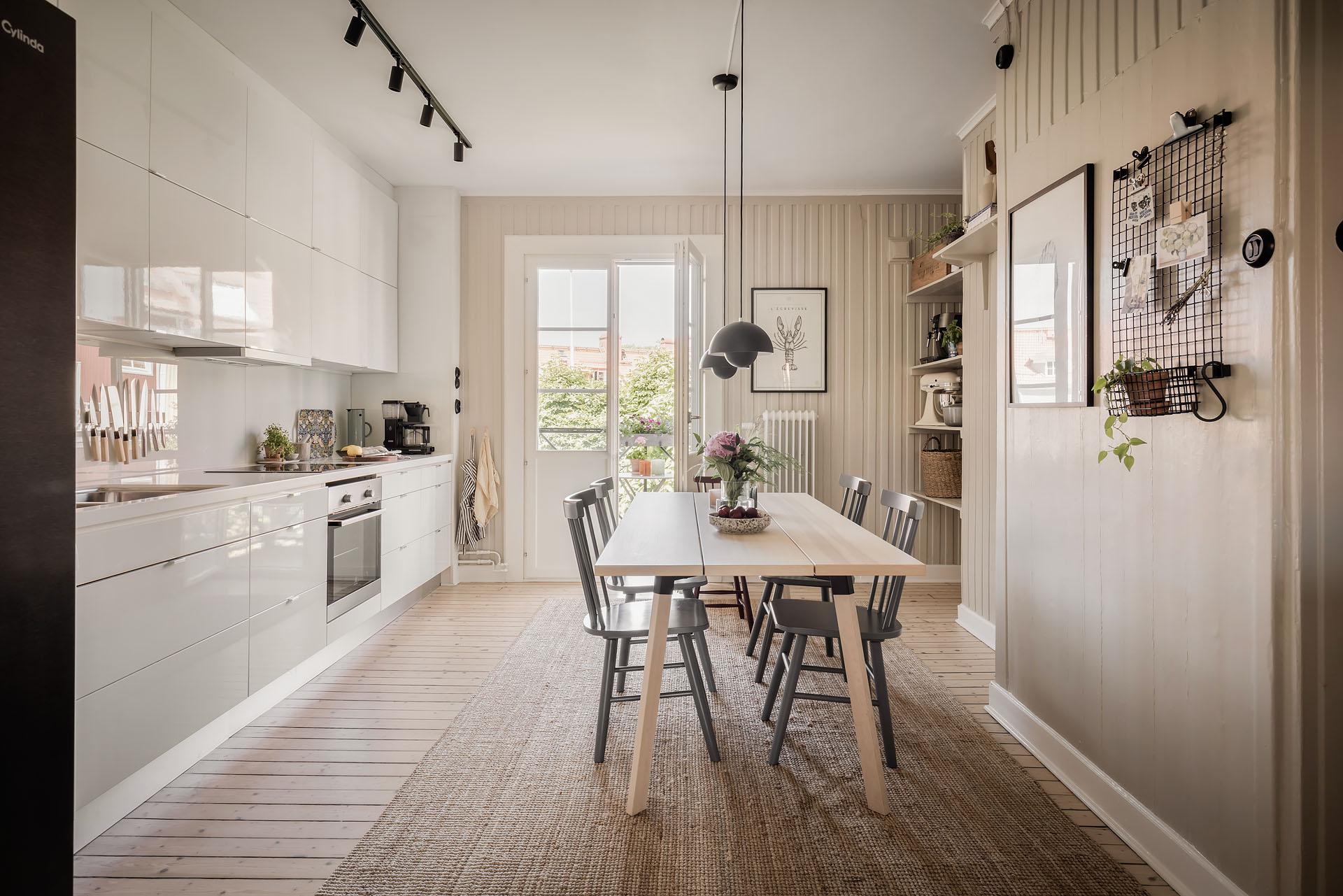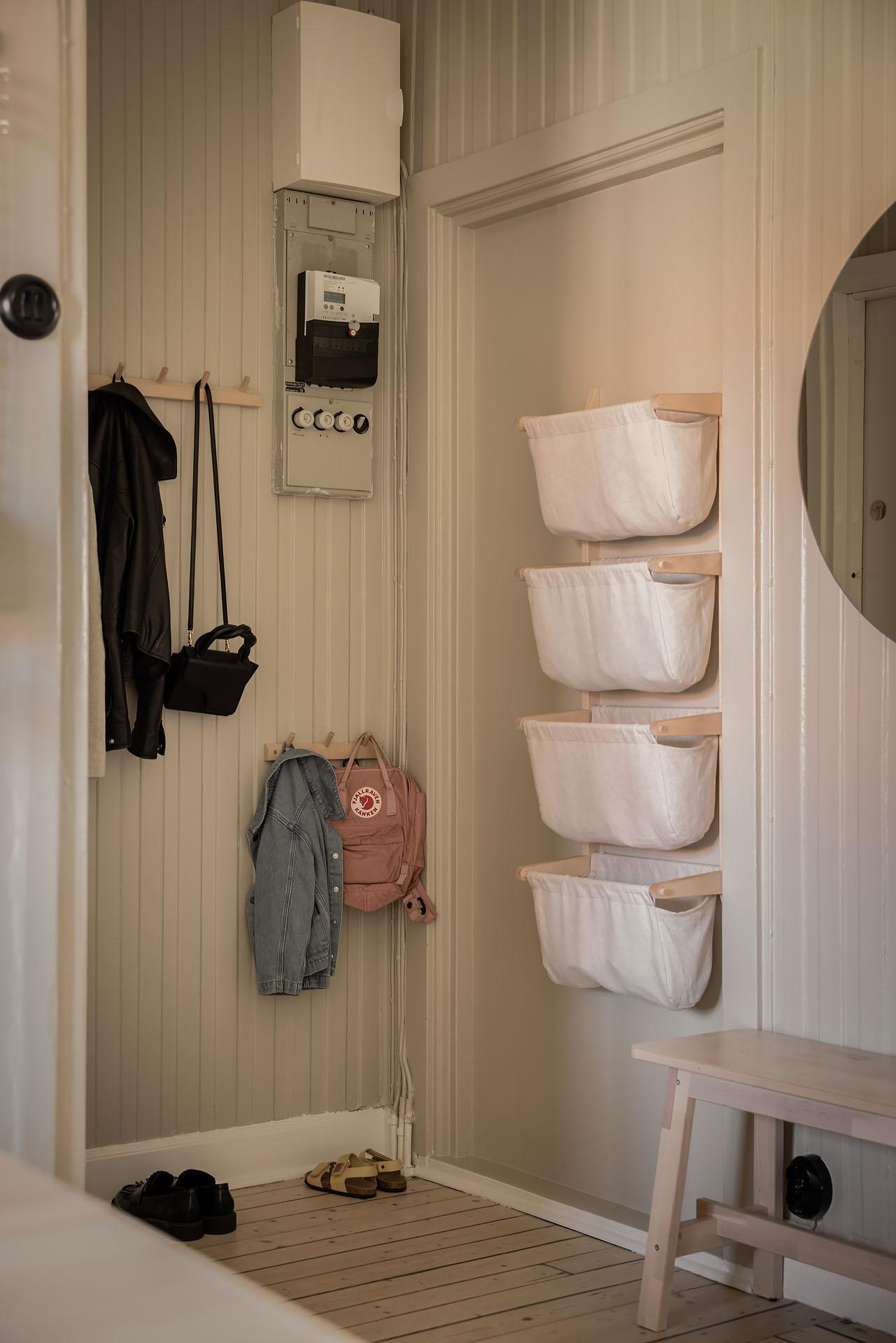 Lägenhetens övre hall är en välkomnande entré med gott om plats för jackavhängning och skor. Väggarna är klädda med spontpanel som målats i en ljuvlig ljusbeige kulör, och framtaget brädgolv löper tröskelfritt genom den breda öppningen mot köket.