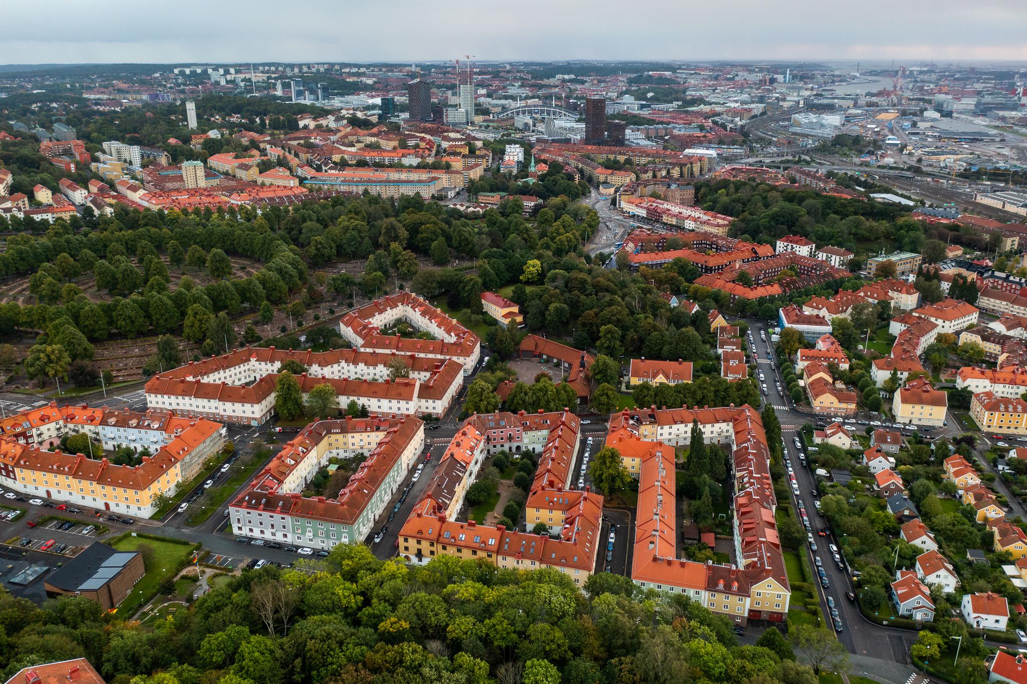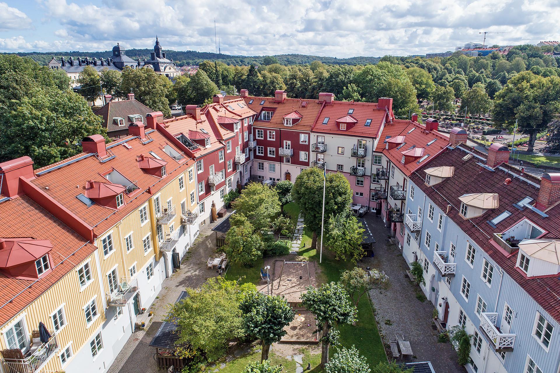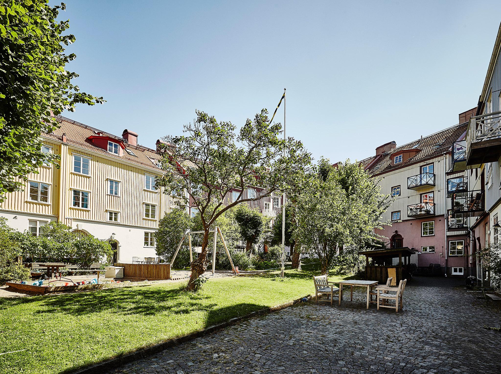 Det fina landshövdingehuset uppfördes 1925 i tjugotalsklassicistisk stil enligt ritningar av Karl M. Bengtson, en välrenommerad arkitekt som bland annat ritat Lorensbergsteatern och Sjöfartsmuseet’. Huset ingår i ett så kallat storgårdskvarter med lekplats, fina grönytor och flera sittgrupper som bjuder in till umgänge med grannarna. Gården är en rofylld kontrast till det centrala läget med snabba spårvagnar in till stan runt hörnet, och tack vare de låsta portarna leker barnen tryggt.