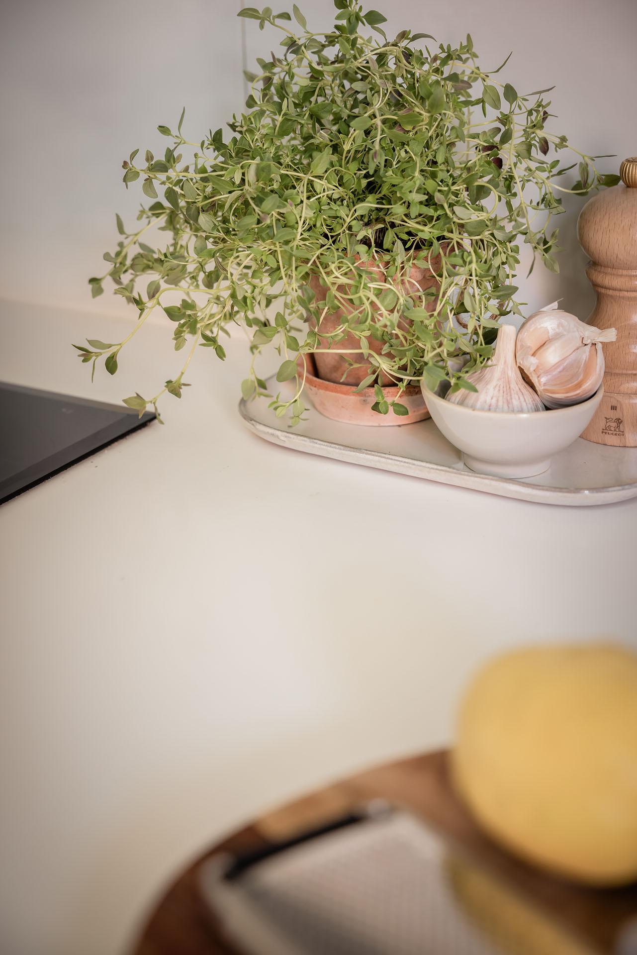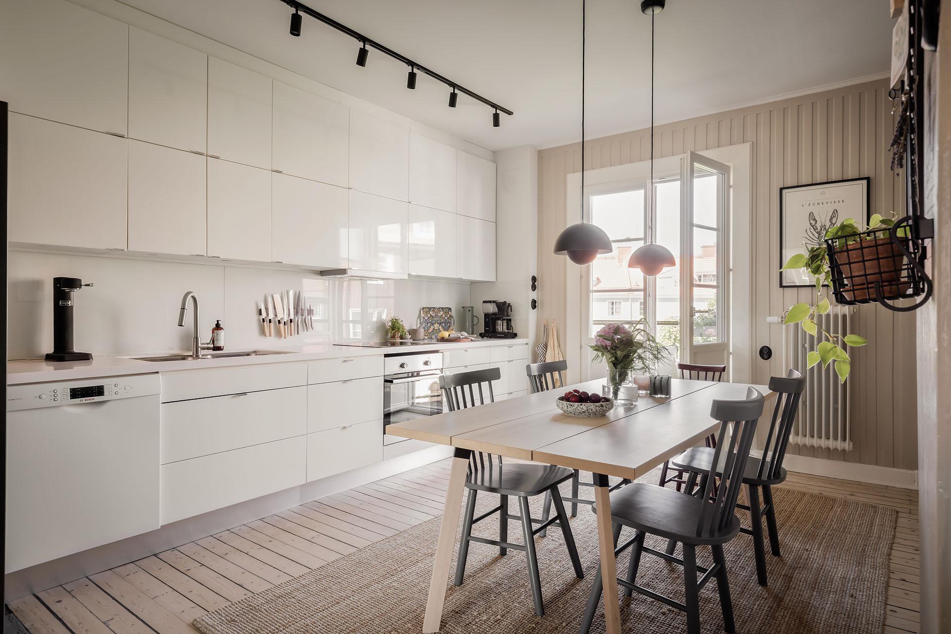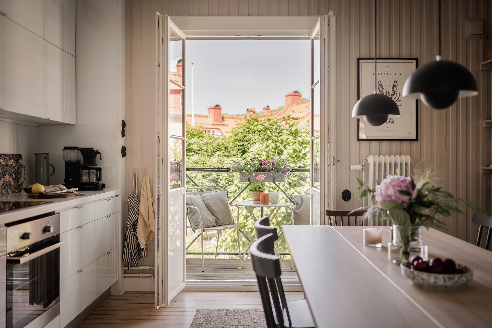 Köket bjuder in till både matlagning och umgänge, och det finns plats för ett stort matbord. Sommartid är det härligt att sitta och äta eller bara koppla av på balkongen med utsikten över den grönskande gården, takåsarna och himlen som kuliss. Det är väl tilltaget med bänkyta och förvaring, och takhöjden tas till vara genom dubbla rader överskåp. Den breda arbetsbänken är i Corian med infälld spishäll och diskho. Hällen, kolfilterfläkten och kylen/frysen sattes in under 2022 och 2023, och köket är även utrustat med en diskmaskin som installerades i samband med helrenoveringen 2012. Brädgolvet är framtaget och väggarna klädda med samma ljusbeige spontpanel som i hallen.