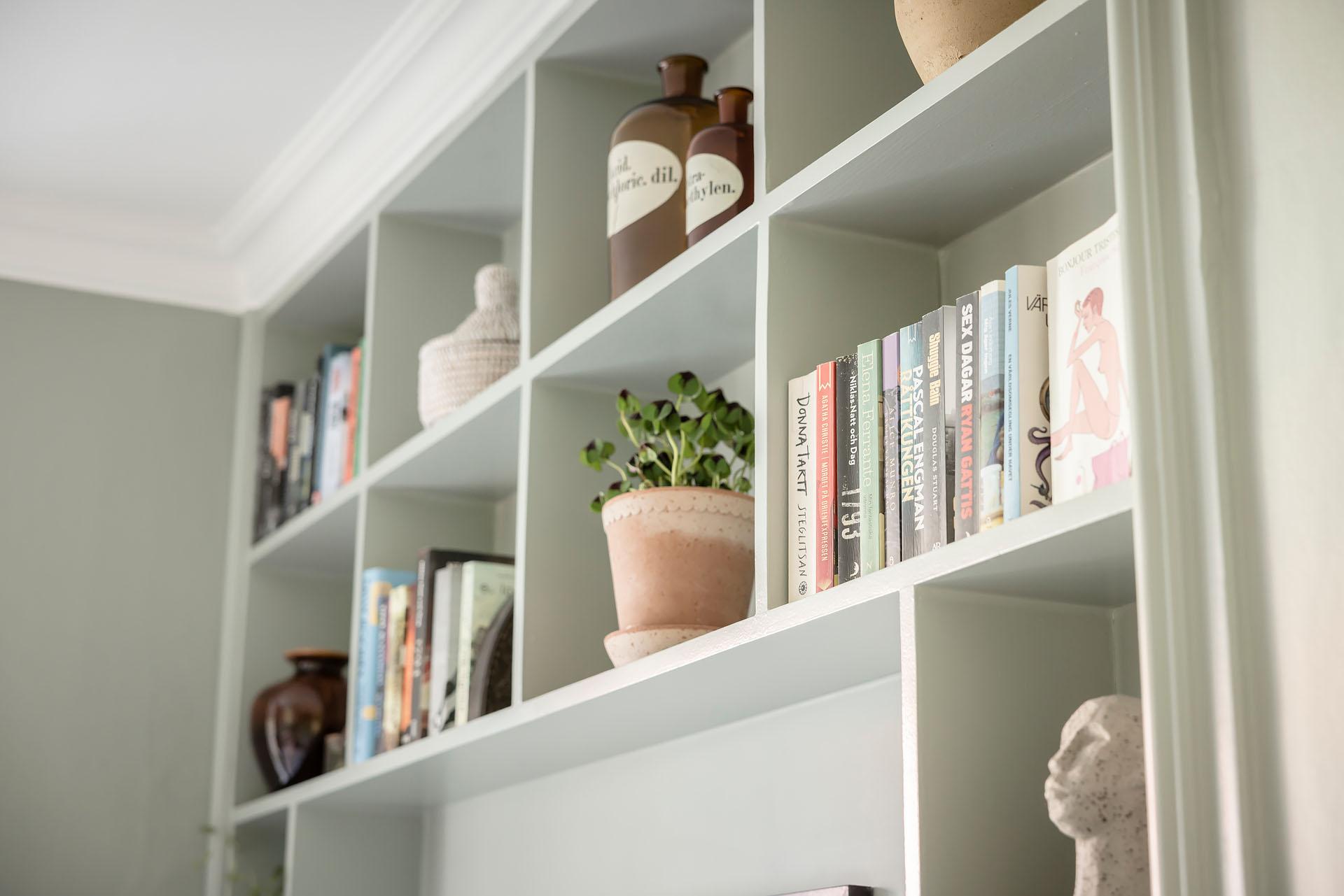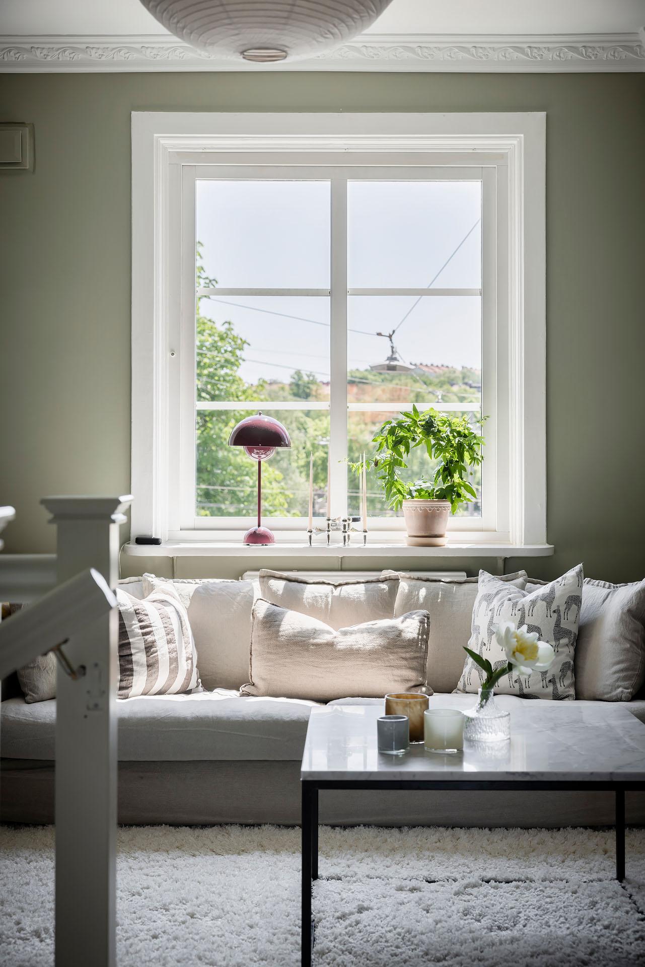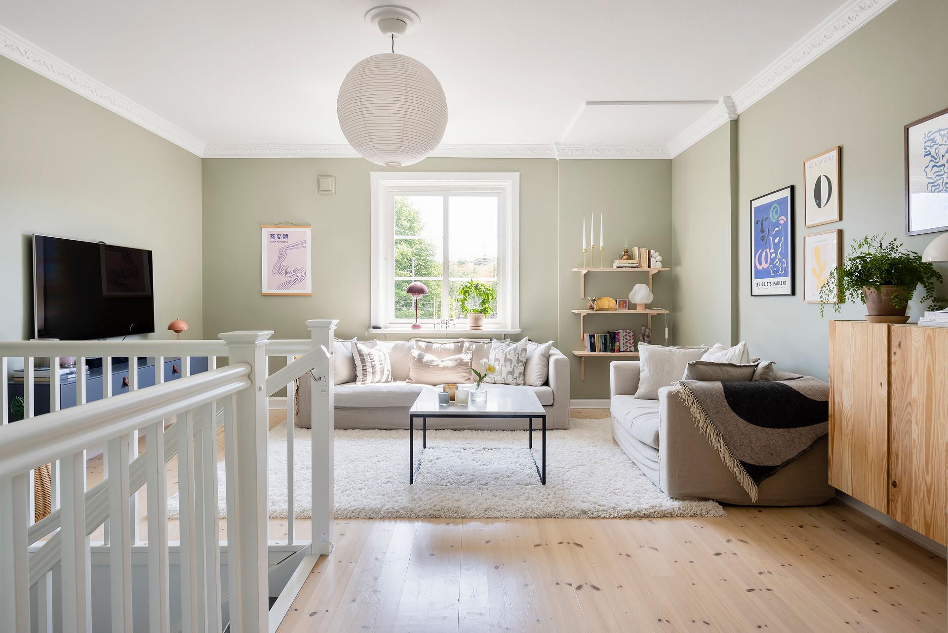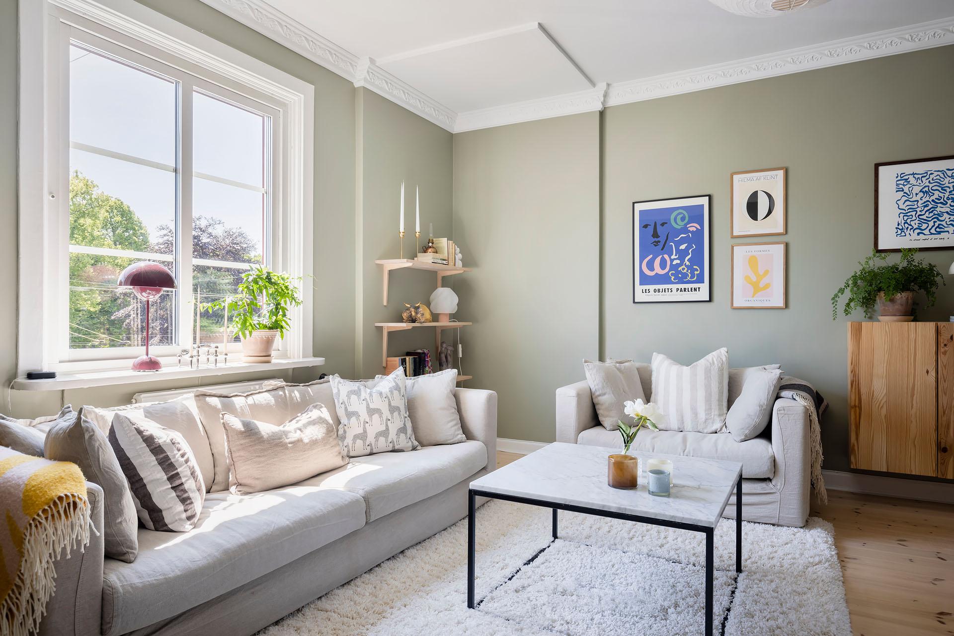 Ett fönster i söder fyller vardagsrummet med ljus. Rummet är väldimensionerat, och man får enkelt plats med en stor soffgrupp utan att den luftiga känslan går förlorad. Golvet är i ljust trä och väggarna målade med en grågrön färg som lyfter fram listerna och den vackra stuckaturen.