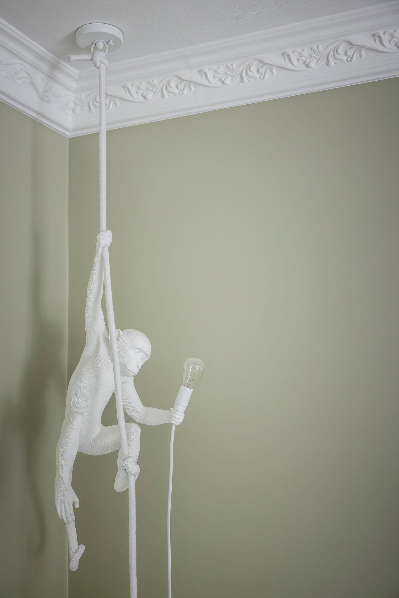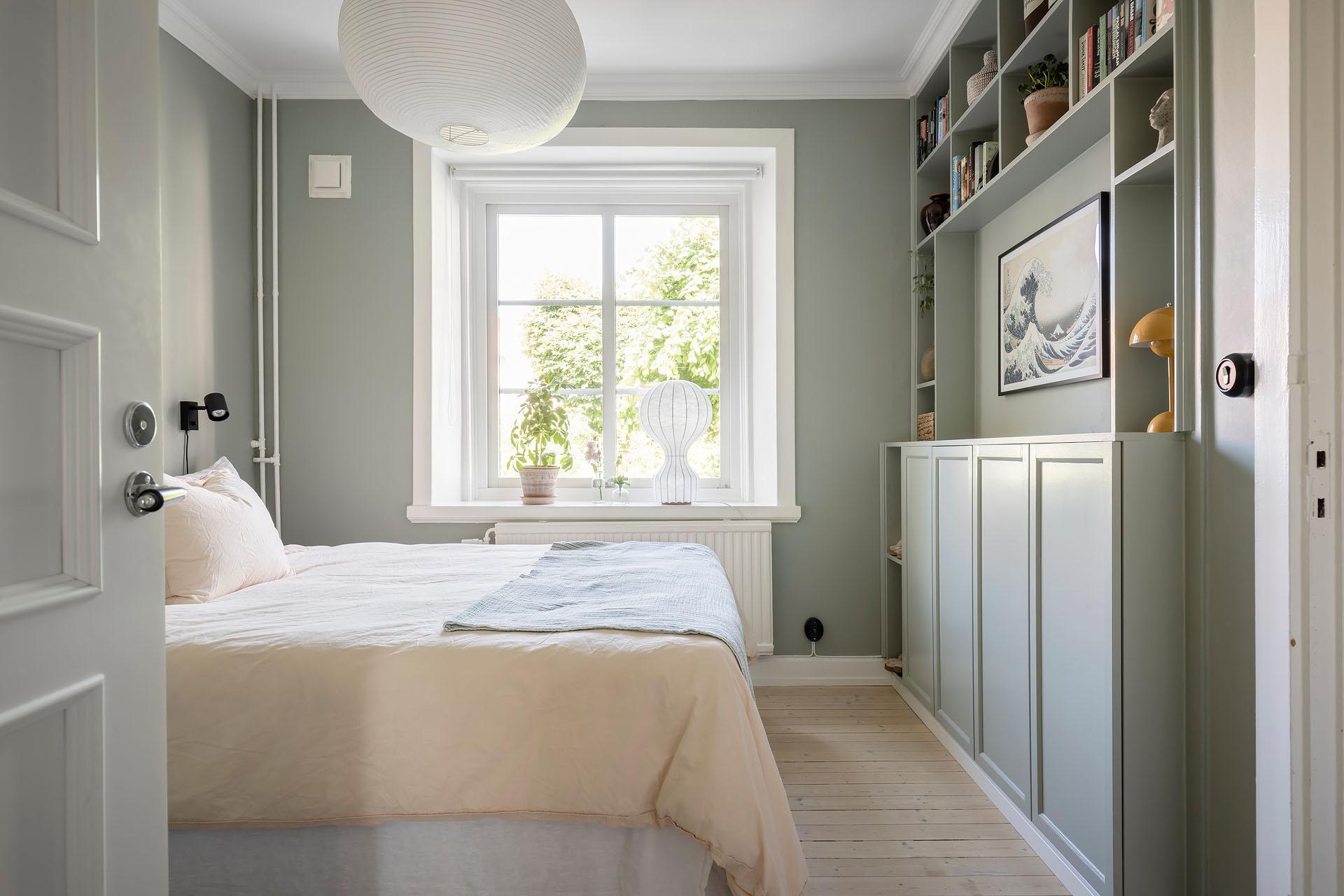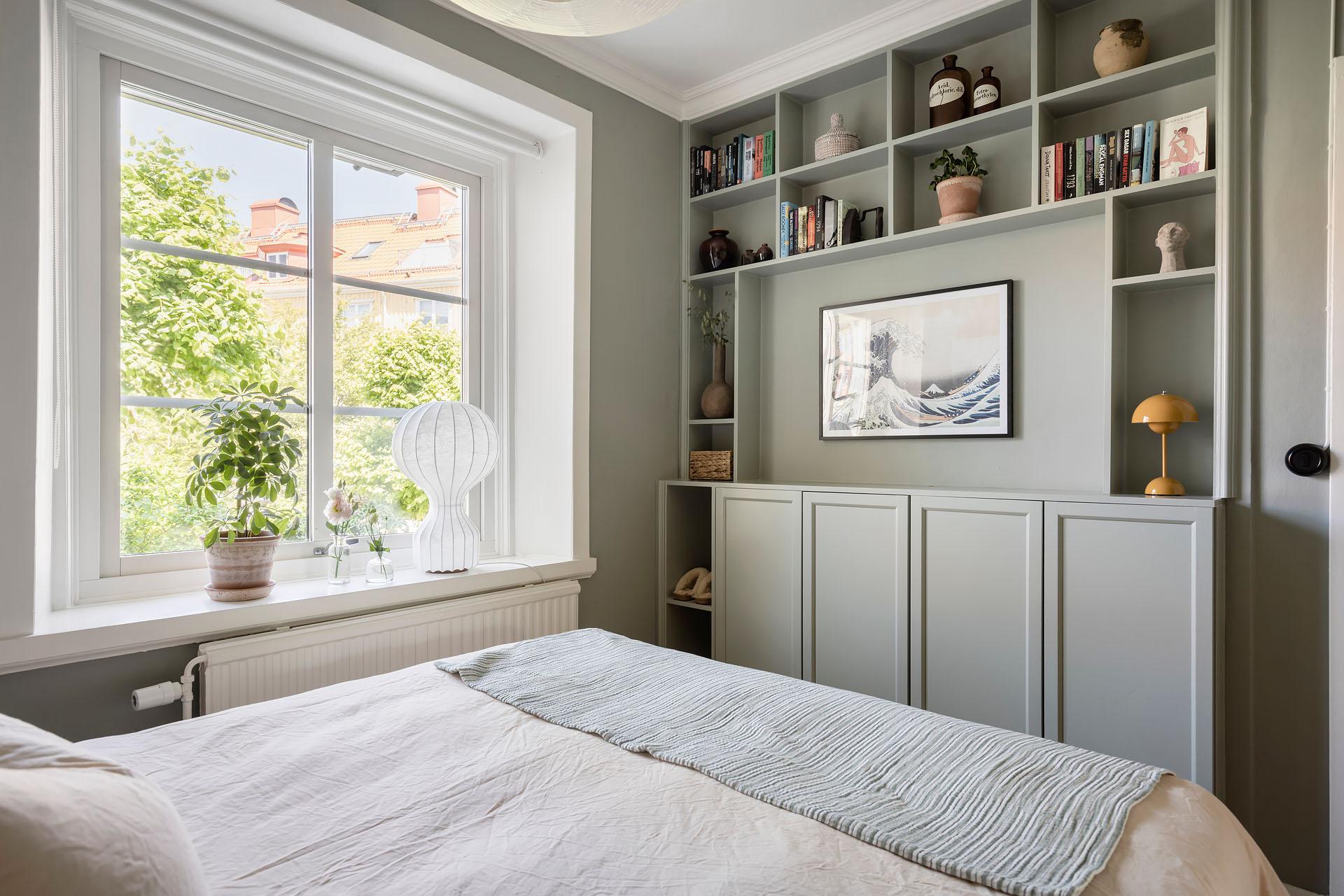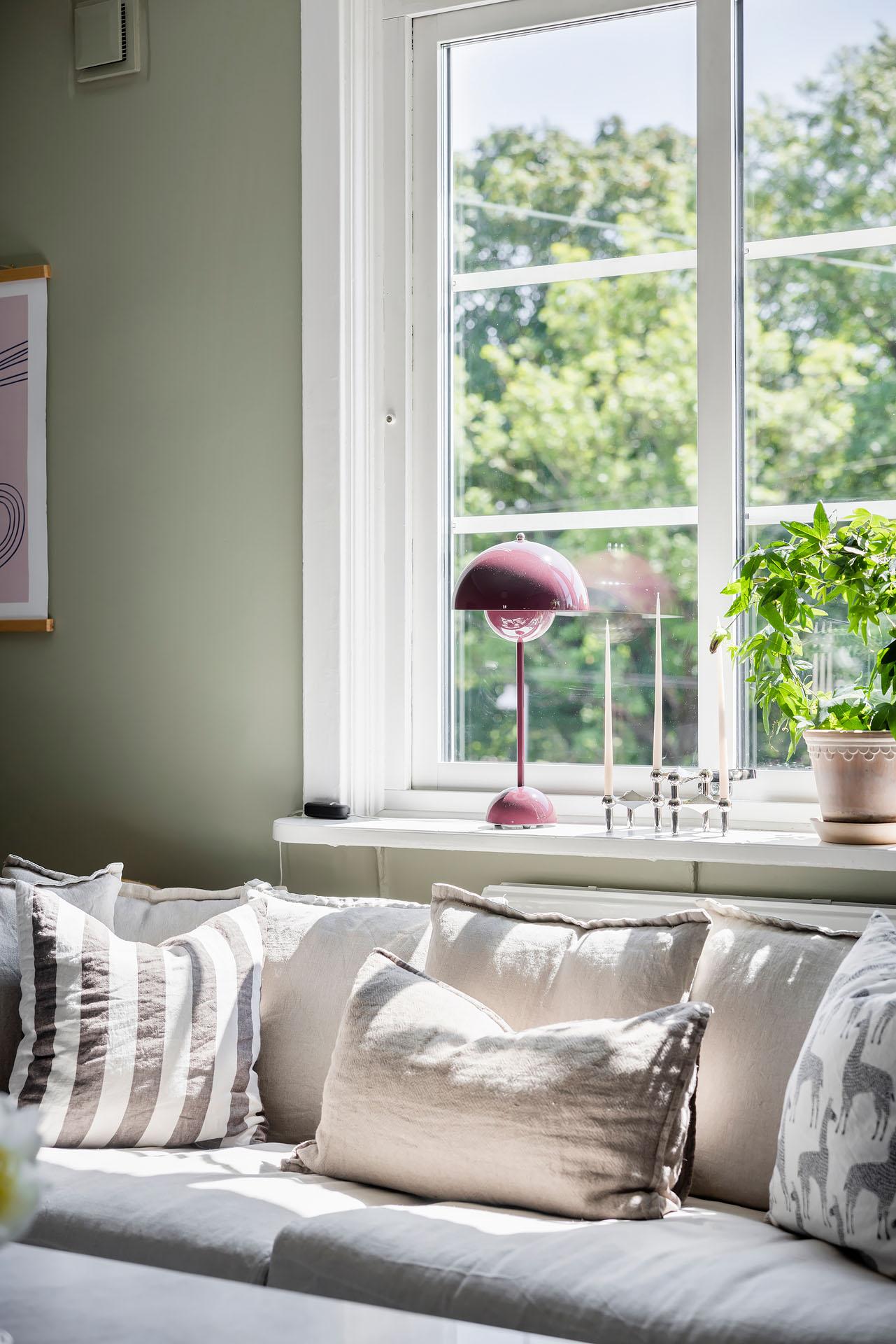 Ett fönster i söder fyller vardagsrummet med ljus. Rummet är väldimensionerat, och man får enkelt plats med en stor soffgrupp utan att den luftiga känslan går förlorad. Golvet är i ljust trä och väggarna målade med en grågrön färg som lyfter fram listerna och den vackra stuckaturen.