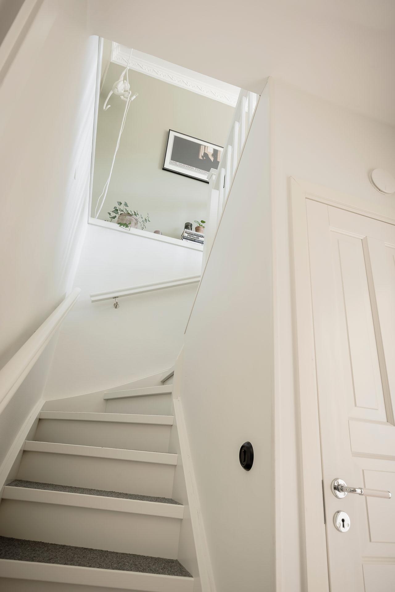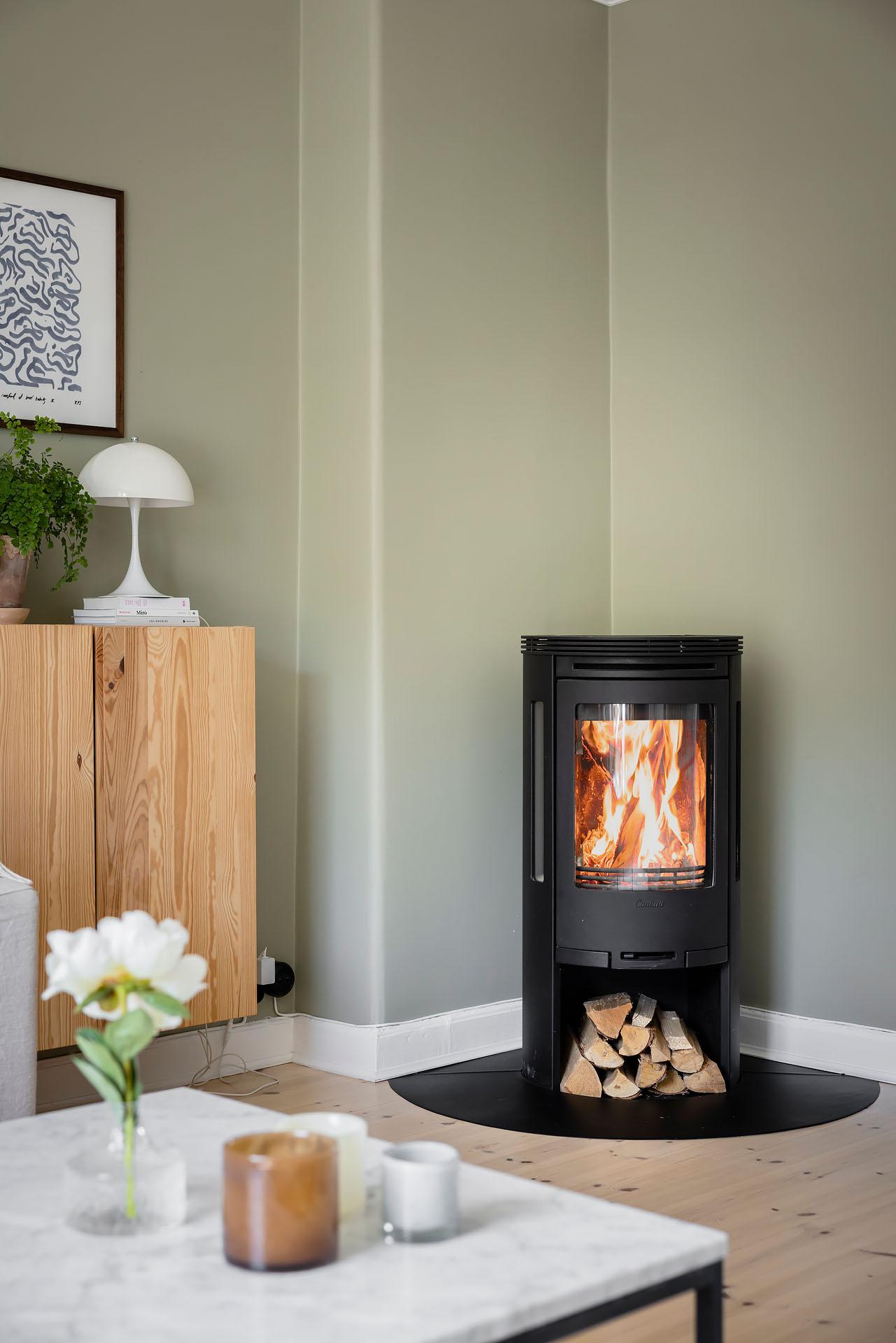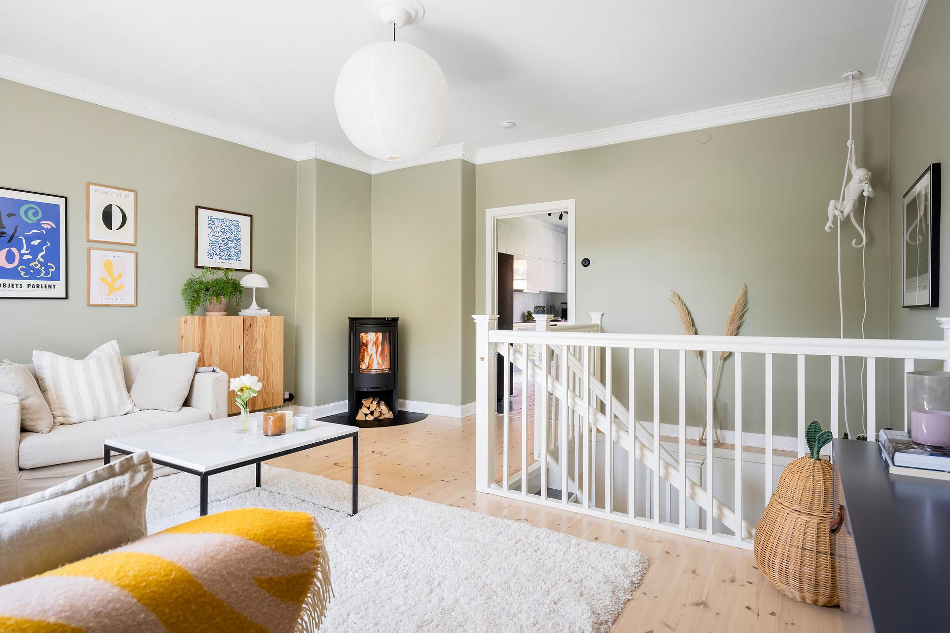 Det vilar en känsla av hemtrevnad över lägenheten, och de framtagna brädgolven skapar en ombonad atmosfär. Den genomgående planlösningen låter dagsljuset flöda, och grönskan utanför fönstren och balkongen är rogivande. Tack vare den öppna ytan utanför fönstren i söder orkar solljuset sig in även under vinterhalvåret, och efter att mörkret väl lagt sig är det mysigt att elda i vardagsrummets braskamin. Planlösningen är lika enkel som självklar – två våningsplan som följer dygnets rytm. Utrymme för umgänge på övervåningen och lugna rum att dra sig tillbaka till på nedervåningen. Att våningarna har varsin entré är också väldigt behändigt.