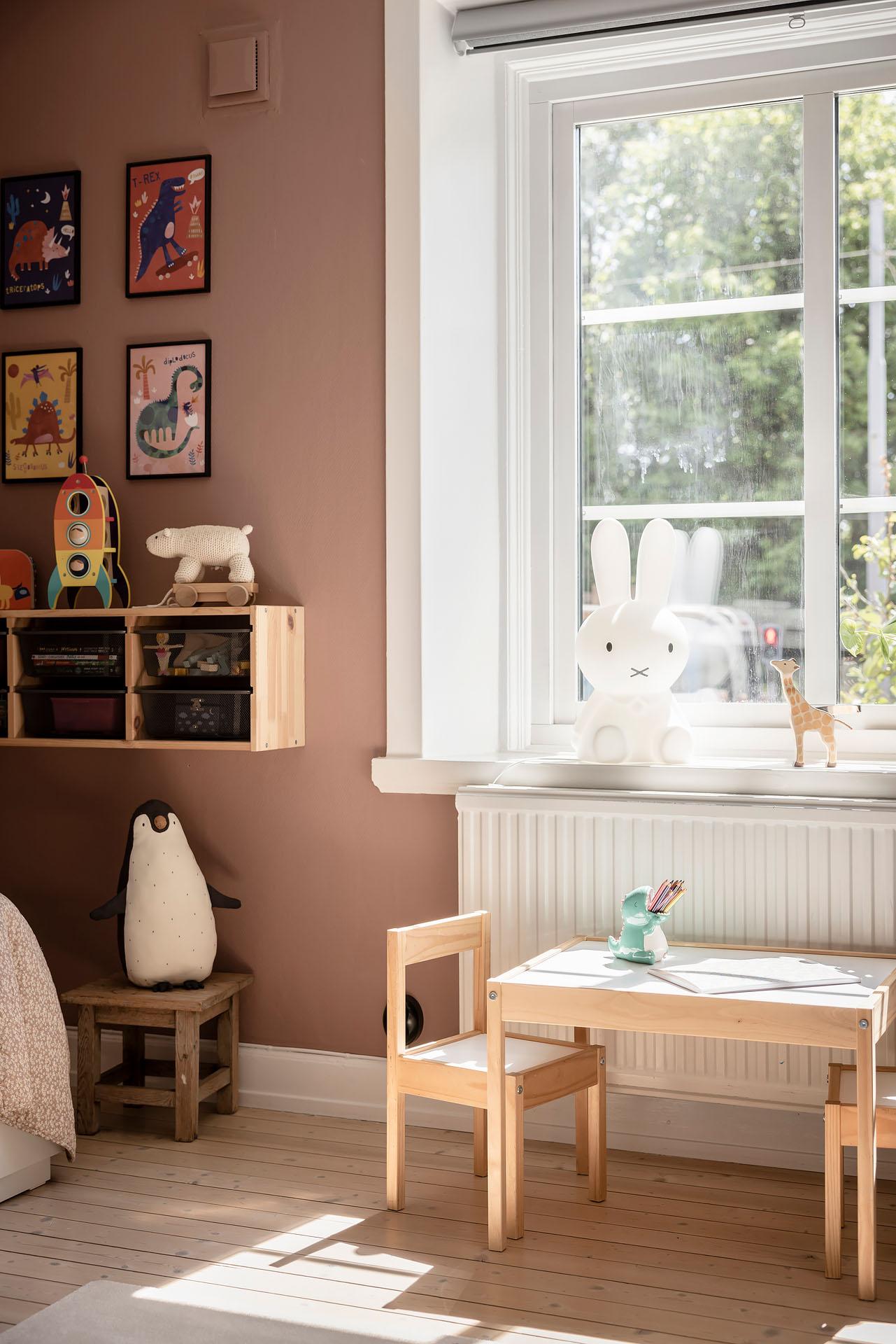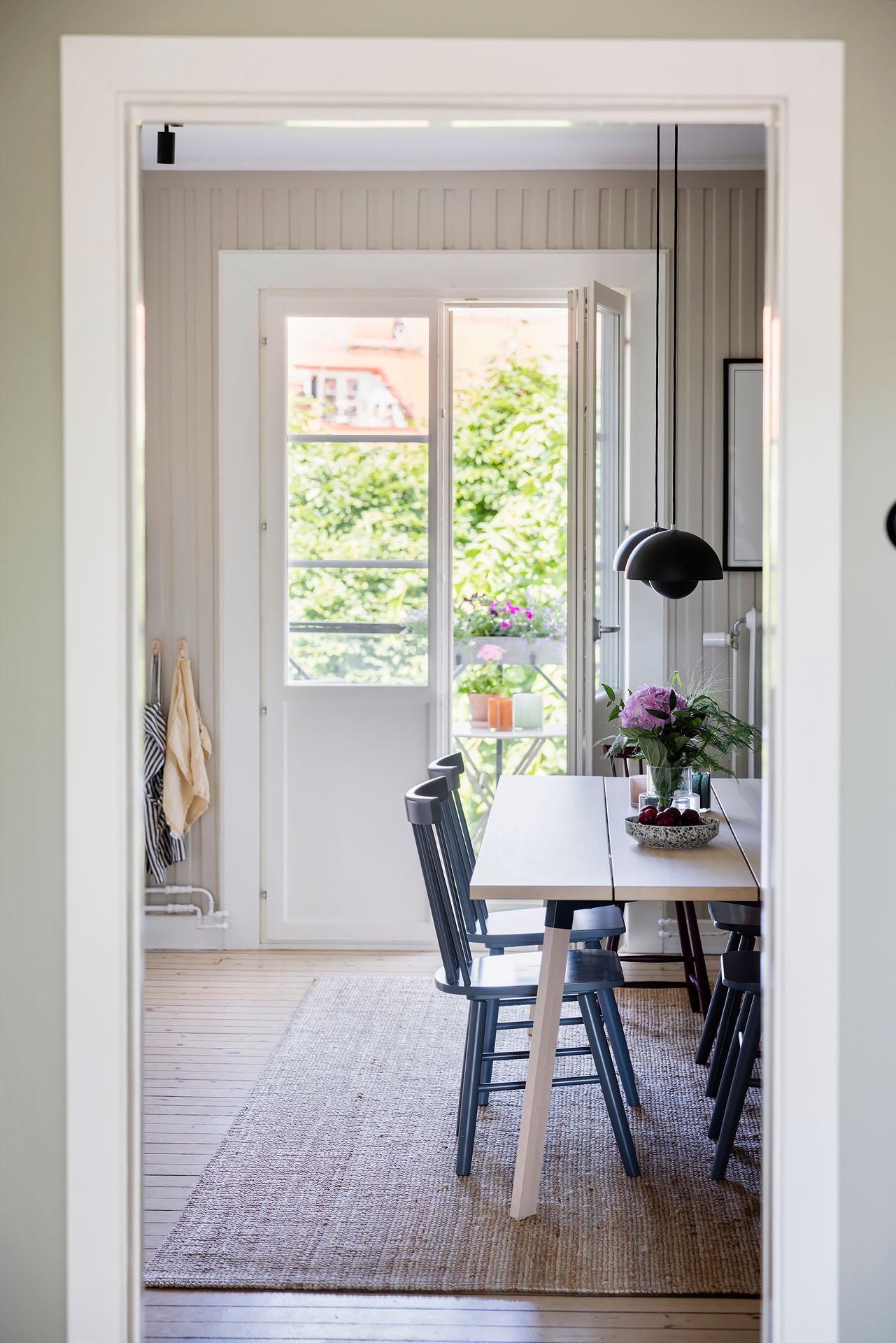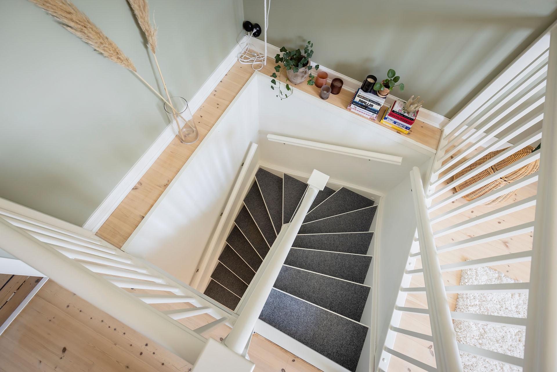 Det vilar en känsla av hemtrevnad över lägenheten, och de framtagna brädgolven skapar en ombonad atmosfär. Den genomgående planlösningen låter dagsljuset flöda, och grönskan utanför fönstren och balkongen är rogivande. Tack vare den öppna ytan utanför fönstren i söder orkar solljuset sig in även under vinterhalvåret, och efter att mörkret väl lagt sig är det mysigt att elda i vardagsrummets braskamin. Planlösningen är lika enkel som självklar – två våningsplan som följer dygnets rytm. Utrymme för umgänge på övervåningen och lugna rum att dra sig tillbaka till på nedervåningen. Att våningarna har varsin entré är också väldigt behändigt.