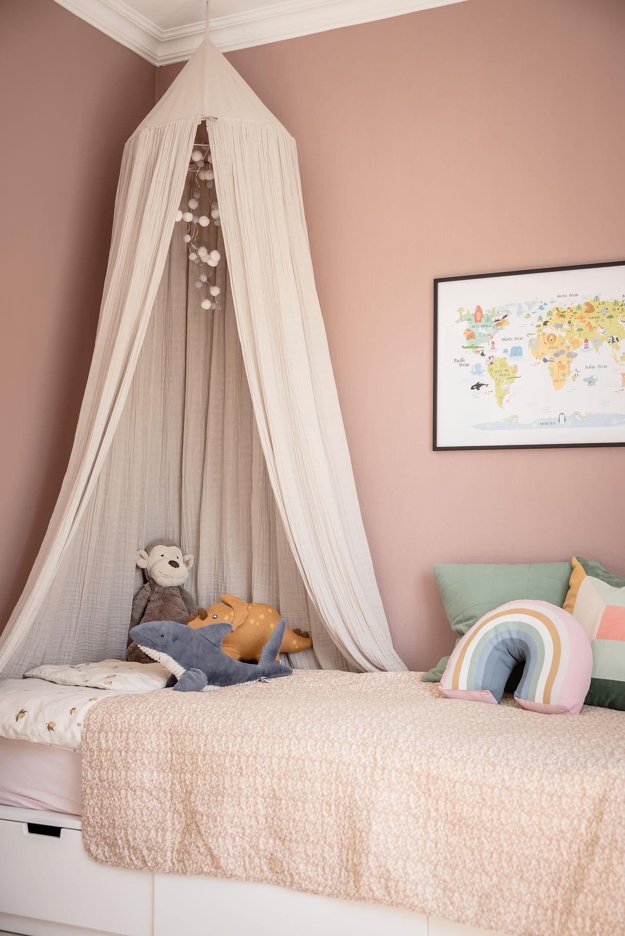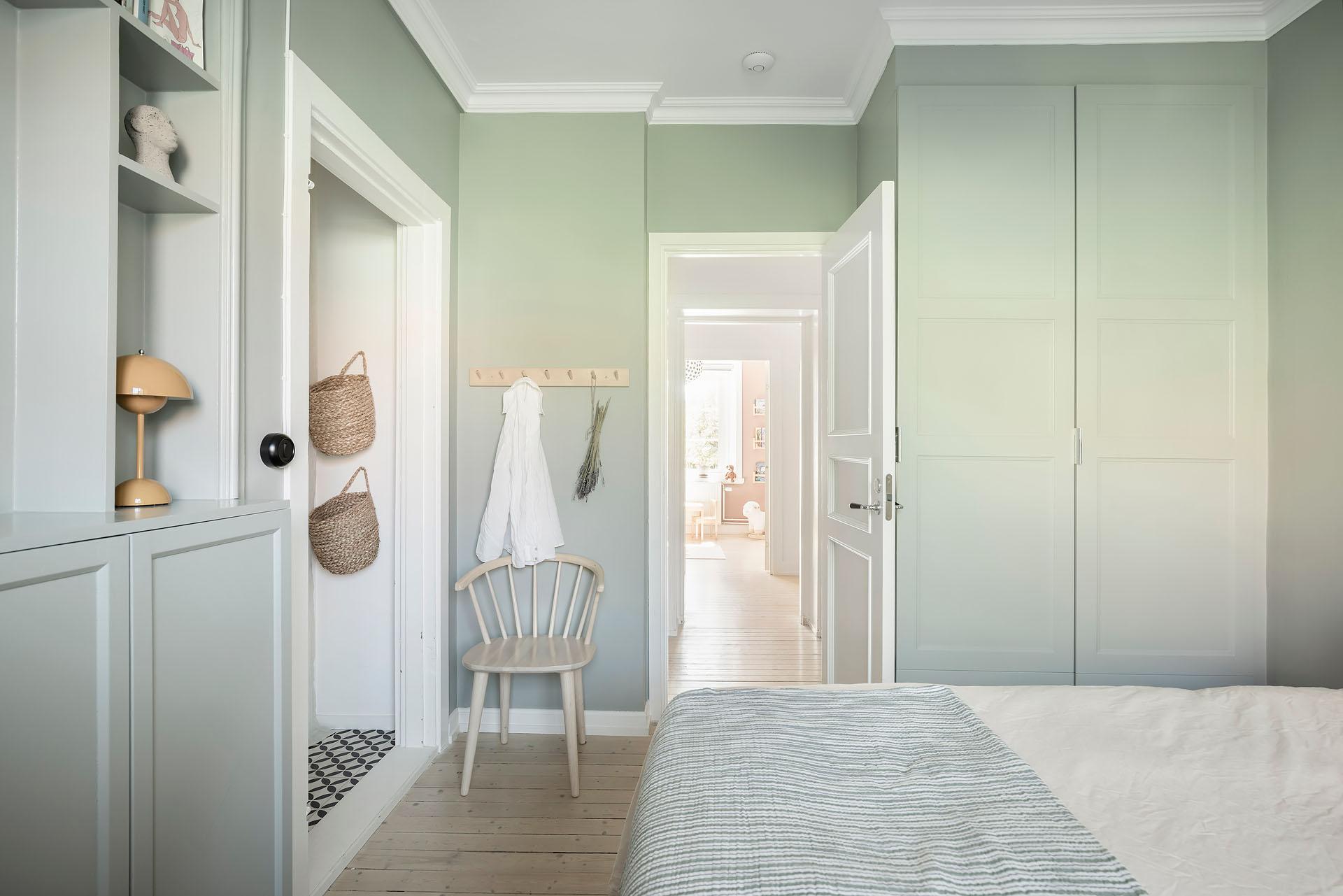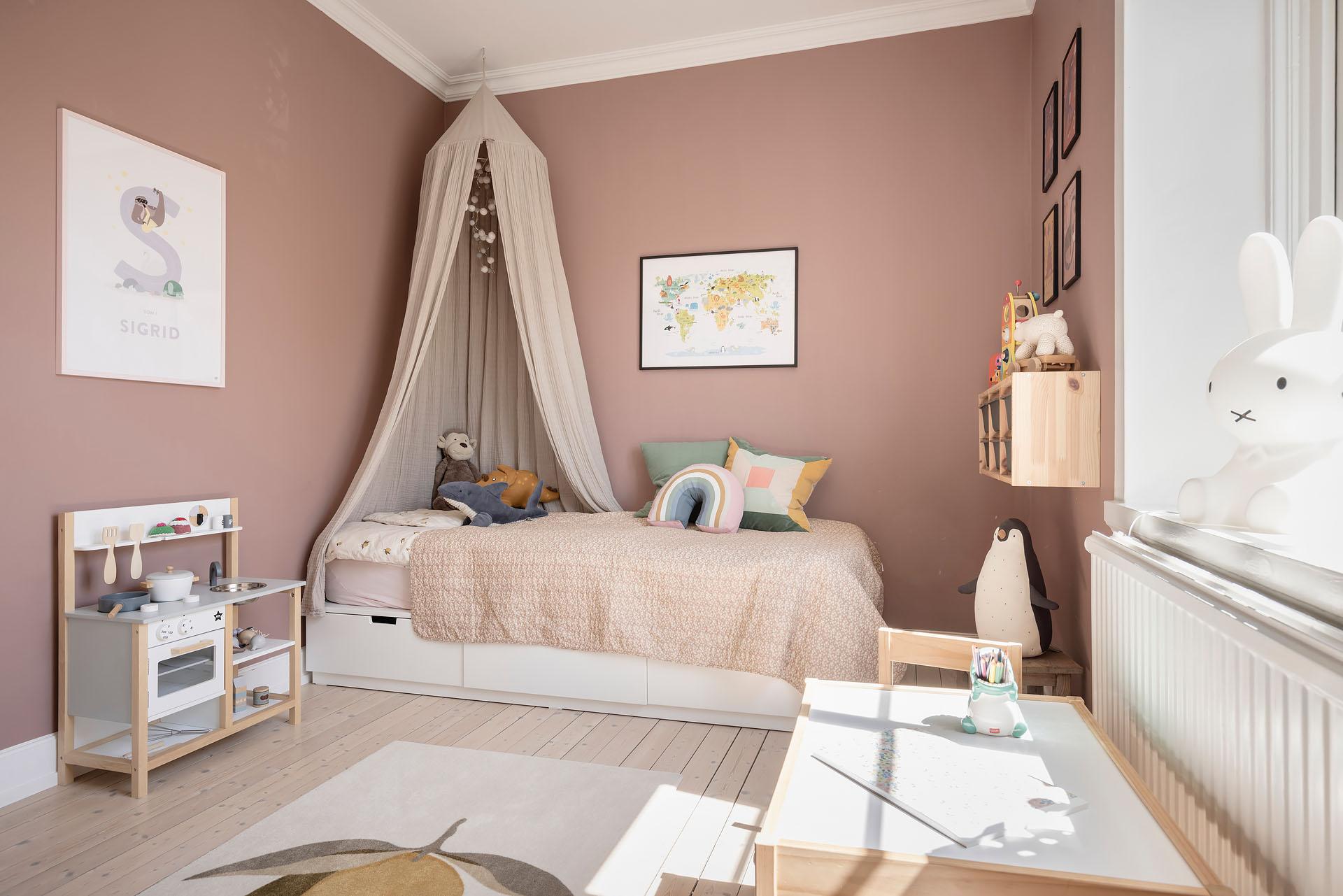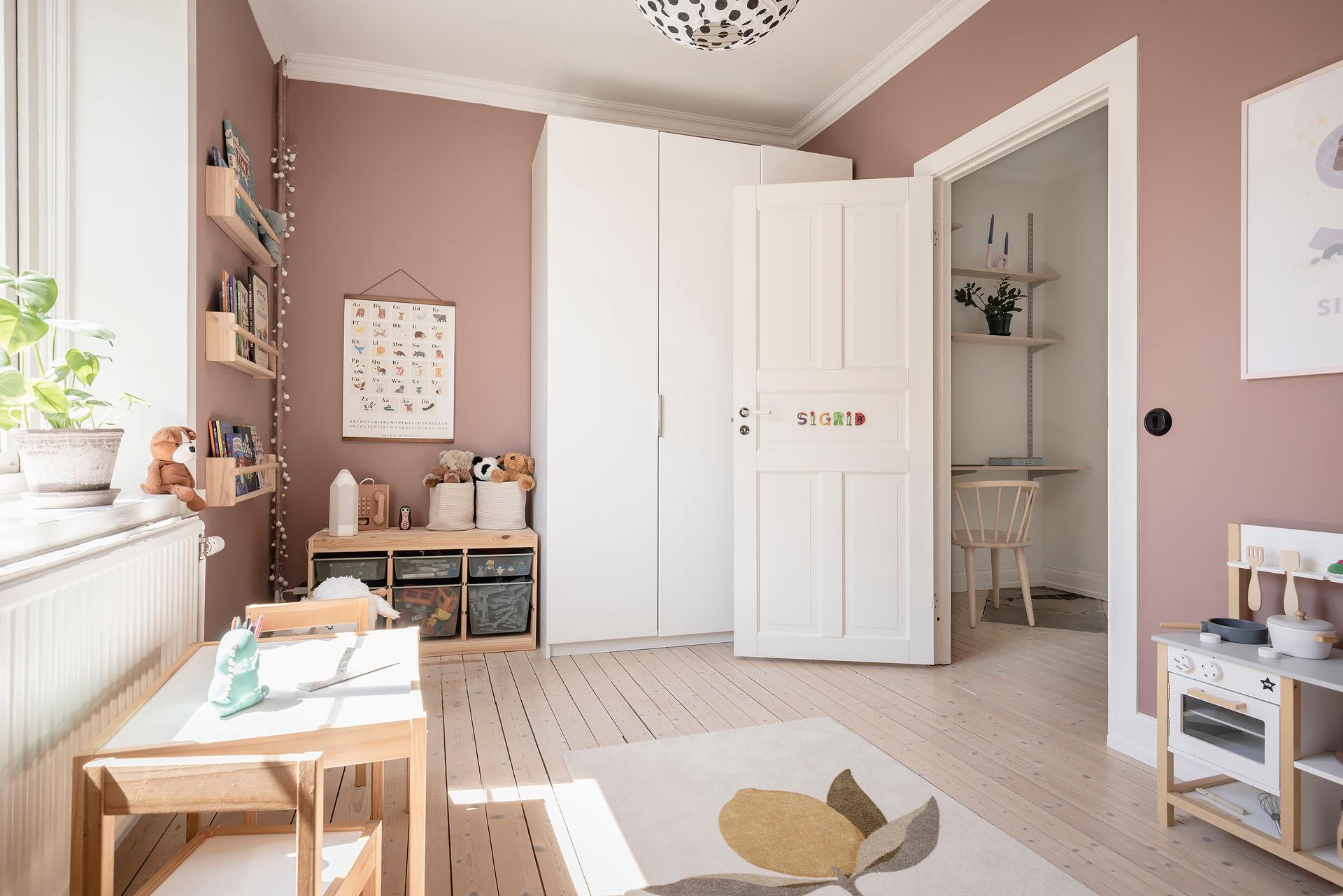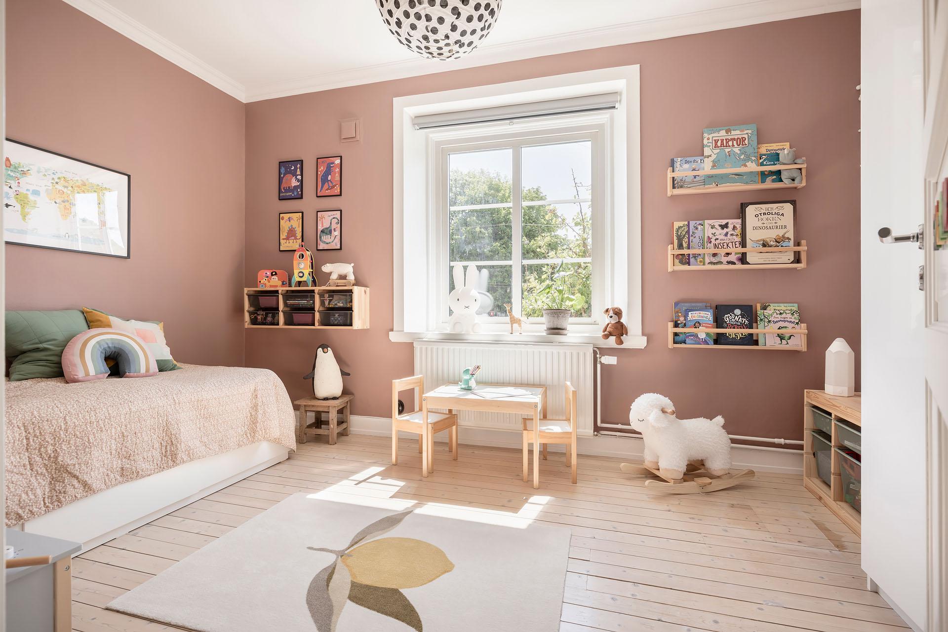 Lägenhetens nedervåning disponeras med två bra sovrum med plats för dubbelsäng. Förvaringsmöjligheterna är goda, och förutom en inbyggd dubbelgarderob har det nuvarande föräldrasovrummet även en platsbyggd bokhylla med stängda bänkskåp. I det rum som idag används som barnrum finns en fristående tredelad garderob. Brädgolvet är framtaget och väggarna målade i mjuka kulörer.