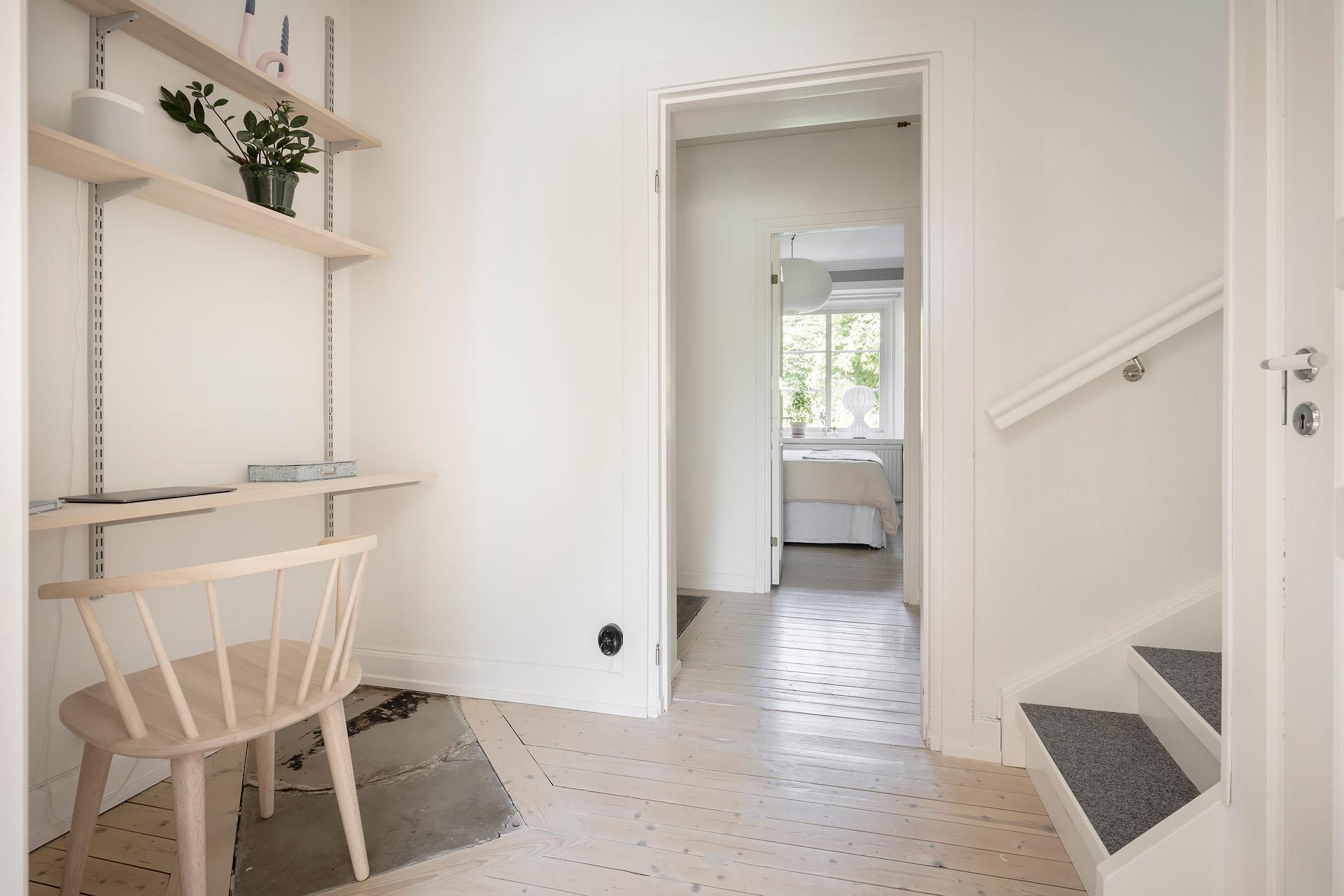 En tvådelad inre hall binder samman nedervåningen. Det finns plats för att inreda ett hemmakontor och bra förvaringsmöjligheter erbjuds i form av tre garderober, varav en inbyggd under trappan upp till övervåningen. Brädgolvet är framtaget och väggarna målade i vitt.