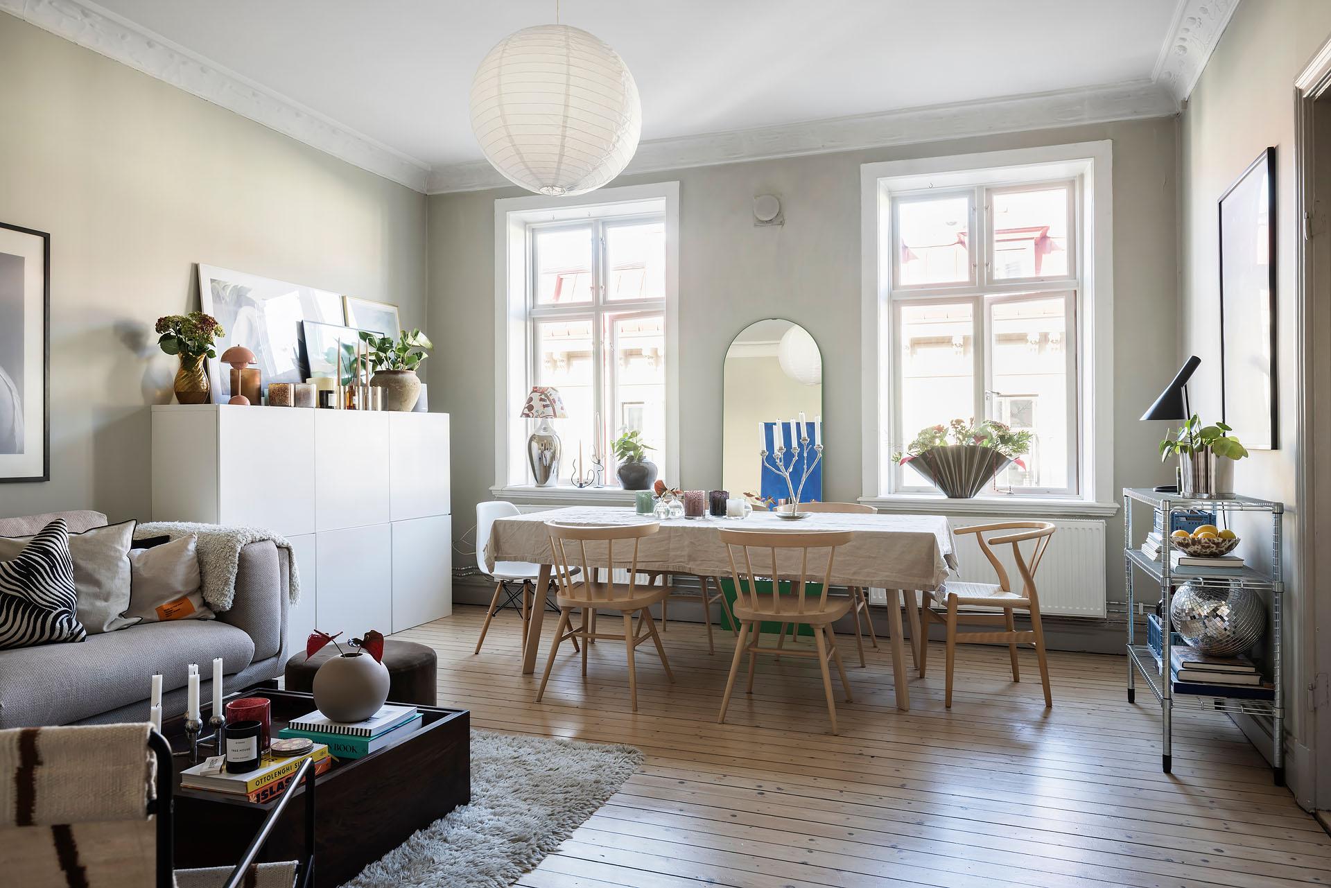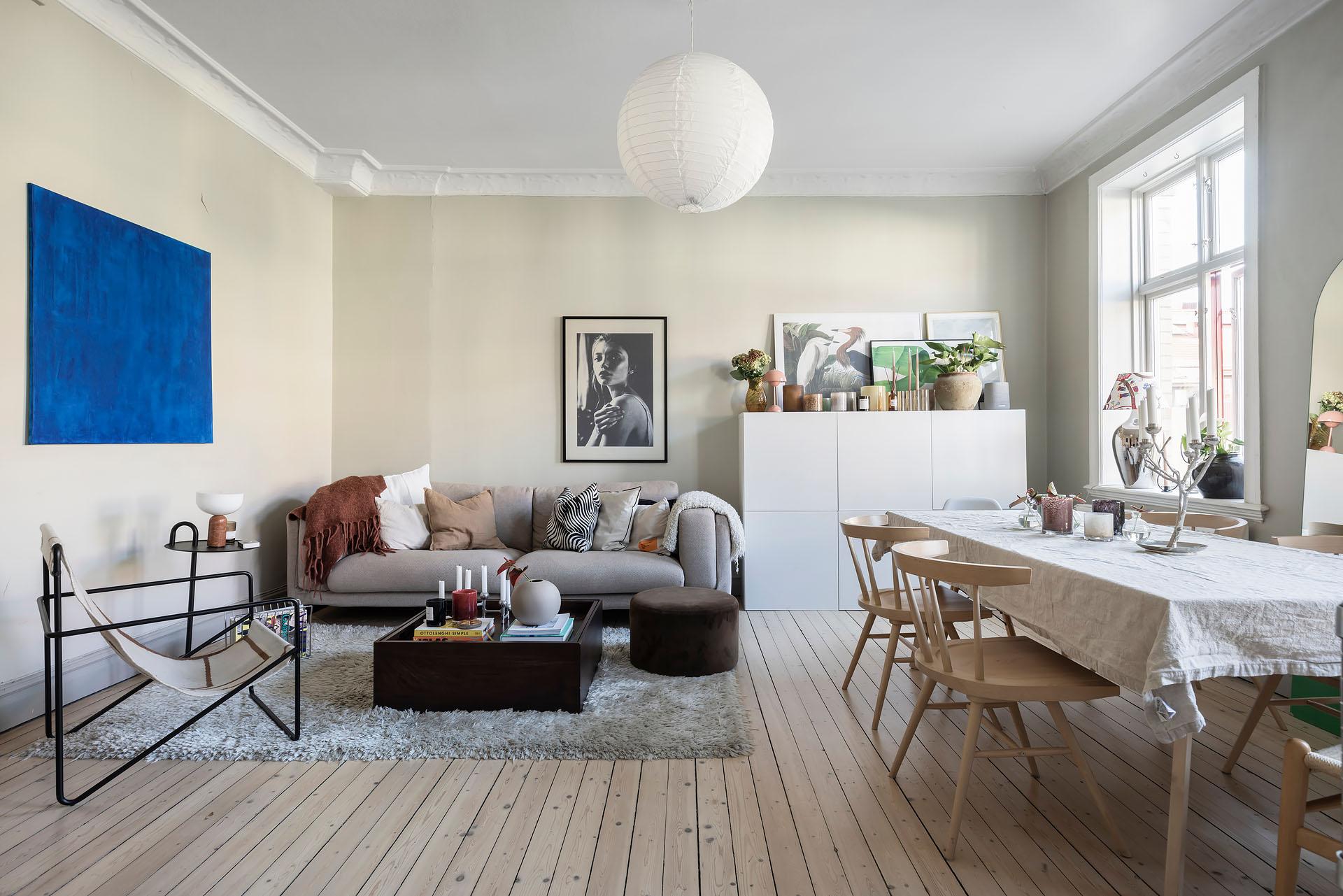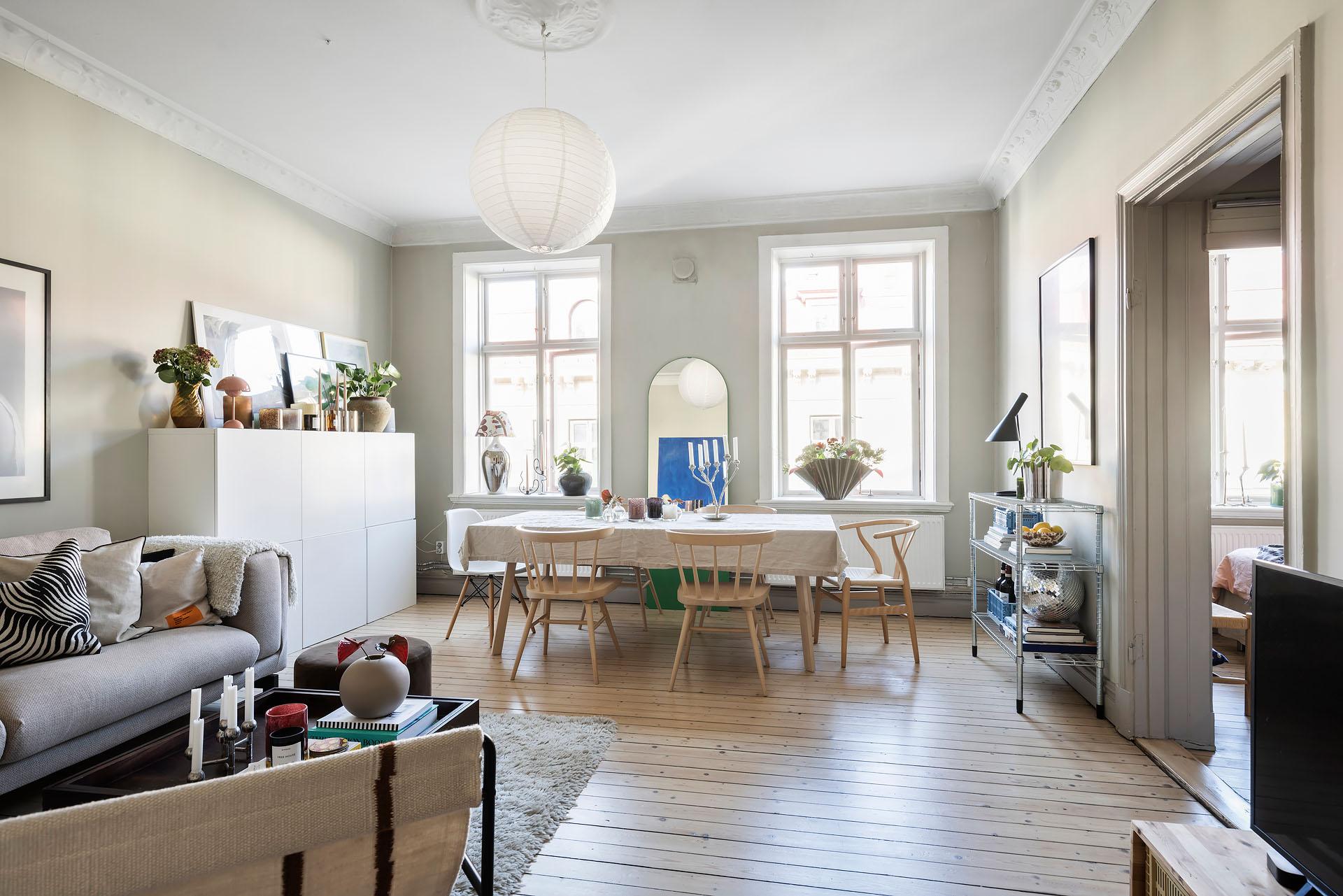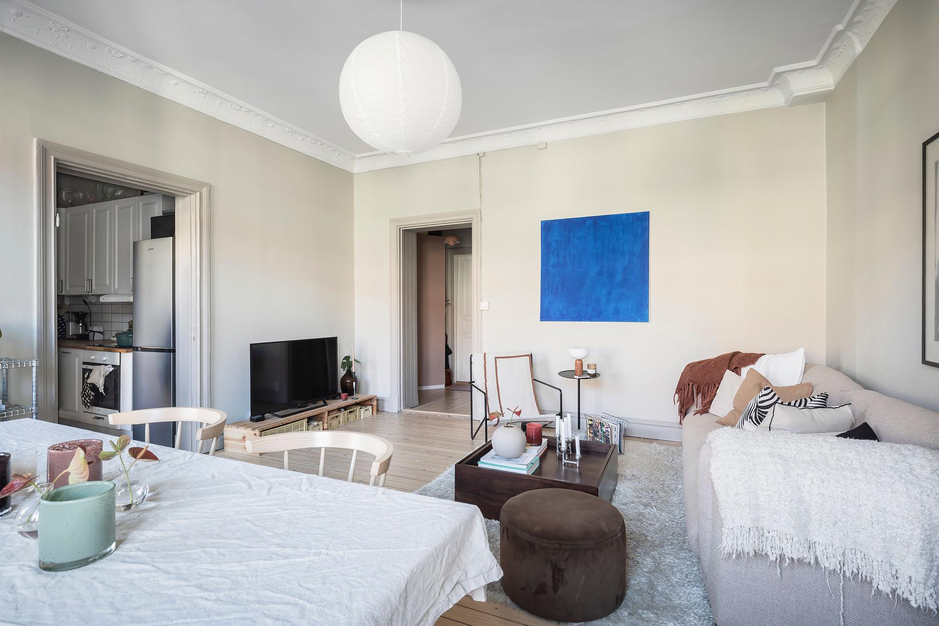 Rakt fram från hallen nås det pampiga och oerhört vackra vardagsrummet som bjuder på vacker takstuckatur, takrosett och drygt tre meter i takhöjd. De två högresta fönstren mot gatan låter ljuset flöda in och tillsammans med det slipade brädgolvet och de beigemålade väggarna skapas en iögonfallande och luftig atmosfär. Här ryms både soffgrupp, hyllsystem och ett stort matsalsbord med plats för många gäster.