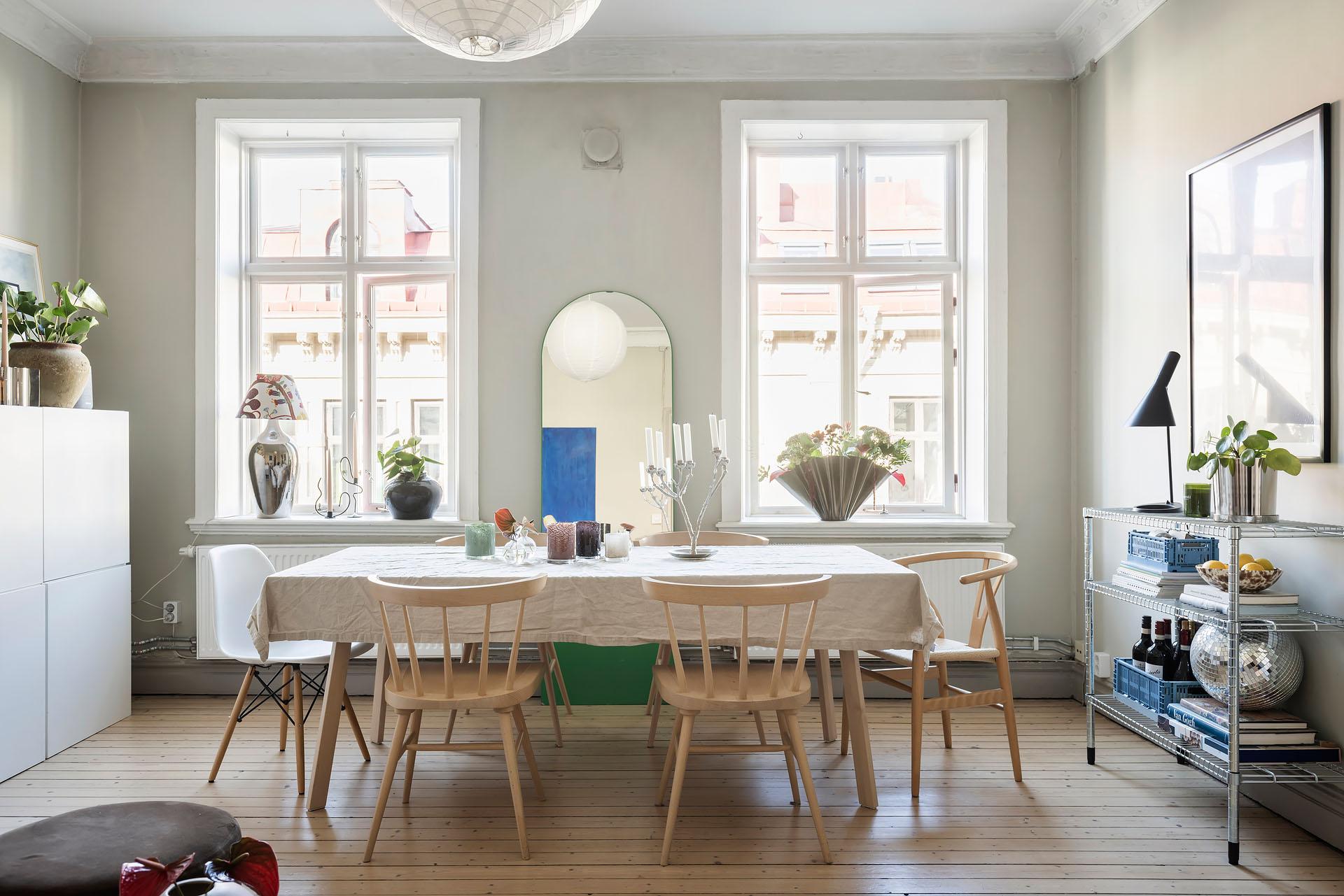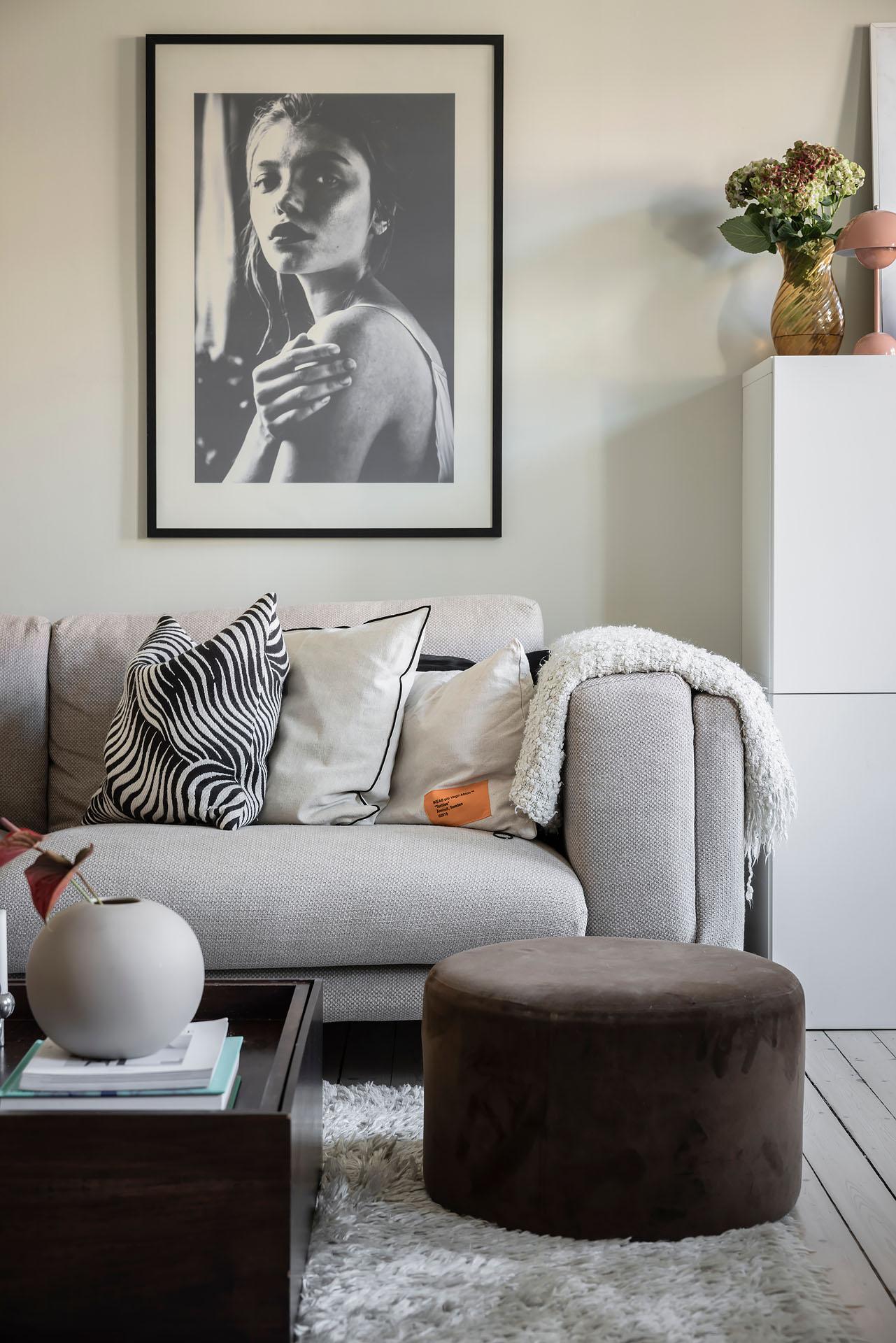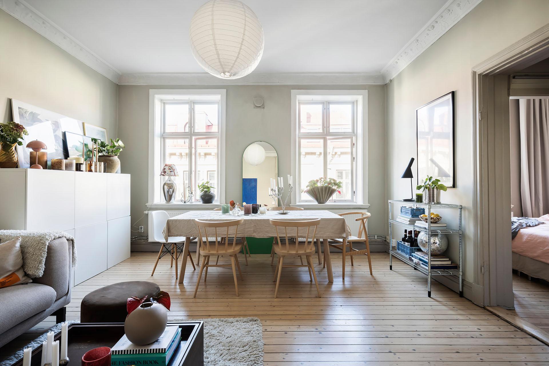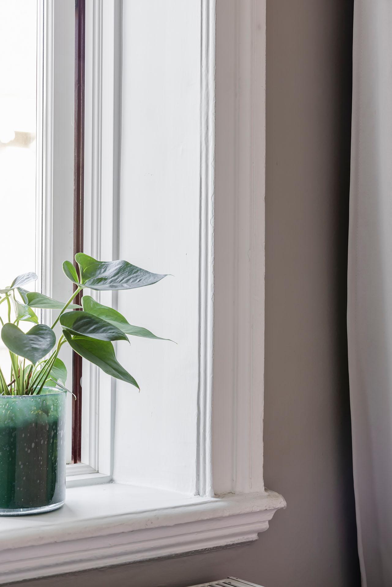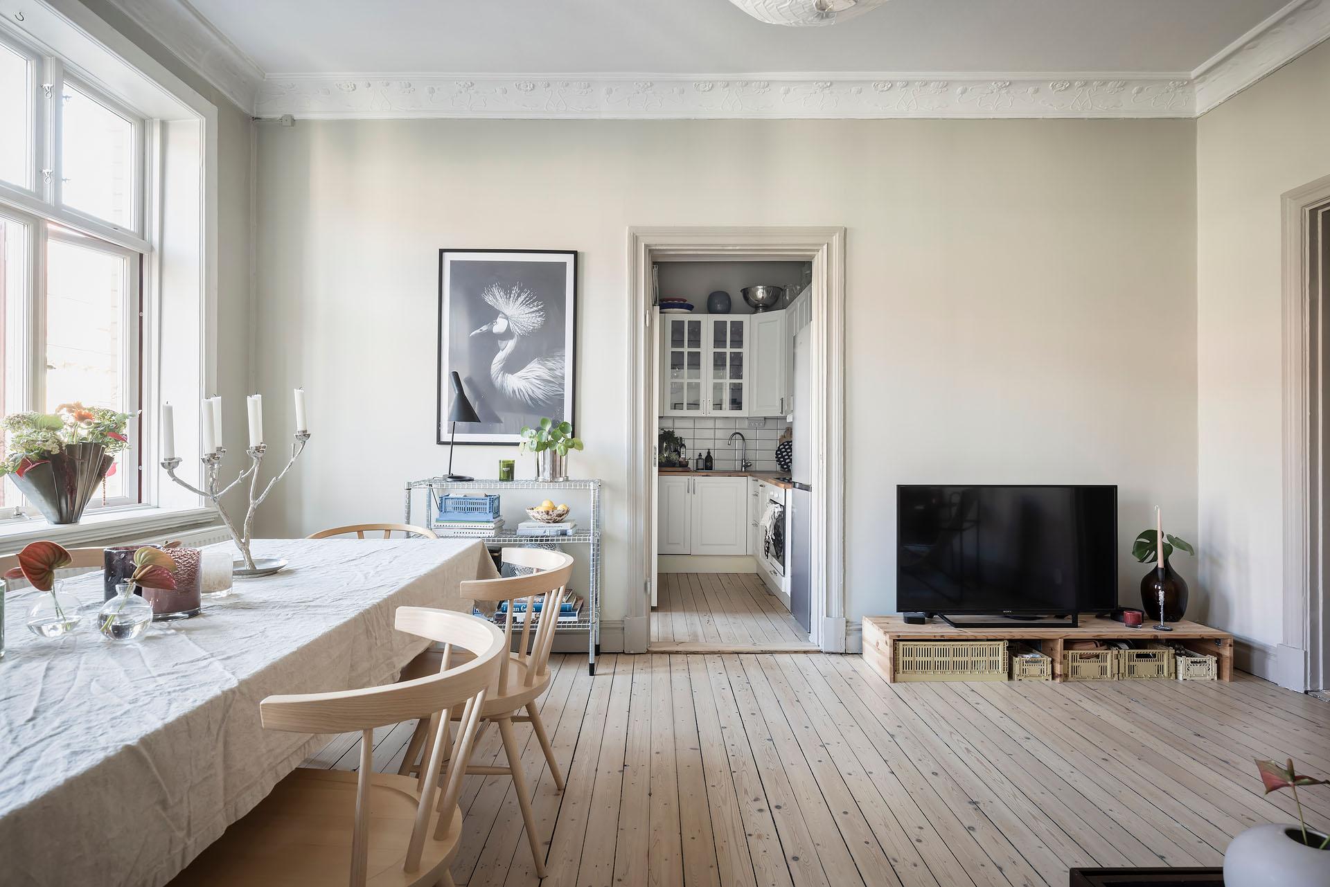 Rakt fram från hallen nås det pampiga och oerhört vackra vardagsrummet som bjuder på vacker takstuckatur, takrosett och drygt tre meter i takhöjd. De två högresta fönstren mot gatan låter ljuset flöda in och tillsammans med det slipade brädgolvet och de beigemålade väggarna skapas en iögonfallande och luftig atmosfär. Här ryms både soffgrupp, hyllsystem och ett stort matsalsbord med plats för många gäster.