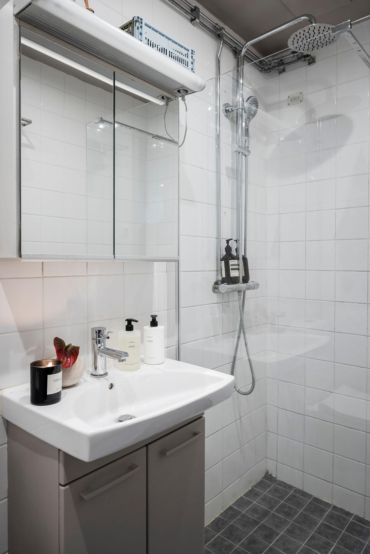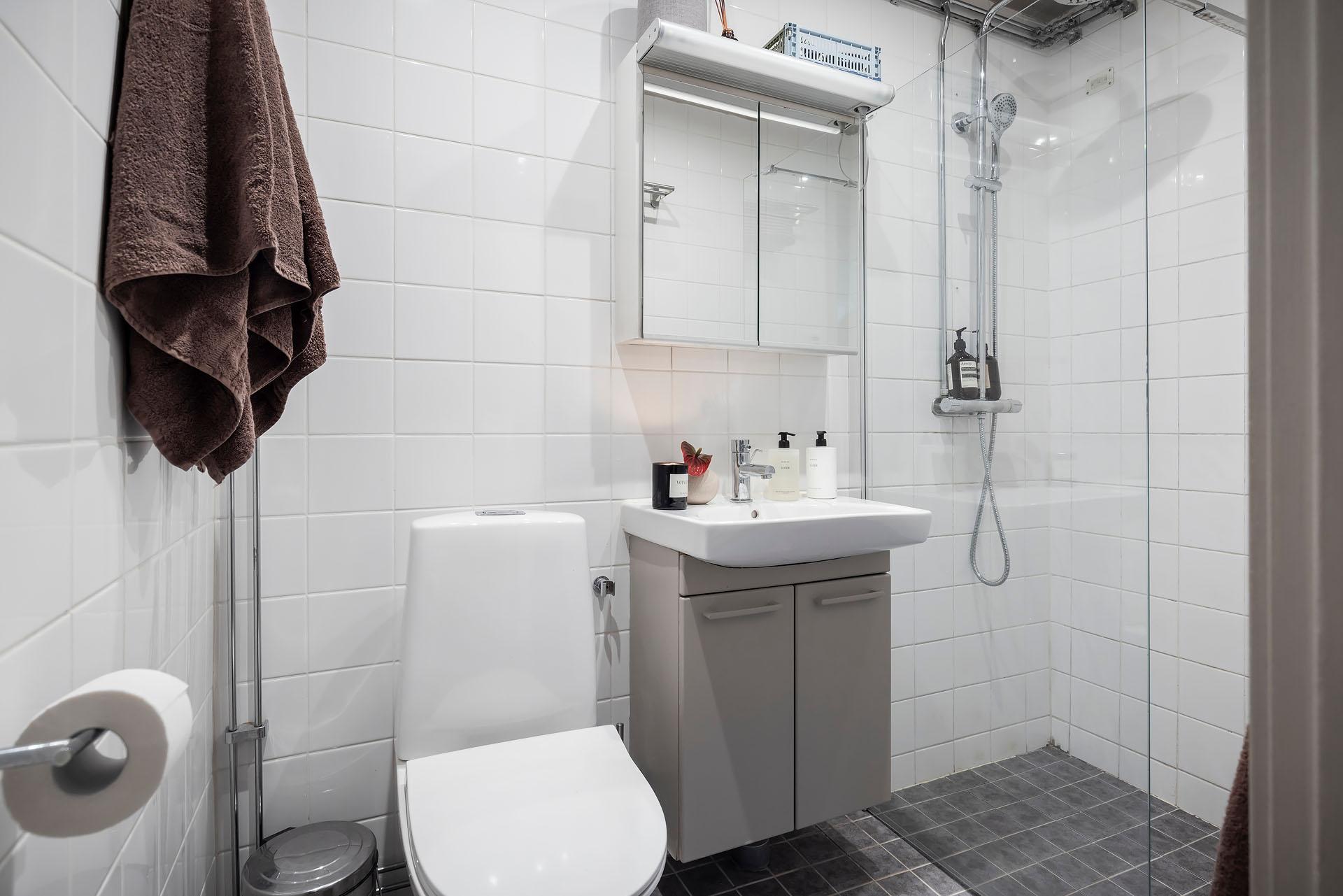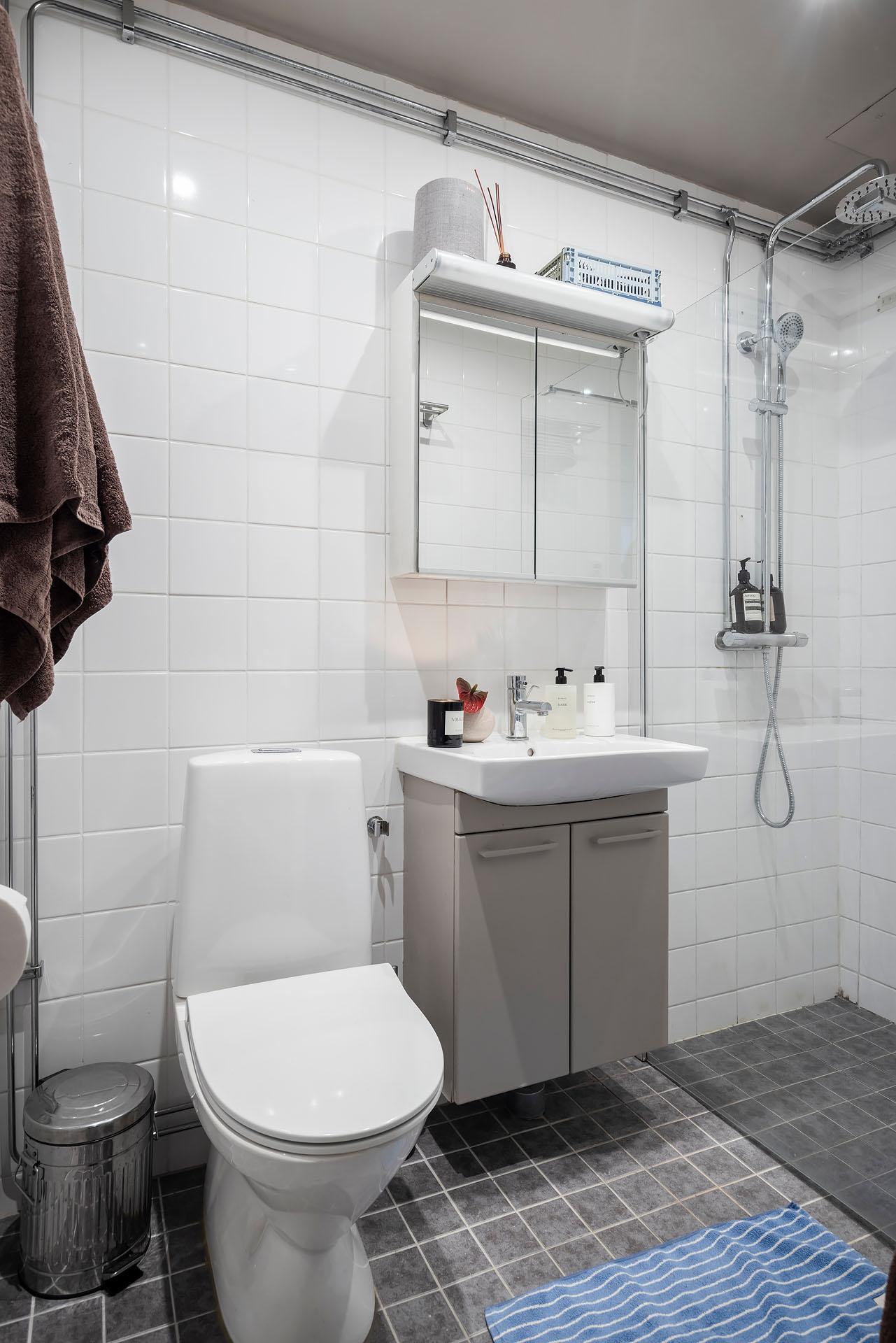 Stilrent och välplanerat badrum med vita kaklade väggar, grå klinker och golvvärme. Här finns dusch, wc, handfat med kommod och spegelskåp.