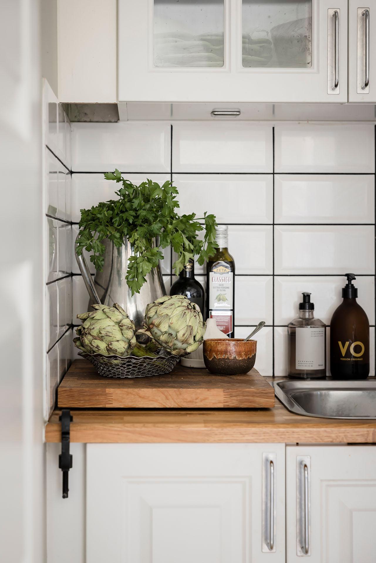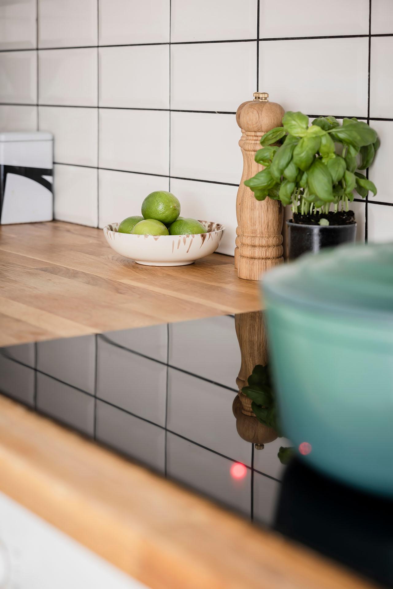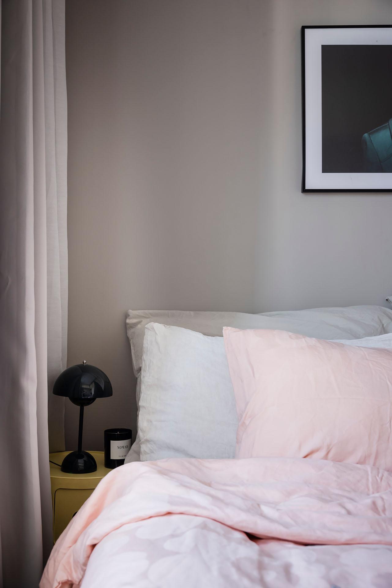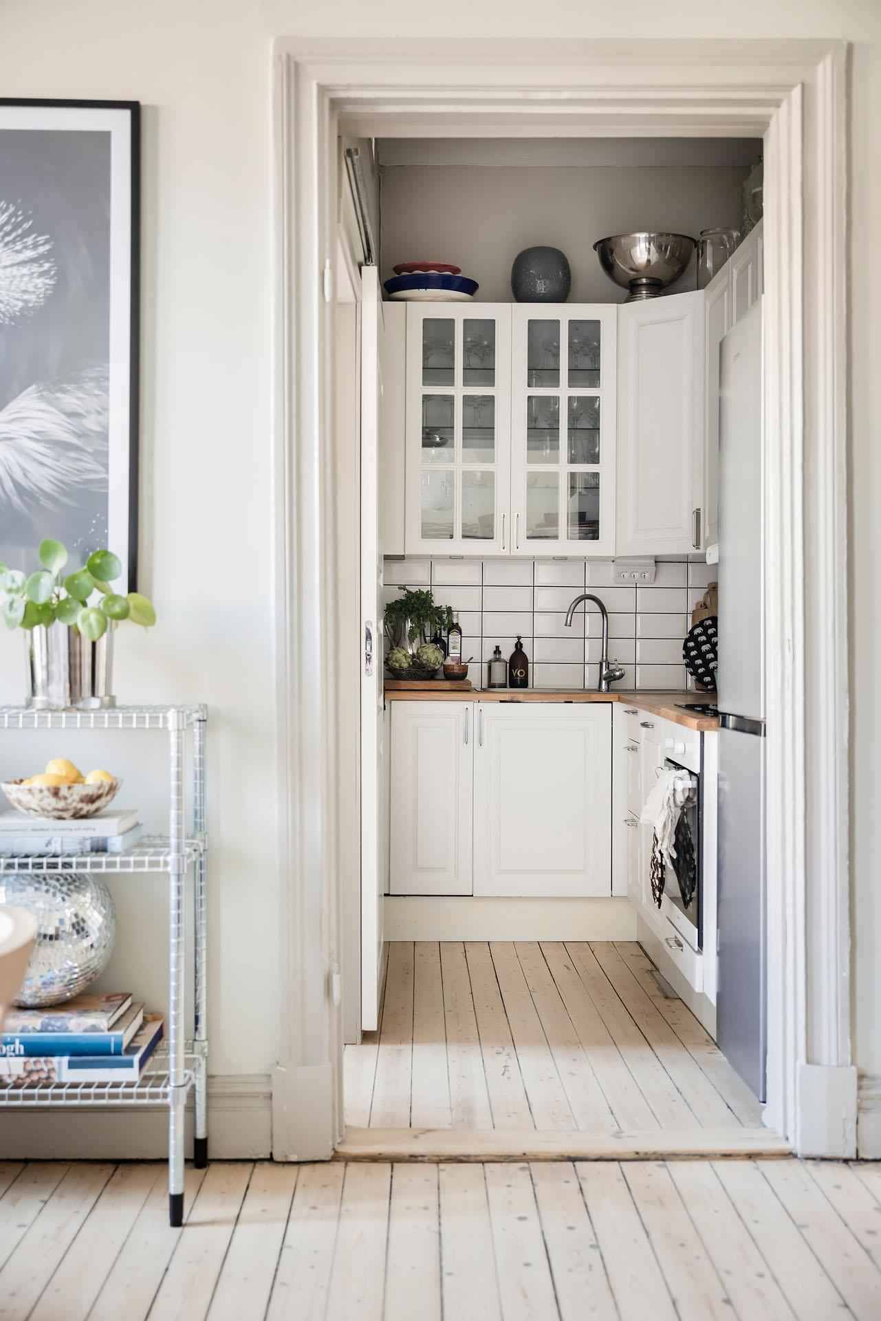 Köket har på ett genomtänkt sätt delats av med en vägg med glas upptill samt en skjutdörr, vilket ger en naturlig och inbjudande sovdel med plats för en dubbelsäng.