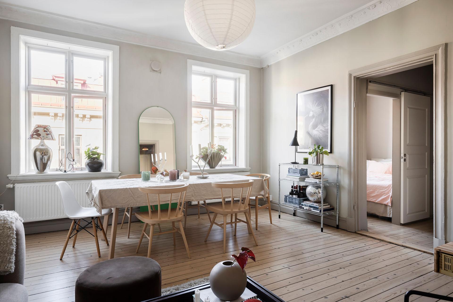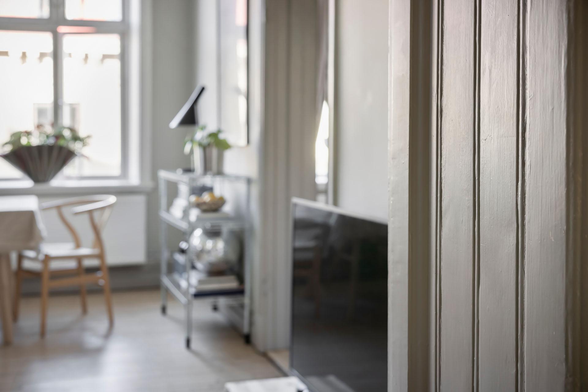 På fjärde våningen, högst upp i huset, väntar ett ljuvligt hem som andas personlighet och trivsel. En effektiv planlösning gör att varje kvadratmeter används på bästa sätt. Slipade brädgolv i original, väl tilltagen takhöjd och vackra fönster i trä med smäckra karmar skapar ett fantastiskt ljusflöde.