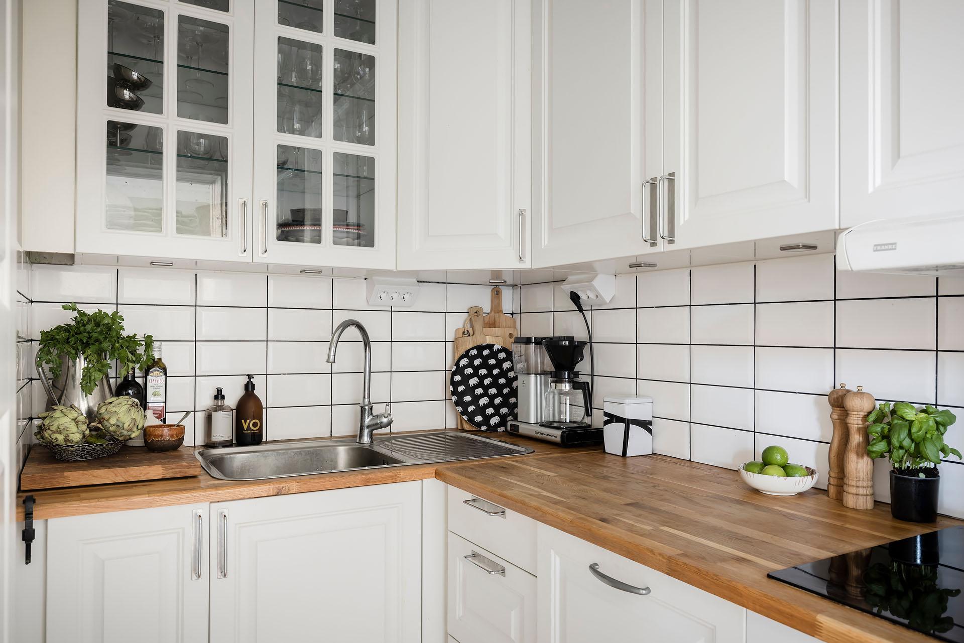 Ett charmigt kök med karaktär– utformat i vinkel och utrustat med kyl/frys, ugn, häll, diskmaskin och diskho. De ljusa skåpen harmonierar vackert med de framtagna brädgolven i original och skapar en tidlös, trivsam känsla.