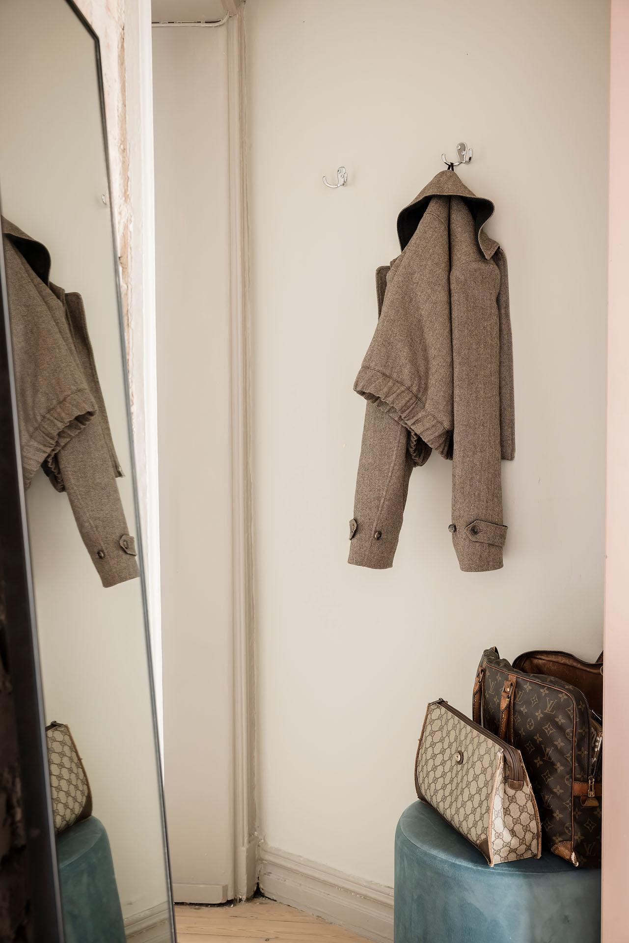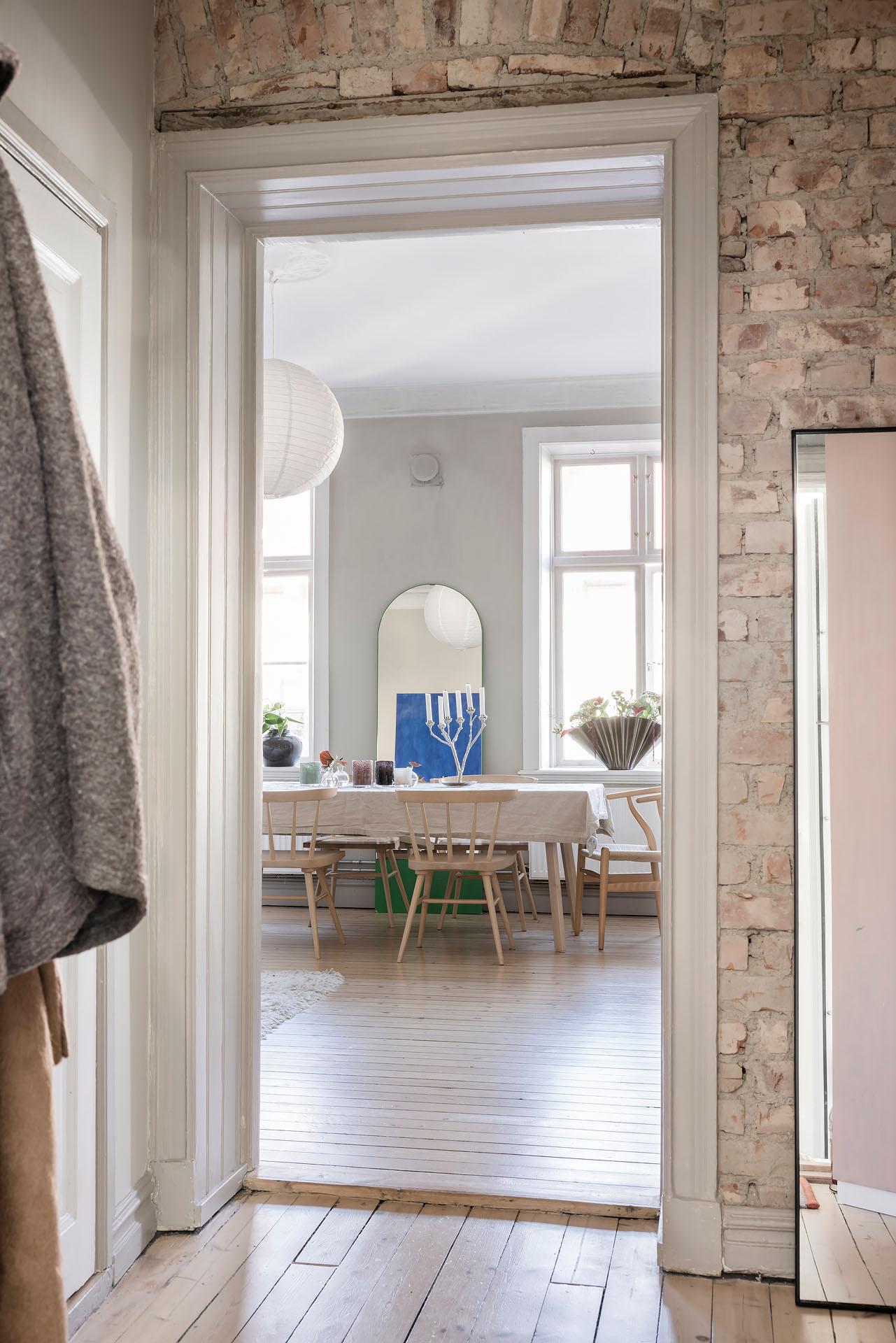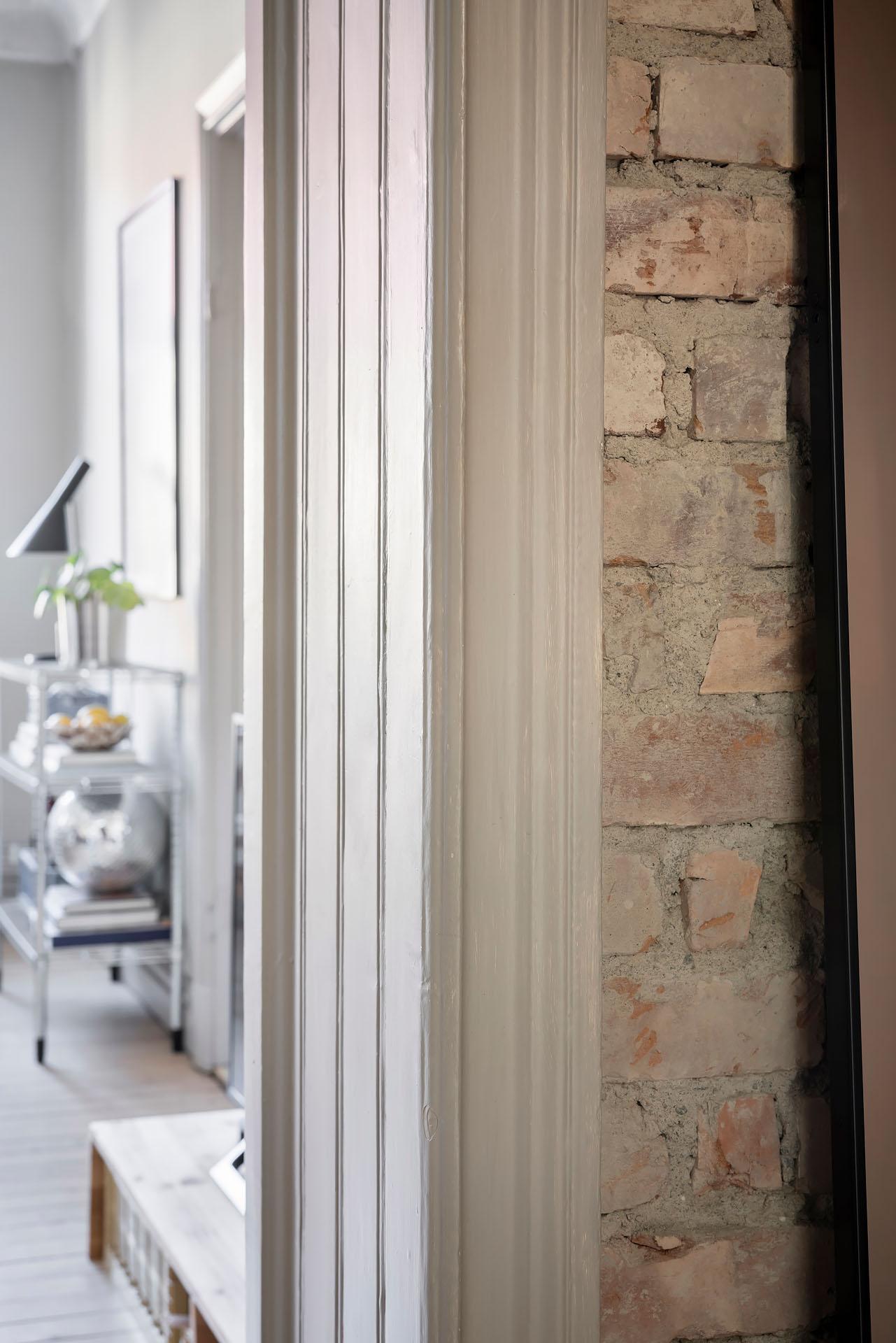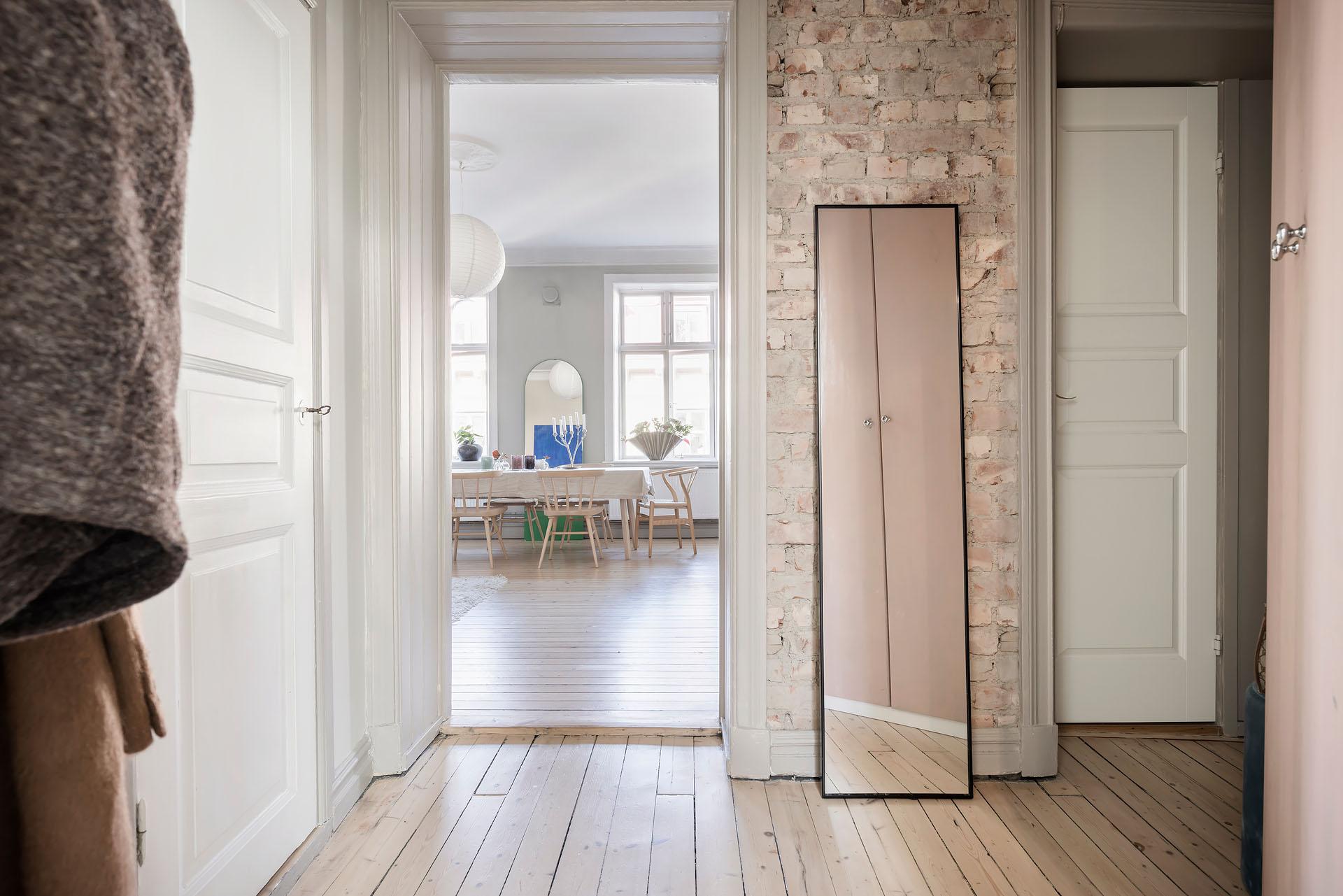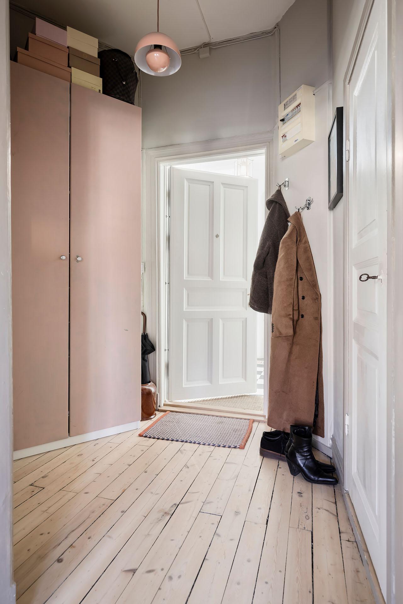 Välkommen in! Här möts du av brädgolv i original, framtagen tegelvägg och generös takhöjd som ger ett luftigt intryck. Direkt till höger finns gott om plats för avhängning samt en praktisk klädkammare med förvånansvärt mycket förvaring.