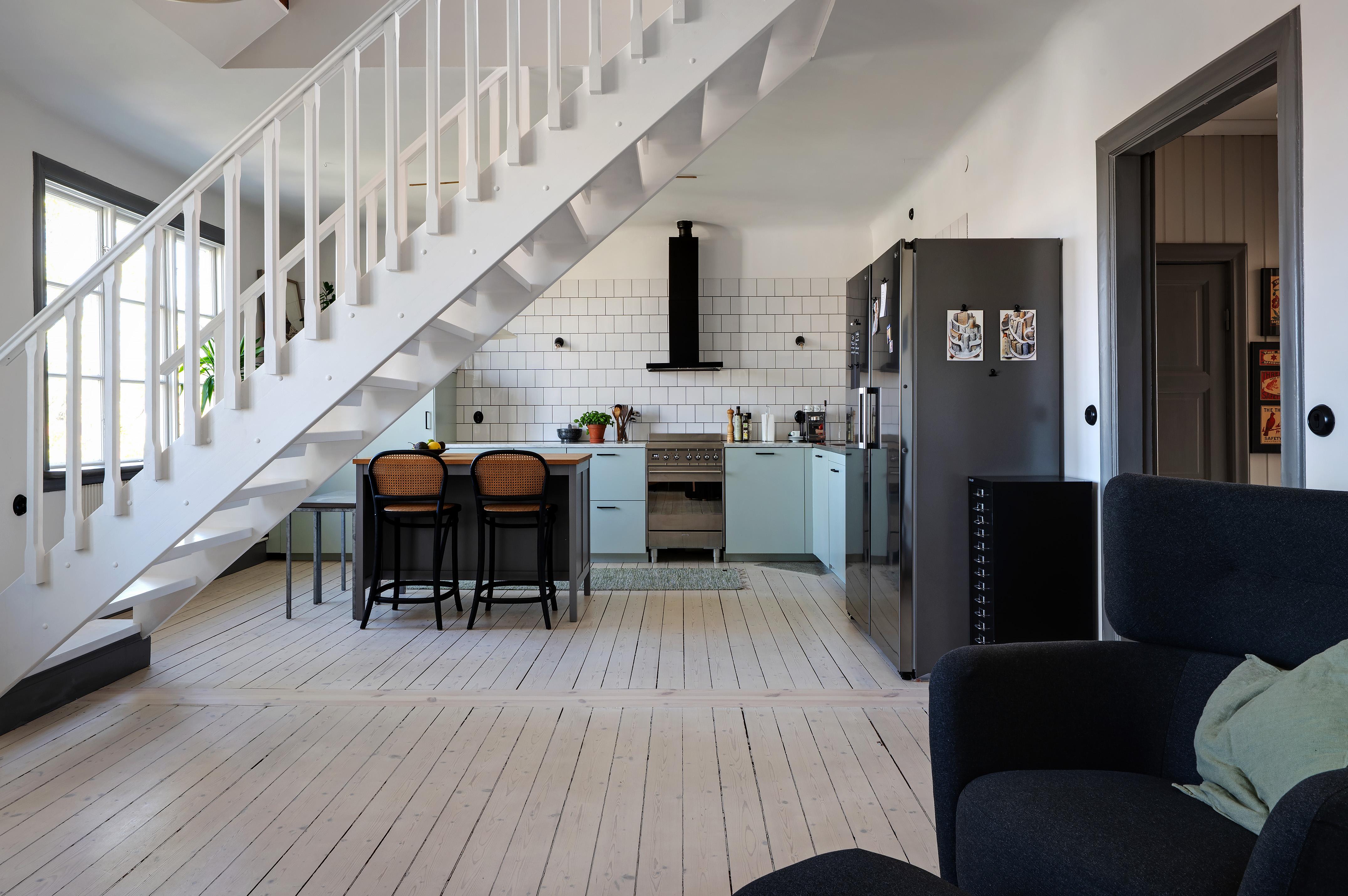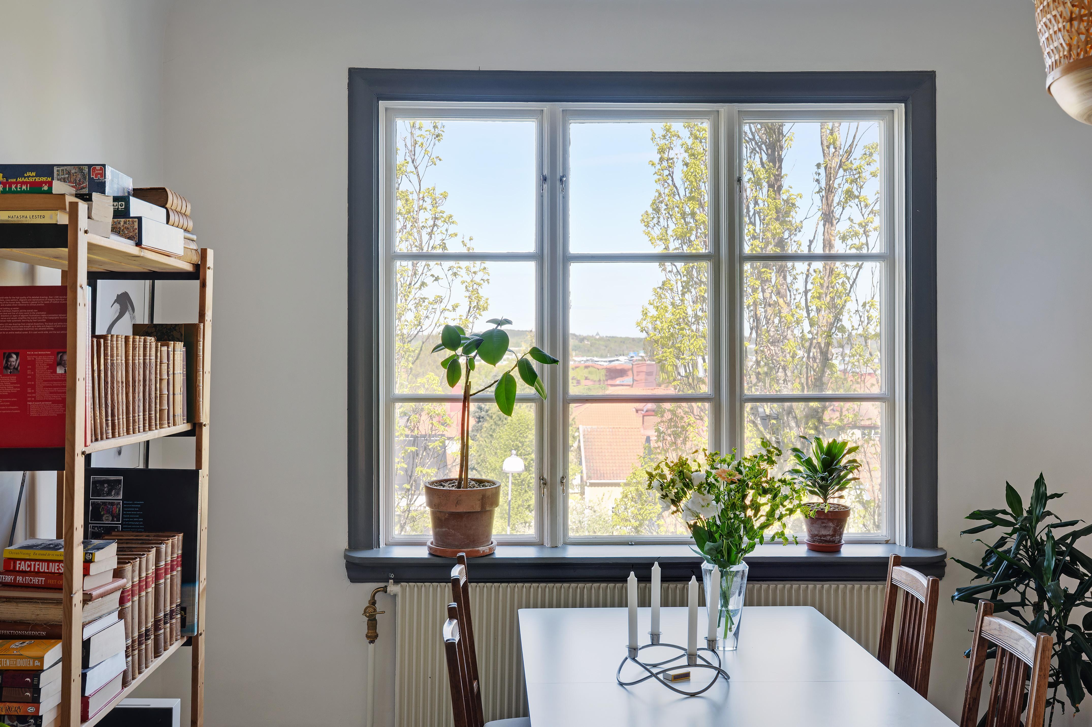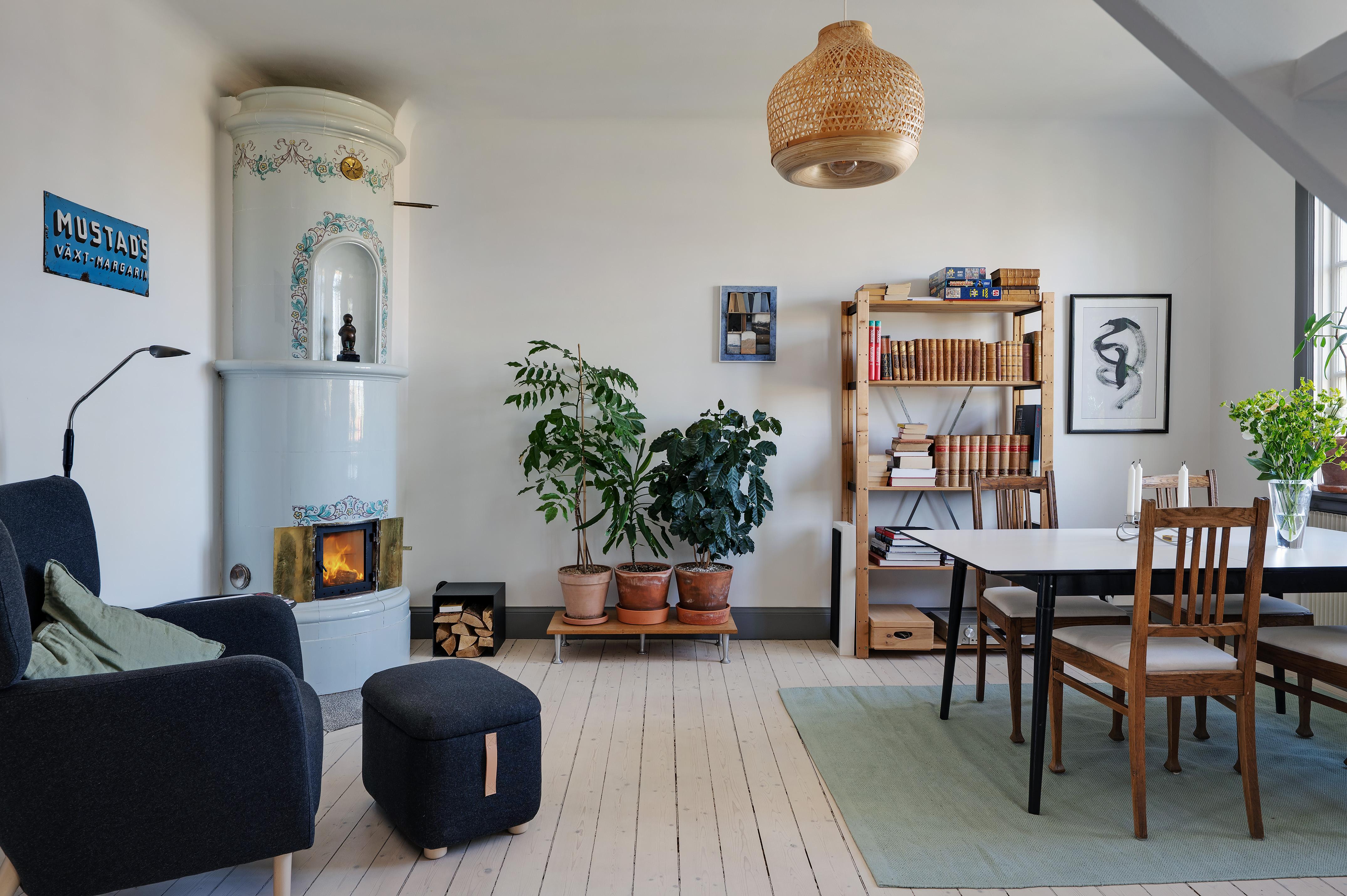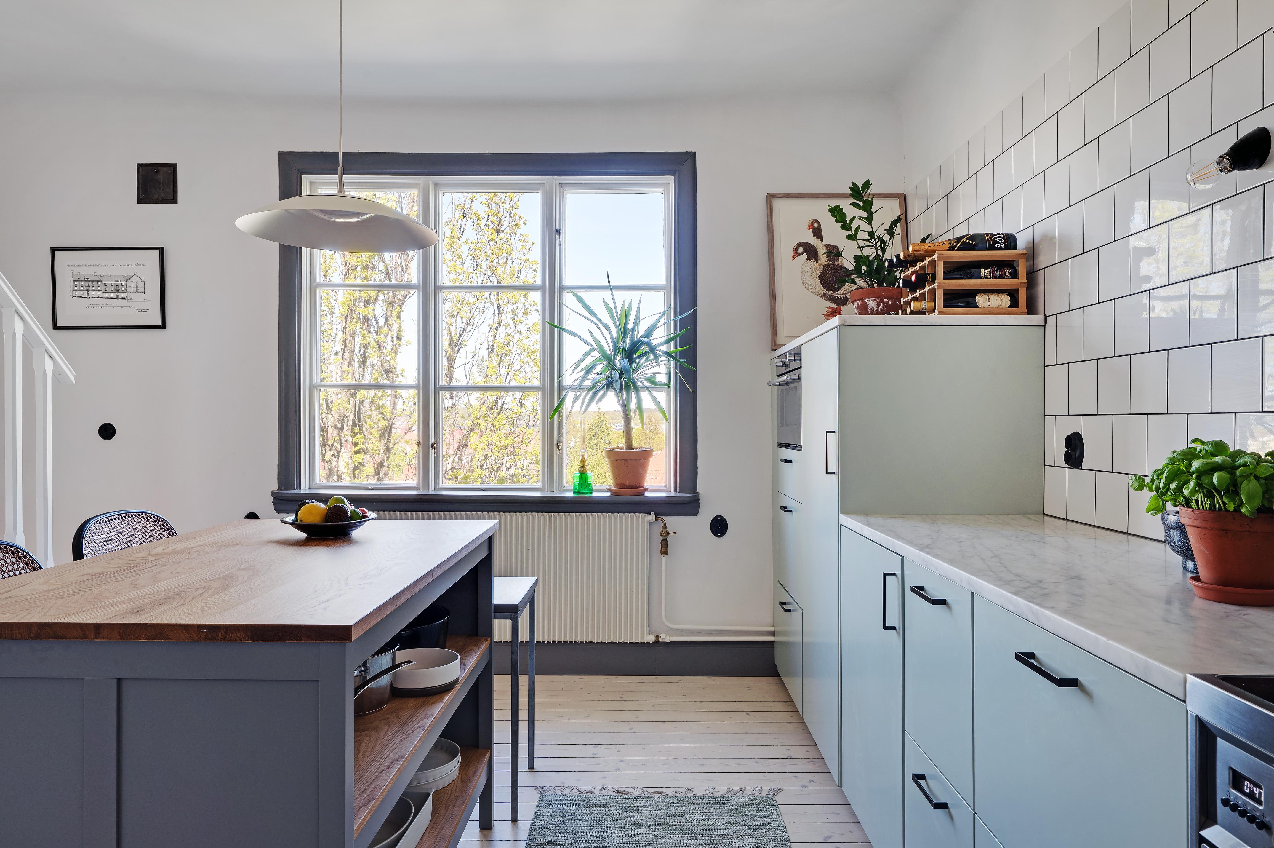 Köket och matsalen förenas i en öppen planlösning med härligt ljusinsläpp från två stora treluftsfönster i nordväst. De munblåsta fönsterglasen bryter kvällssolens strålar på ett vackert sätt. På denna sida ligger lägenheten fritt, och den milsvida utsikten är hänförande. I matsalen – med en ljuvlig och varsamt renoverad och provtryckt kakelugn (gjord 2024 med nytt rör och ominstallerad krona) som det går alldeles utmärkta att elda i – finns det plats för att duka upp till middagar med många gäster. Det stora köket har gott om utrymme för antingen en matgrupp eller en köksö för social matlagning. Det är rejält tilltaget med både bänkyta och förvaring, och köksskåpen har ljusblå luckor och lådor med stilrena svarta handtag. Ovanför spisen, diskbänken och arbetsbänkarna i ljus marmor letar sig vitt kakel i halvförband nästan hela vägen upp till taket. Liksom i övriga lägenheten är skicket väldigt gott, och i samband med uppfräschningen av köket i fjol installerades ny fläkt, ny diskmaskin (Siemens) och ny kyl/frys side-by-side (LG). Kanal drogs för fläkten med utblås separat på taket. Brädgolvet är framtaget och väggarna målade i vitt.
