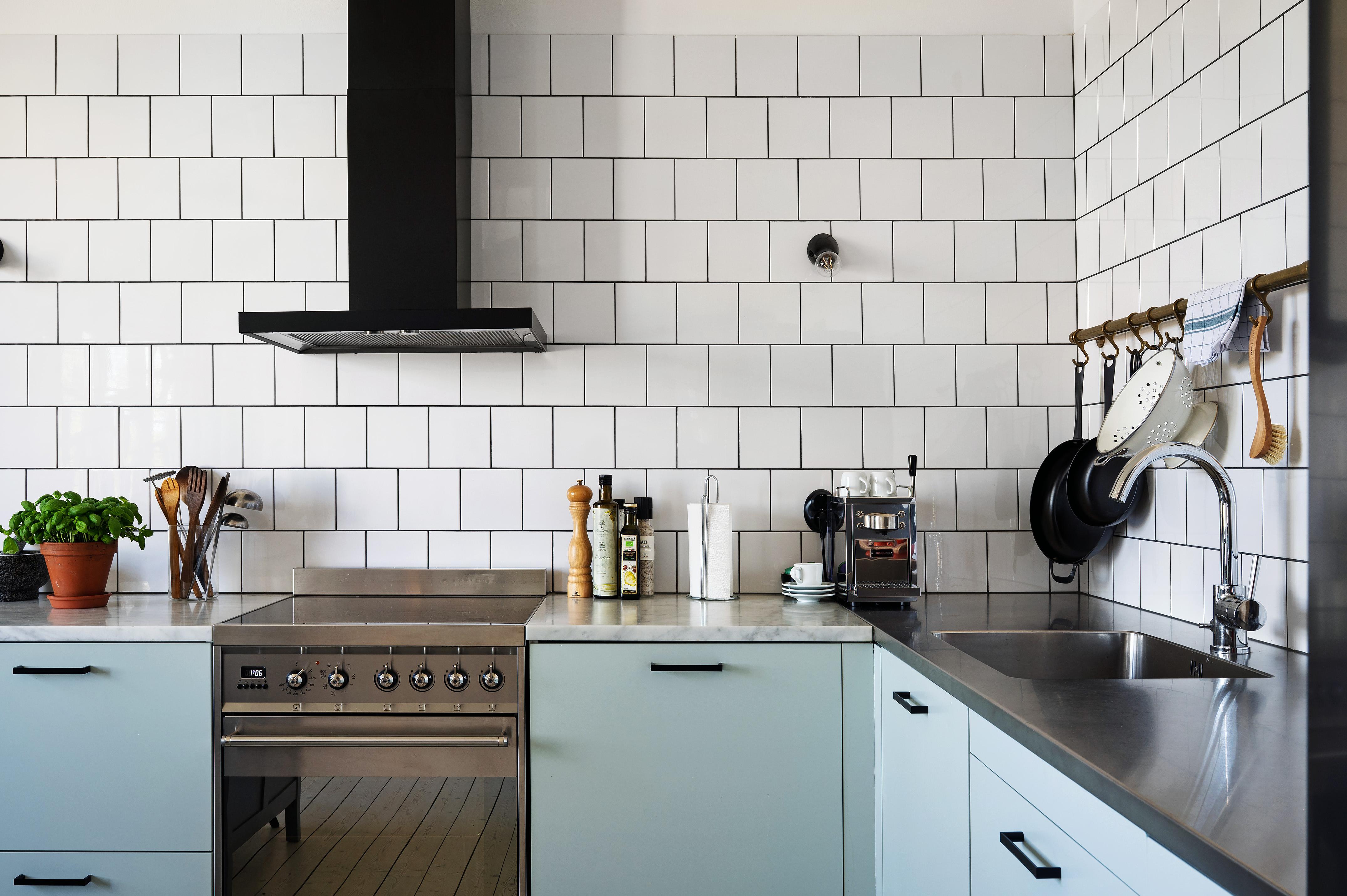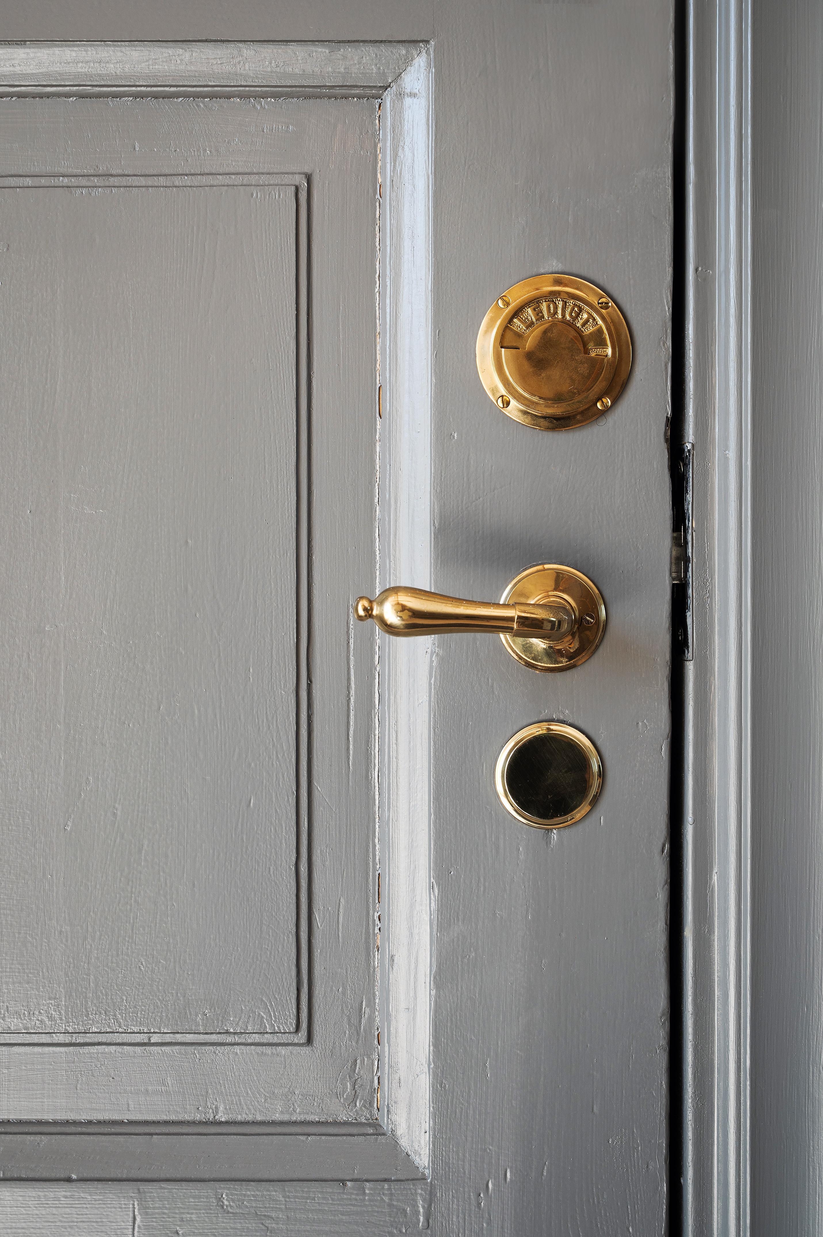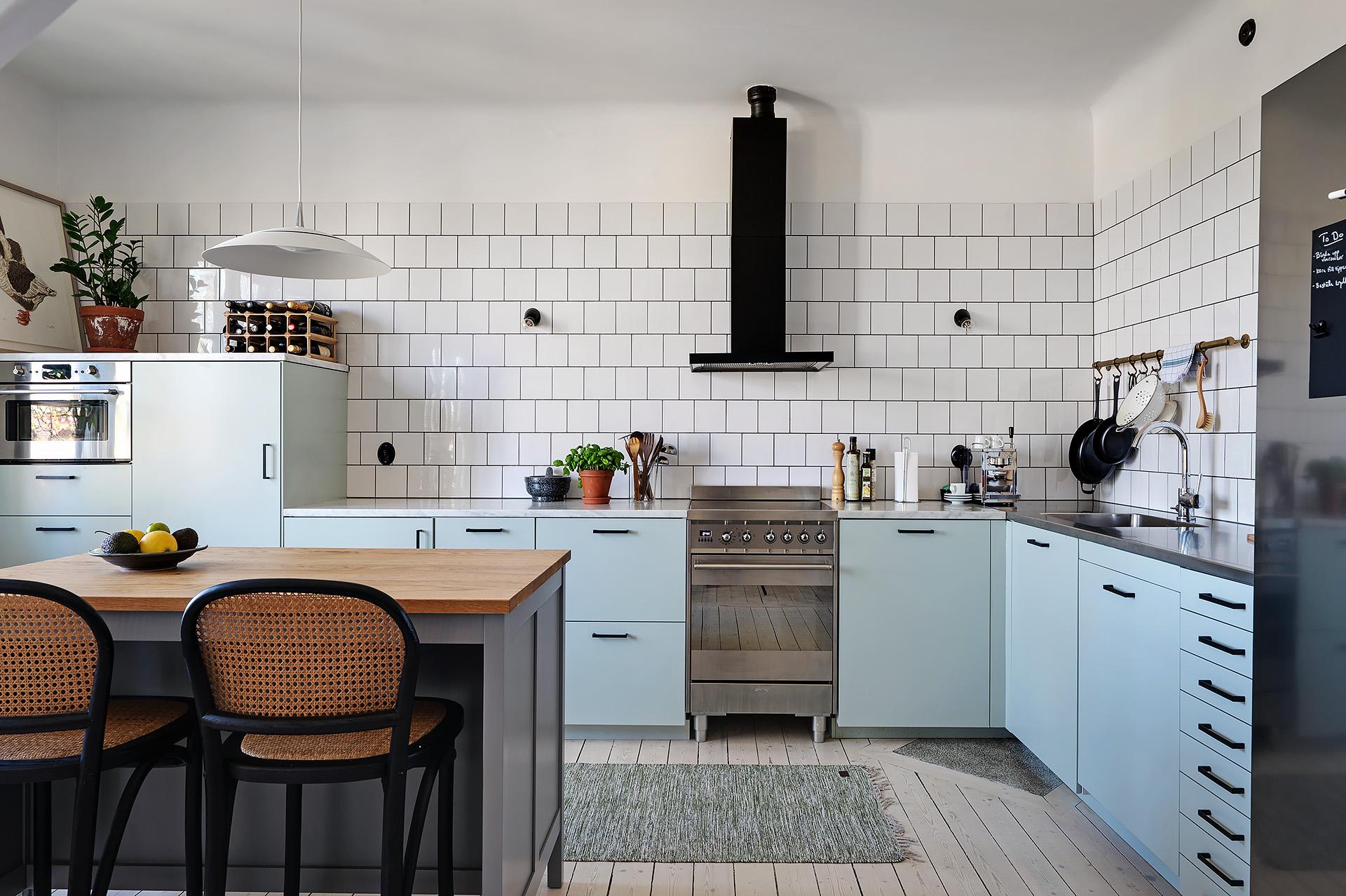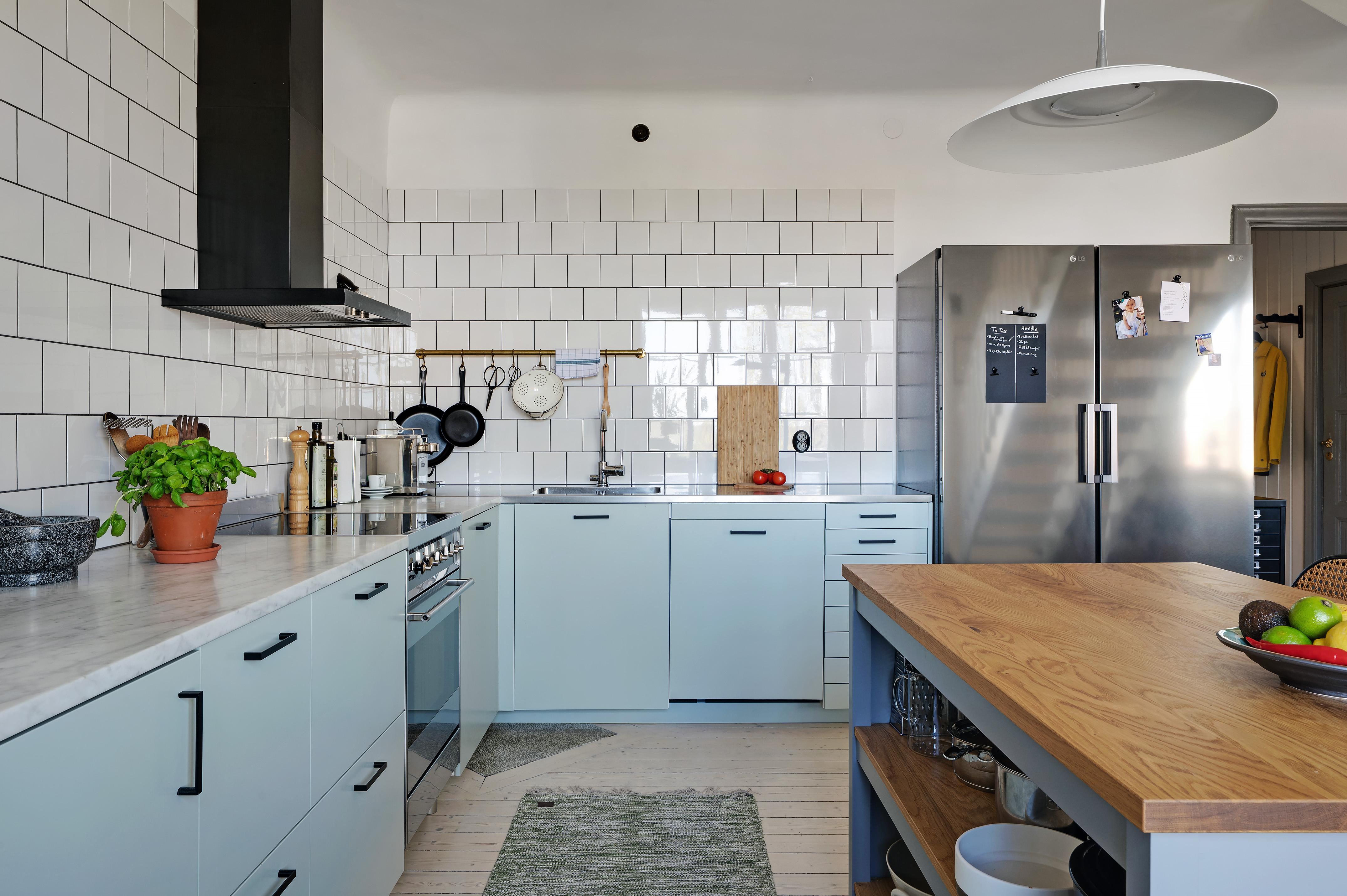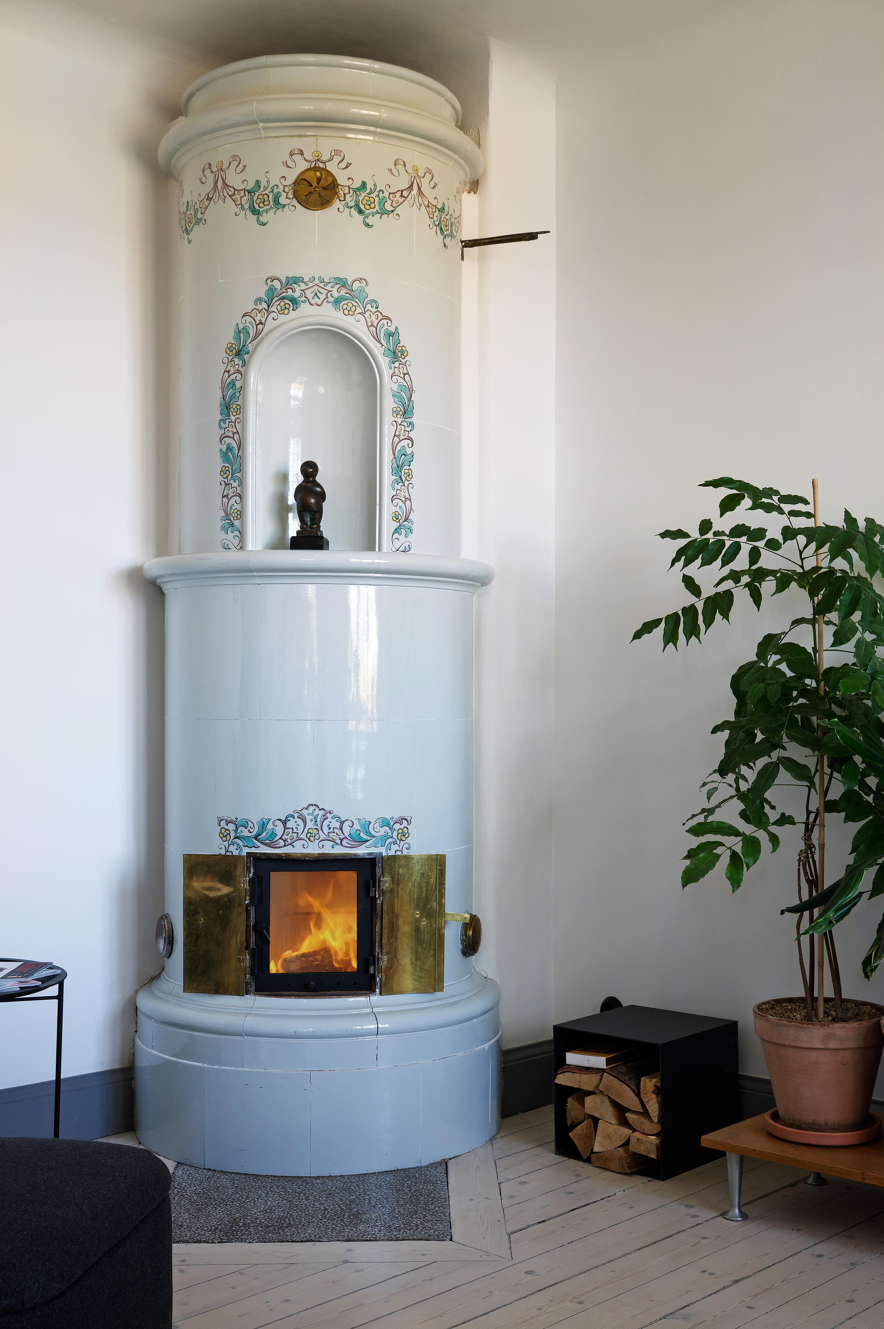 Köket och matsalen förenas i en öppen planlösning med härligt ljusinsläpp från två stora treluftsfönster i nordväst. De munblåsta fönsterglasen bryter kvällssolens strålar på ett vackert sätt. På denna sida ligger lägenheten fritt, och den milsvida utsikten är hänförande. I matsalen – med en ljuvlig och varsamt renoverad och provtryckt kakelugn (gjord 2024 med nytt rör och ominstallerad krona) som det går alldeles utmärkta att elda i – finns det plats för att duka upp till middagar med många gäster. Det stora köket har gott om utrymme för antingen en matgrupp eller en köksö för social matlagning. Det är rejält tilltaget med både bänkyta och förvaring, och köksskåpen har ljusblå luckor och lådor med stilrena svarta handtag. Ovanför spisen, diskbänken och arbetsbänkarna i ljus marmor letar sig vitt kakel i halvförband nästan hela vägen upp till taket. Liksom i övriga lägenheten är skicket väldigt gott, och i samband med uppfräschningen av köket i fjol installerades ny fläkt, ny diskmaskin (Siemens) och ny kyl/frys side-by-side (LG). Kanal drogs för fläkten med utblås separat på taket. Brädgolvet är framtaget och väggarna målade i vitt.