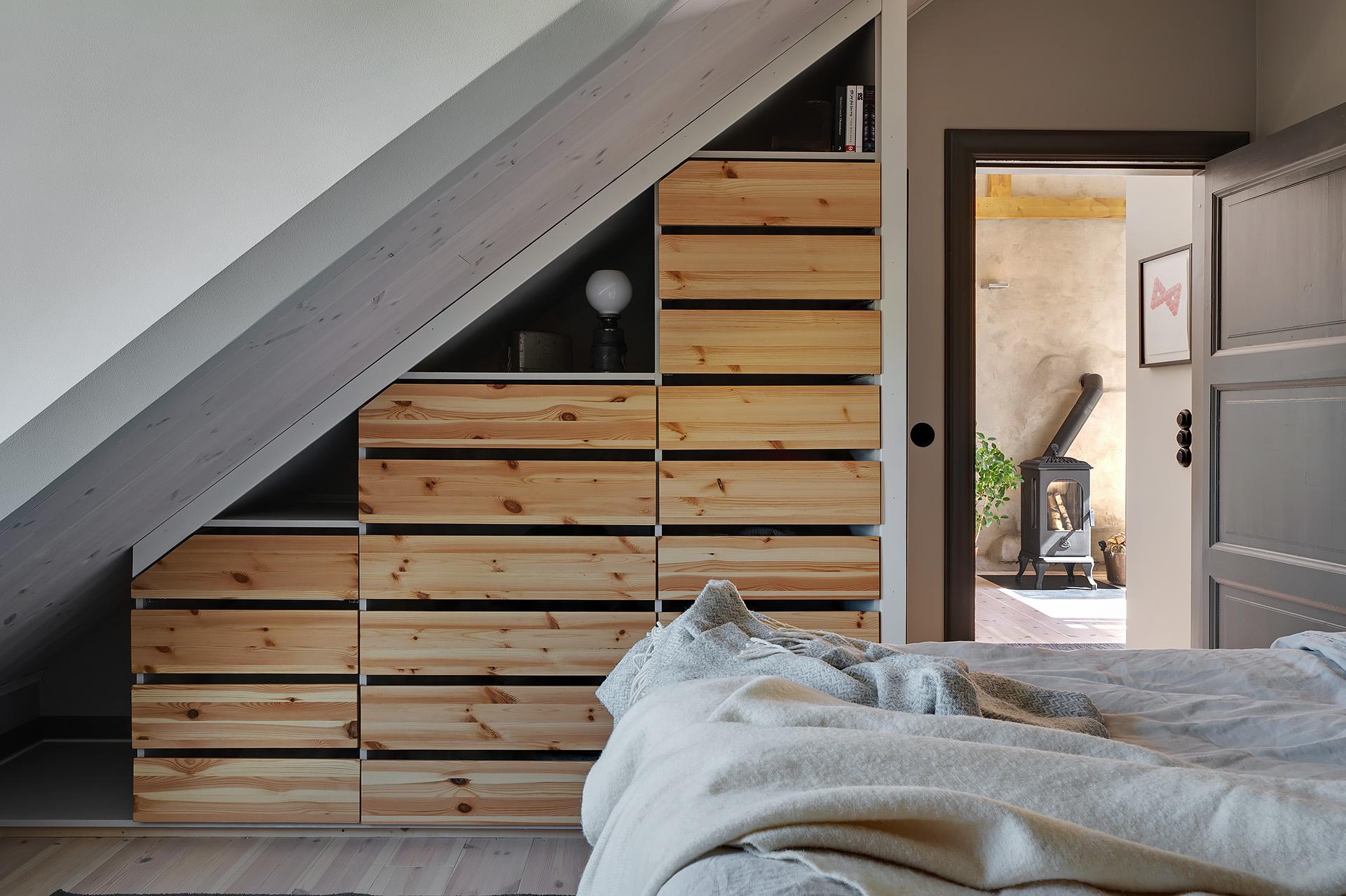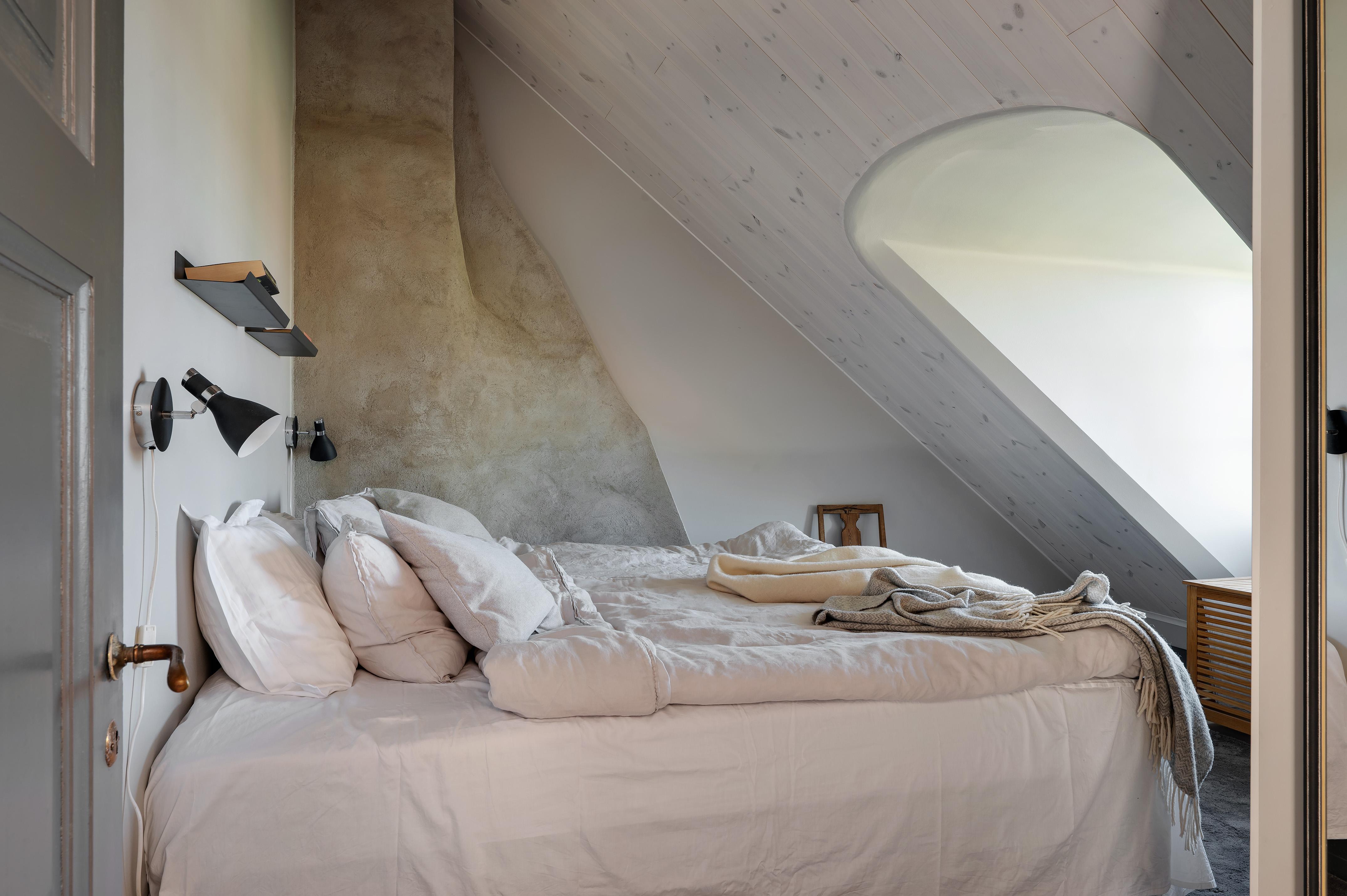 Övervåningens mysiga sovrum har plats för en dubbelsäng, och här finns även inbyggd och snygg lådförvaring som sväljer det mesta i klädväg. Man sover gott om natten, och på morgonen är det underbart att vakna till den fria utsikten som sträcker sig ända bort mot Hisingens höjder. Liksom i vardagsrummet är golvet och takpanelen i vitpigmenterad och hårdvaxoljad furu, och väggarna målade i gråbeige. Murstocken, som pryder ett av hörnen, är putsad i ljusgrått.