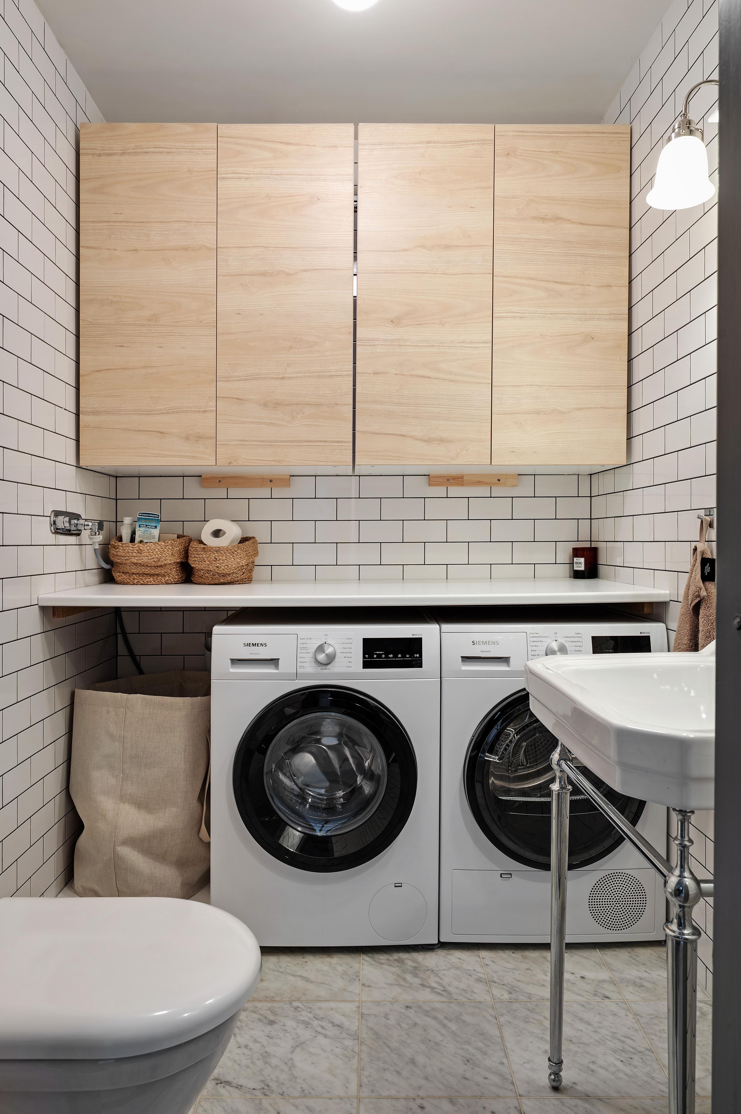 I vintras gjordes nedervåningens badrum om till en kombinerad tvättstuga och gästtoalett med handfat, WC, tvättmaskin, torktumlare, arbetsbänk och förvaring. Rördragningar med mera har sparats, så det är enkelt att sätta in en duschhörna igen ifall så skulle önskas. Väggarna klädda med vitt kakel i halvförband och golvet belagt med marmorklinker med golvvärme.