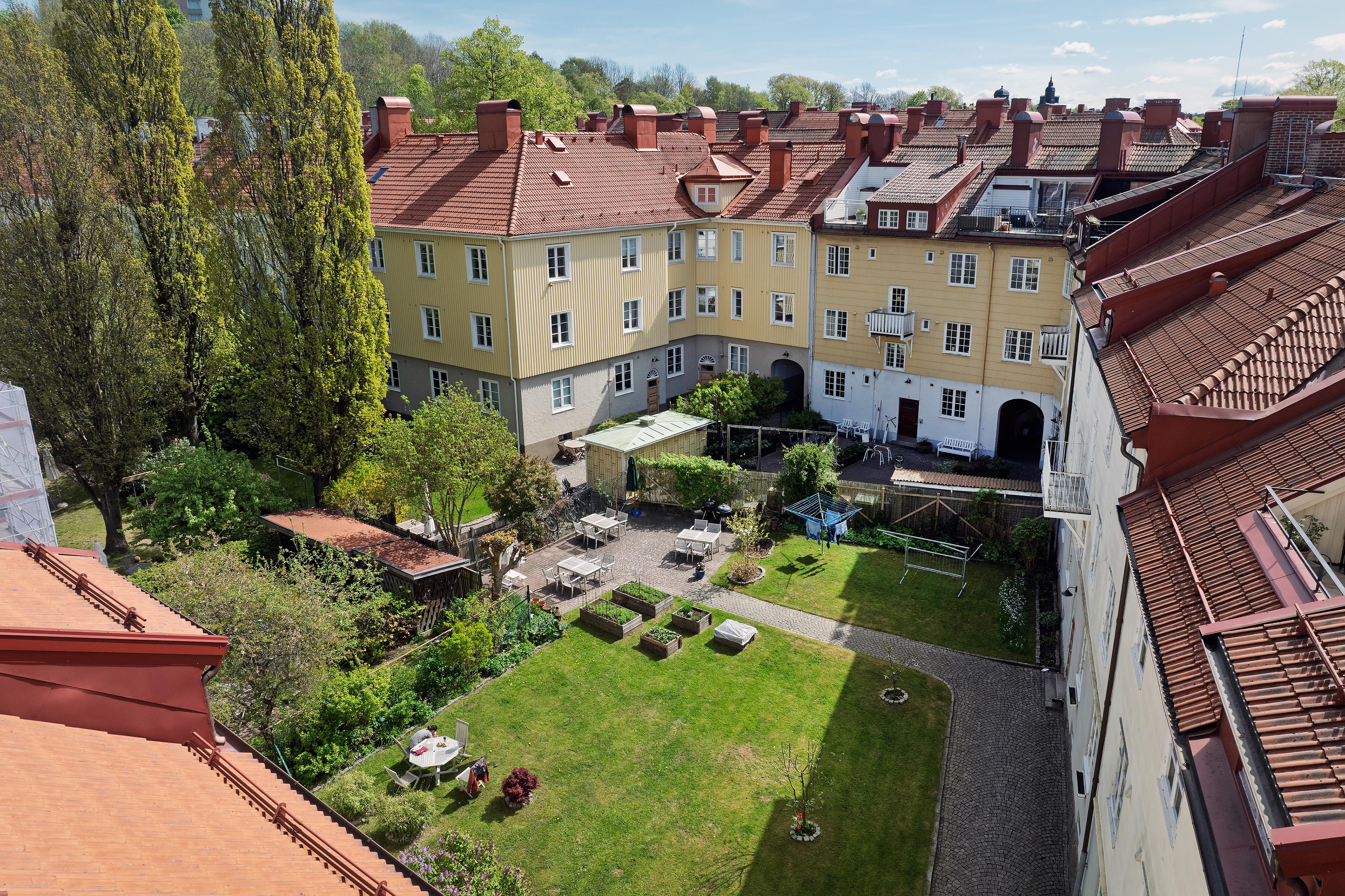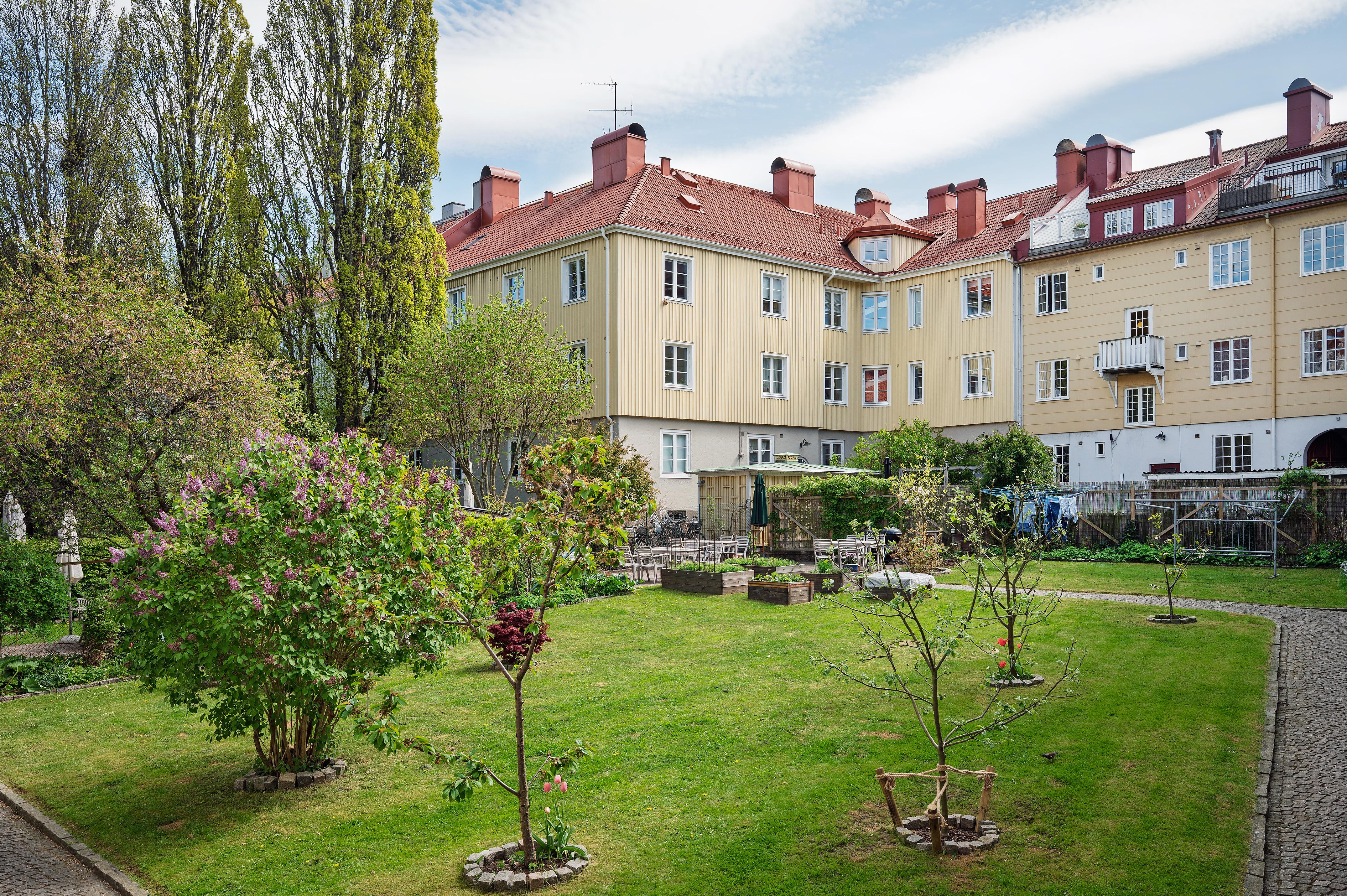 Ett mycket trivsamt boende erbjuds och på föreningens del av den grönskande innergården finns det trädgårdsmöbler, grillar, välskött växtlighet, odlingslådor, härliga gräsytor och gammaldags gatsten. Solen är framme hela dagen. Stämningen grannar emellan är familjär, och många har bott här länge. Läget är perfekt och i Bagaregården erbjuds ett lugnt och avskilt boende mitt emellan innerstadens puls och Delsjöområdets natur. På promenadavstånd har man Härlanda tjärns badplats och Skatås motionsmöjligheter. De lummiga gatorna är som gjorda för flanerande, och utmed stadsdelens huvudstråk hittar man mysiga Café Waernet och den italienska vinbaren Enoteca Roma. Kommunikationerna är utmärkta och Stockholmsgatans spårvagnshållplats, ett stenkast från lägenheten, trafikeras av linje 1 och 3 med täta turer. Redbergsplatsen, lite längre bort, fungerar som knutpunkt för flera spårvagns- och busslinjer. Det är även nära till Olskrokstorget med bland annat mataffärer, fiskbodar, grönsakshandlare, bokhandel och Systembolaget. Från lägenheten tar det bara några minuter att gå till förskolan på Landerigatan och Bagaregårdsskolan, som tar emot elever från förskoleklass till årskurs 6, ligger runt hörnet. På andra sidan spårvägen finns ett kulturhus med bibliotek.