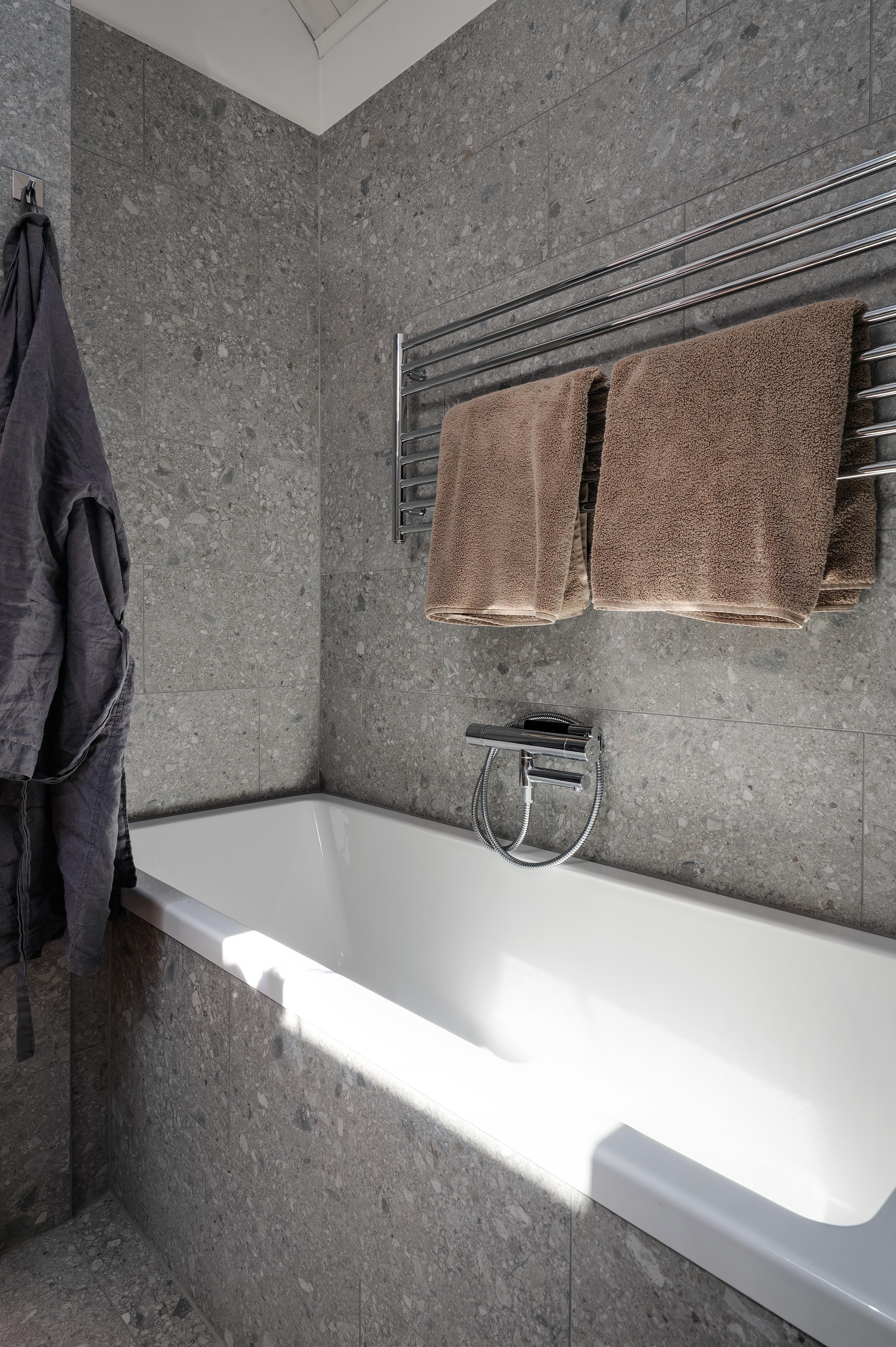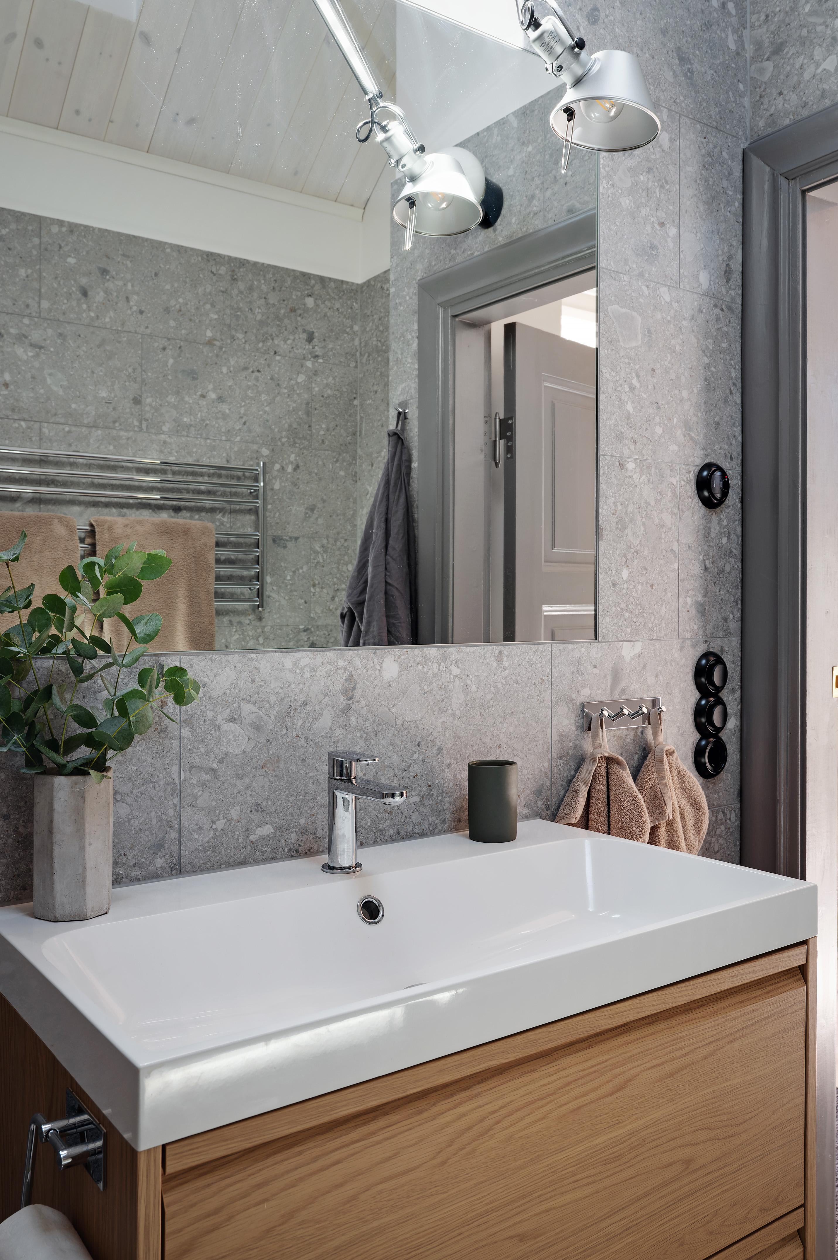 På övervåningen finns även ett lyxigt badrum med badkar, duschhörna, handdukstork, tvättkommod och WC. Badkaret är platsbyggt och duschhörnan, med både takdusch och handmunstycke, skärmas av med glas. Badrummet har påkostat ytskikt i granitkeramik från Bricmate med infälld spegel ovanför handfatet. Golvvärmen gör gott för morgonkalla fötter. Ett takfönster i sydost låter dagsljuset strömma in, och det är ljuvligt att ligga i badkaret och blicka ut över den stjärnklara himlen. Takpanelen är i vitpigmenterad furu och de synliga takbjälkarna har behandlats för att tåla väta.