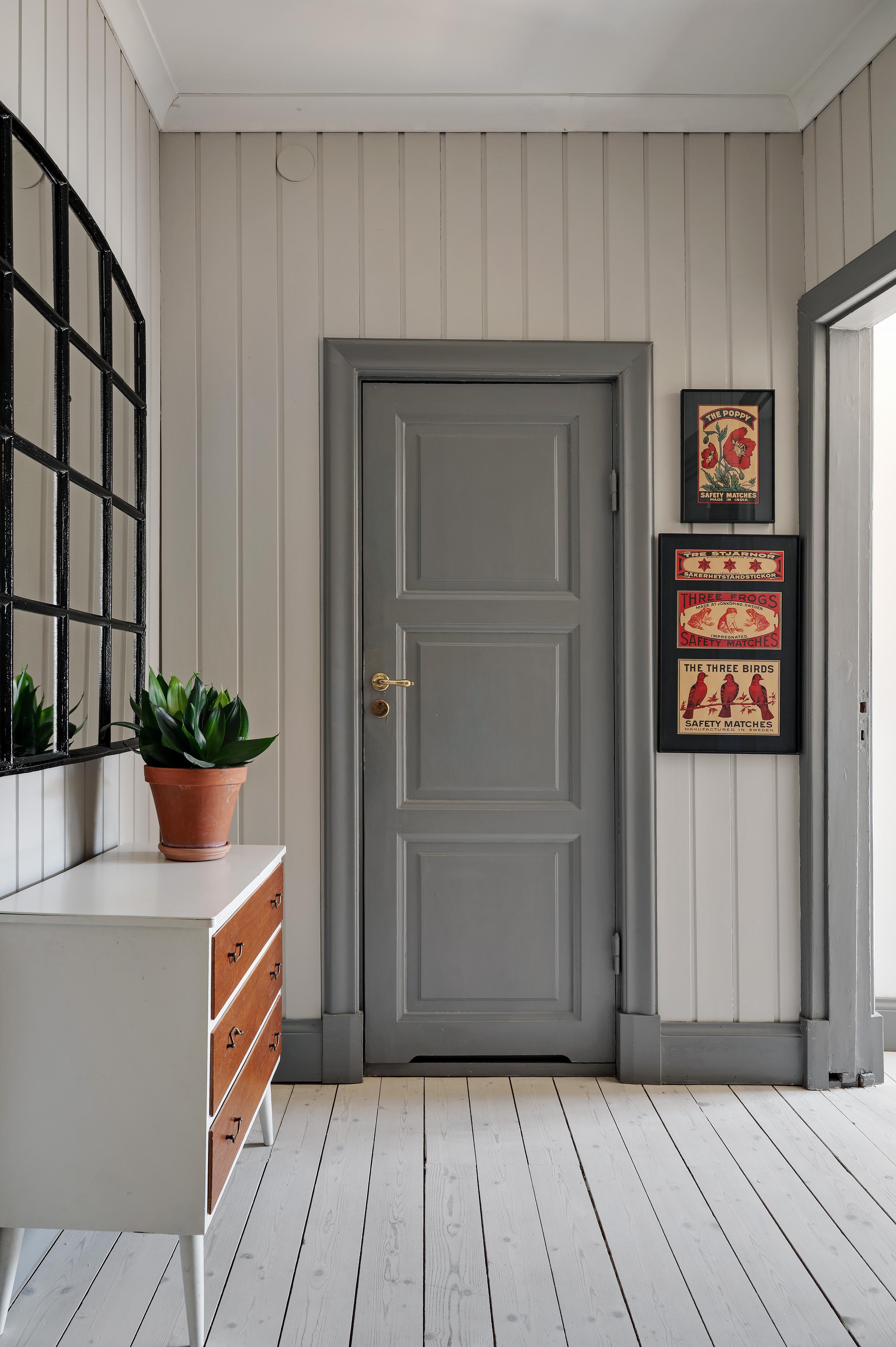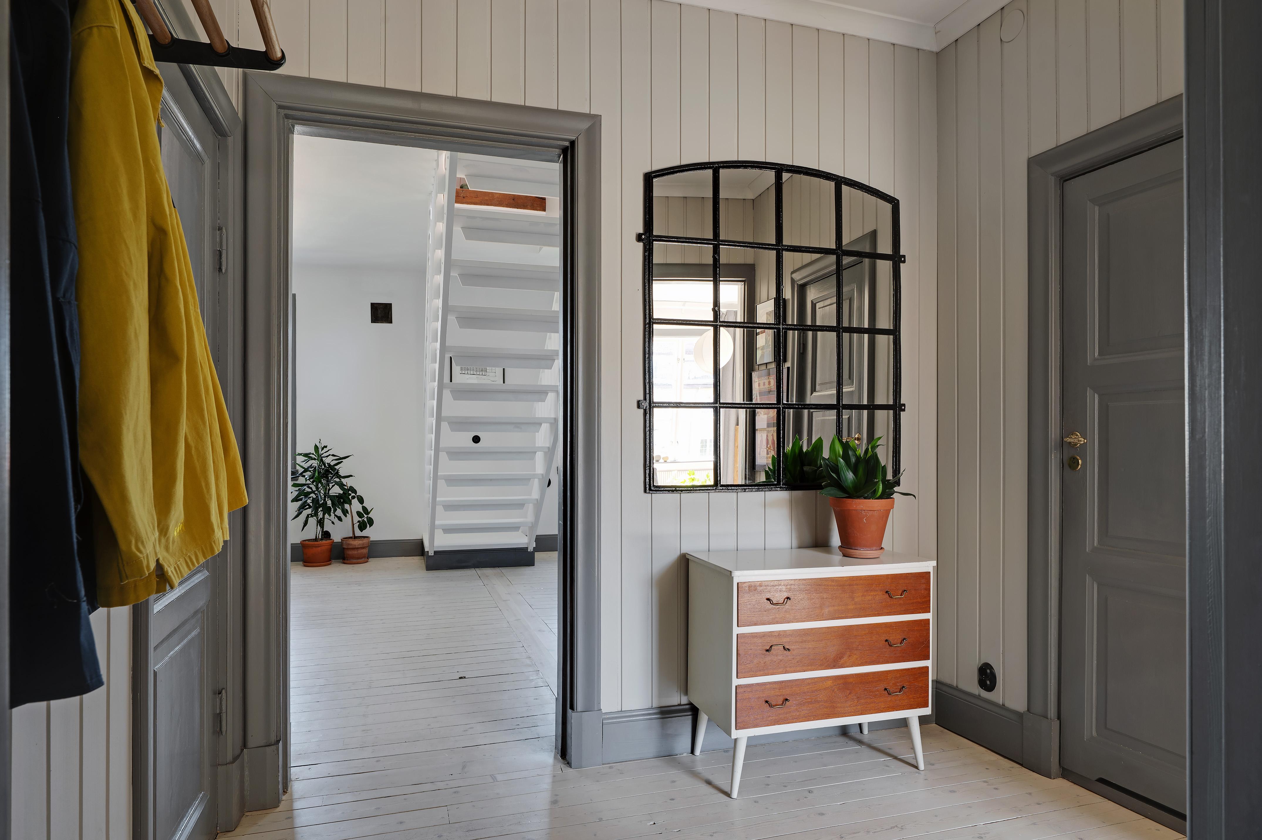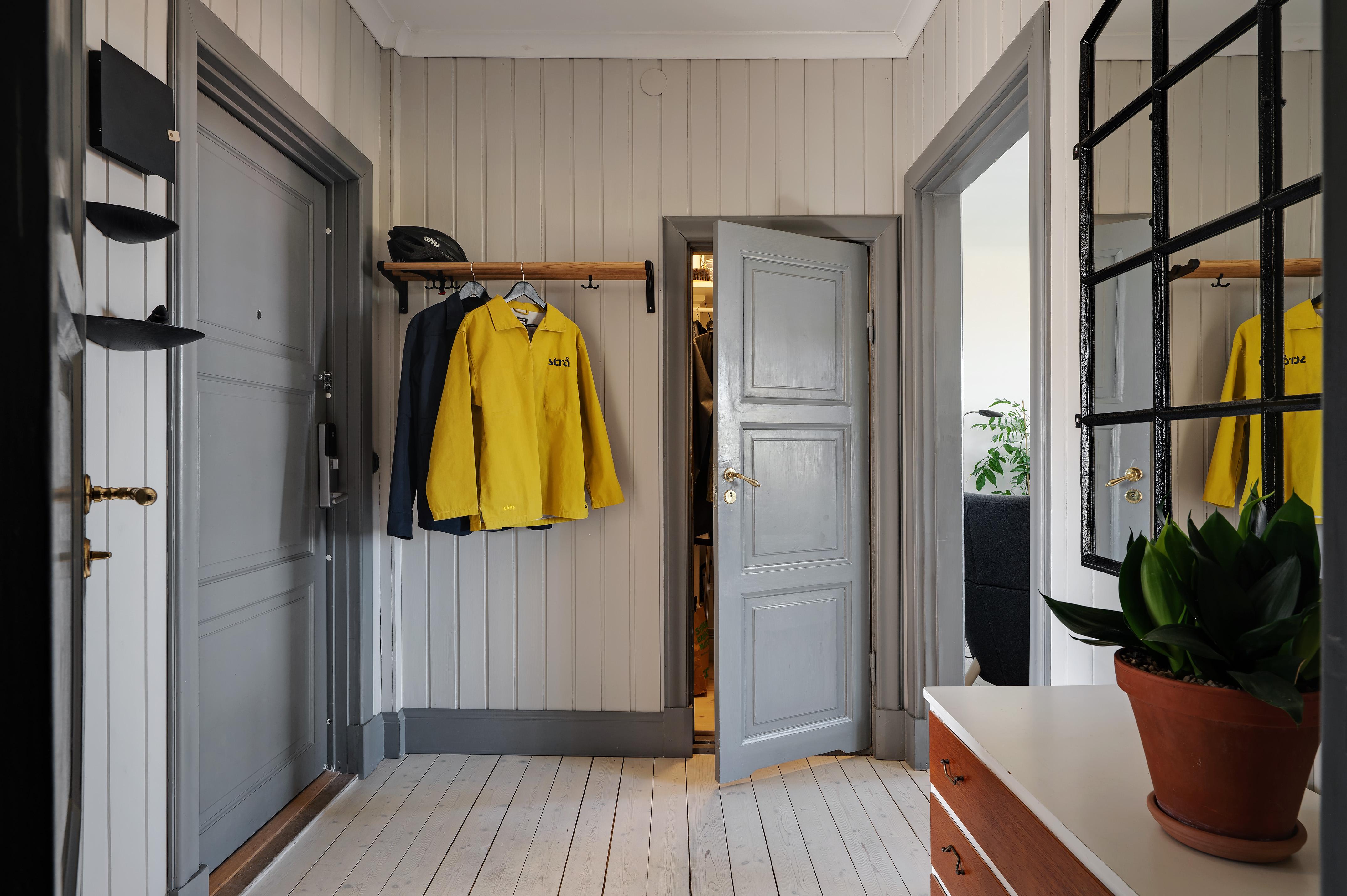 Hallen är välkomnande, och direkt till vänster om ytterdörren finns en avhängningshörna med hatthylla. Bra förvaringsmöjligheter för ytterkläder, städutrustning med mera erbjuds i form av en klädkammare med belysning. Klädkammaren användes tidigare som minitvättstuga, och avlopp och vattenanslutning finns kvar. Under trägolvet är det klinkergolv. I själva hallen är brädgolvet framtaget och väggarna klädda med charmig spontpanel som målats i en ljus gråbeige kulör.