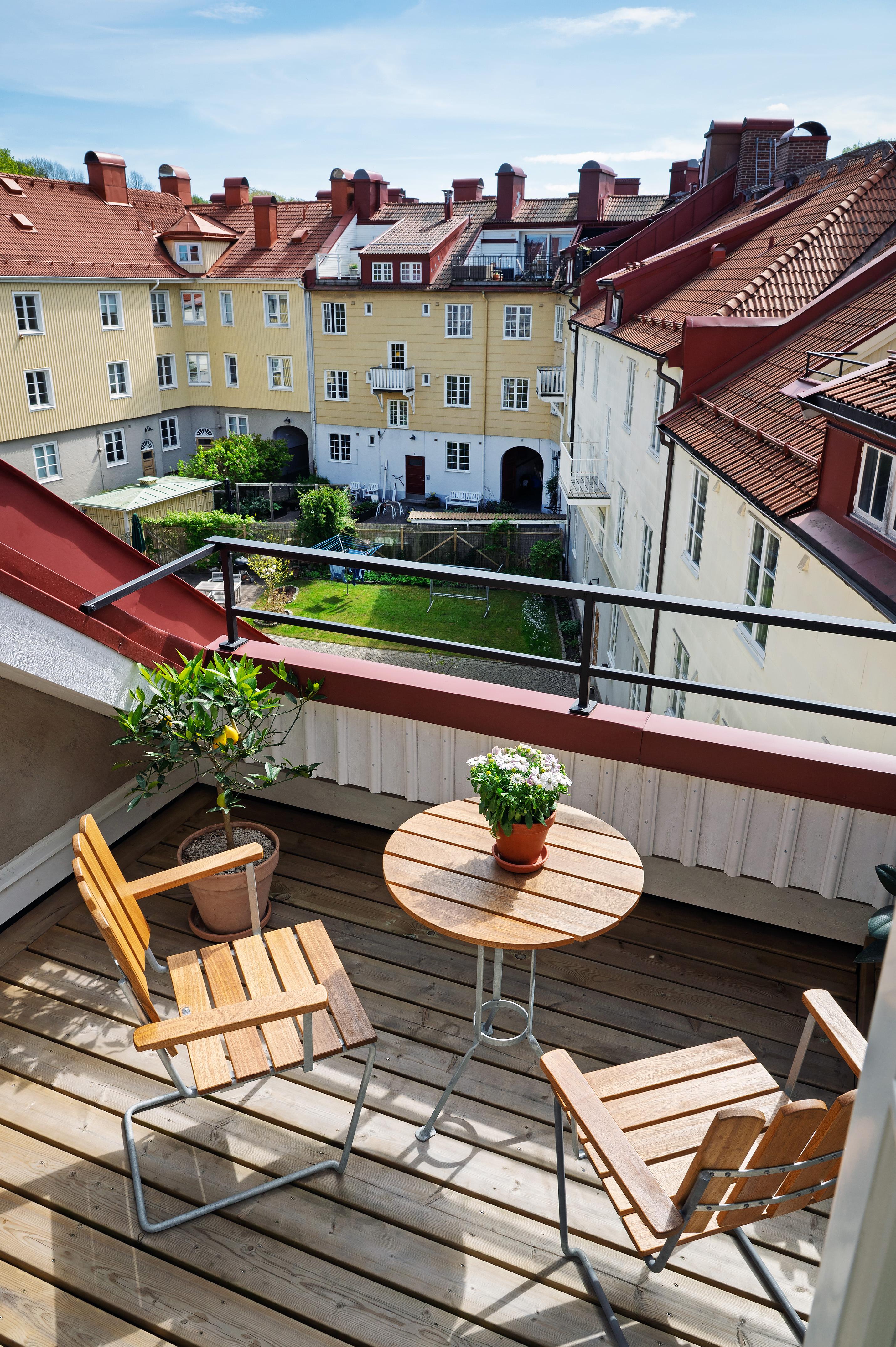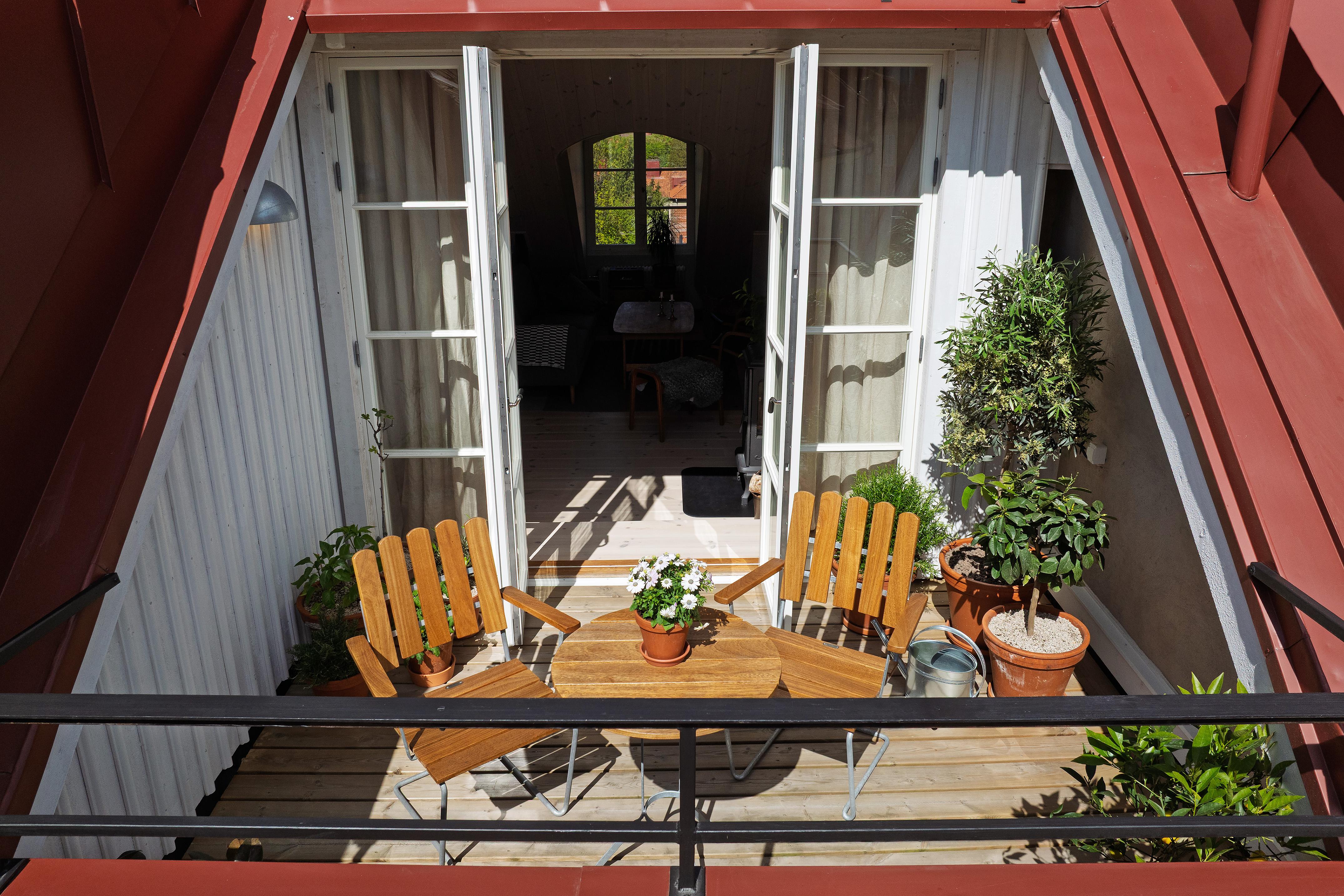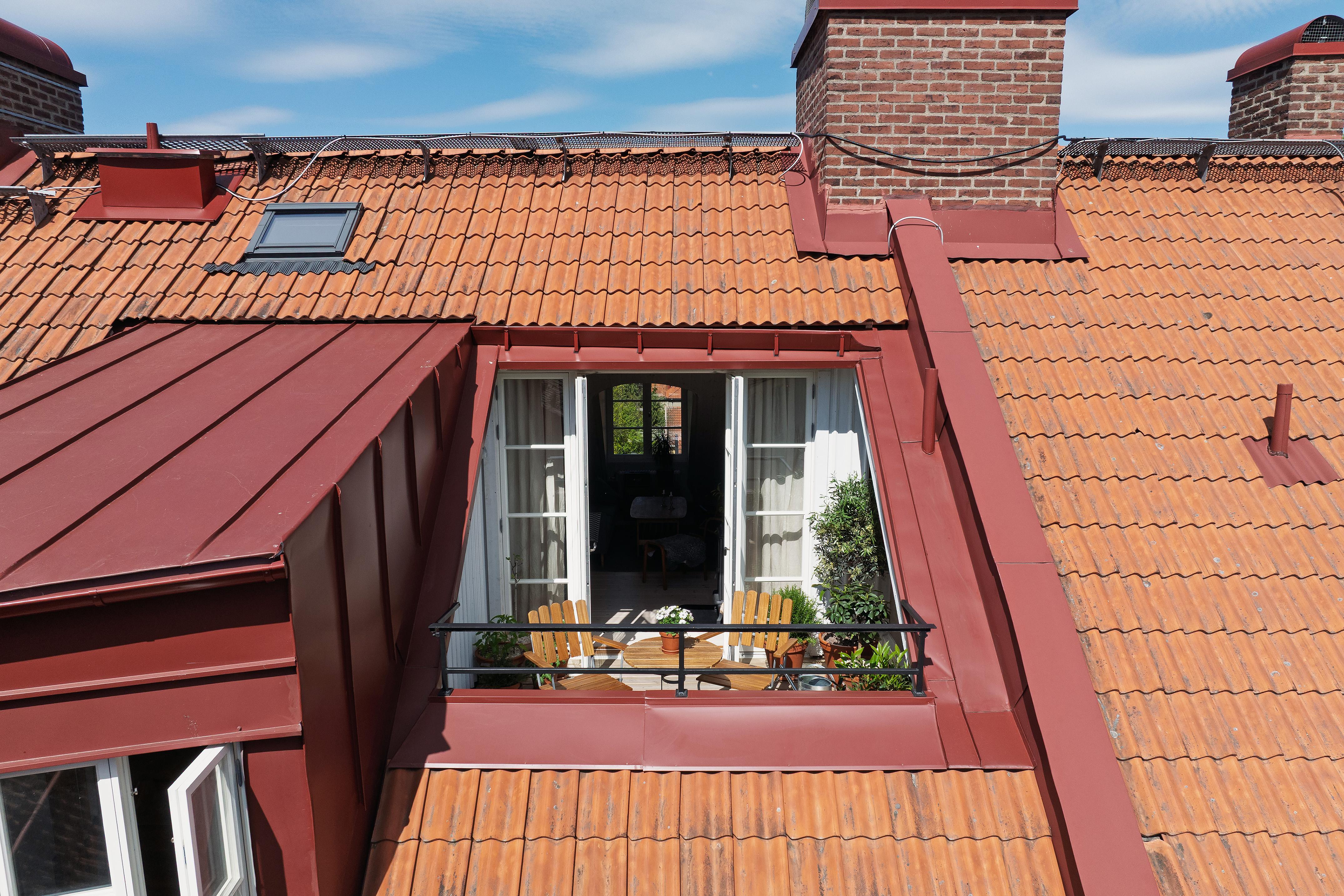 Från vår till höst växer vardagsrummet med nästan tio kvadratmeter genom den härliga takterrassen. Här trivs både växter och människor i solen, och utsikten över den grönskande innergården, takåsarna och himlen är intagande.