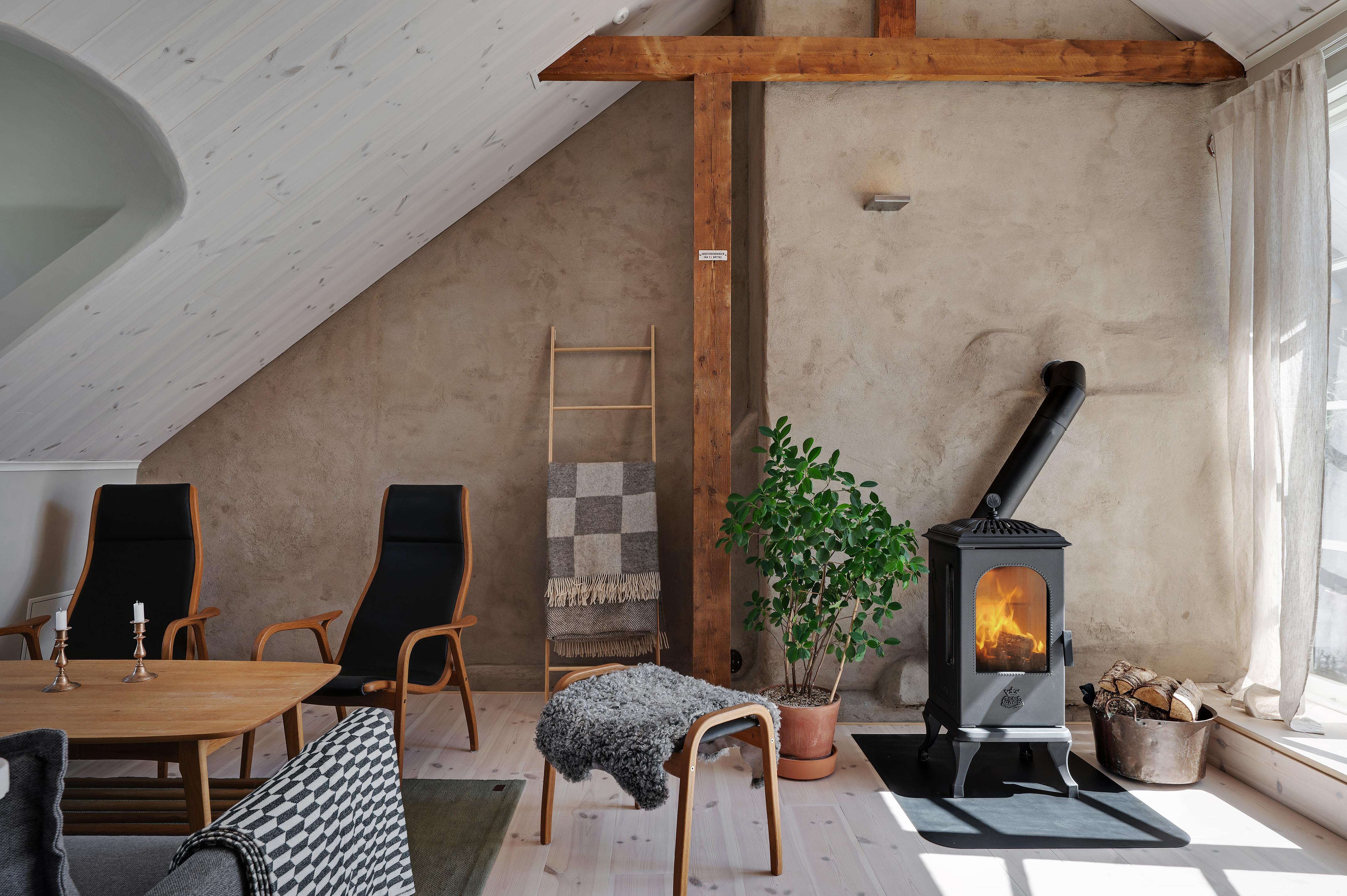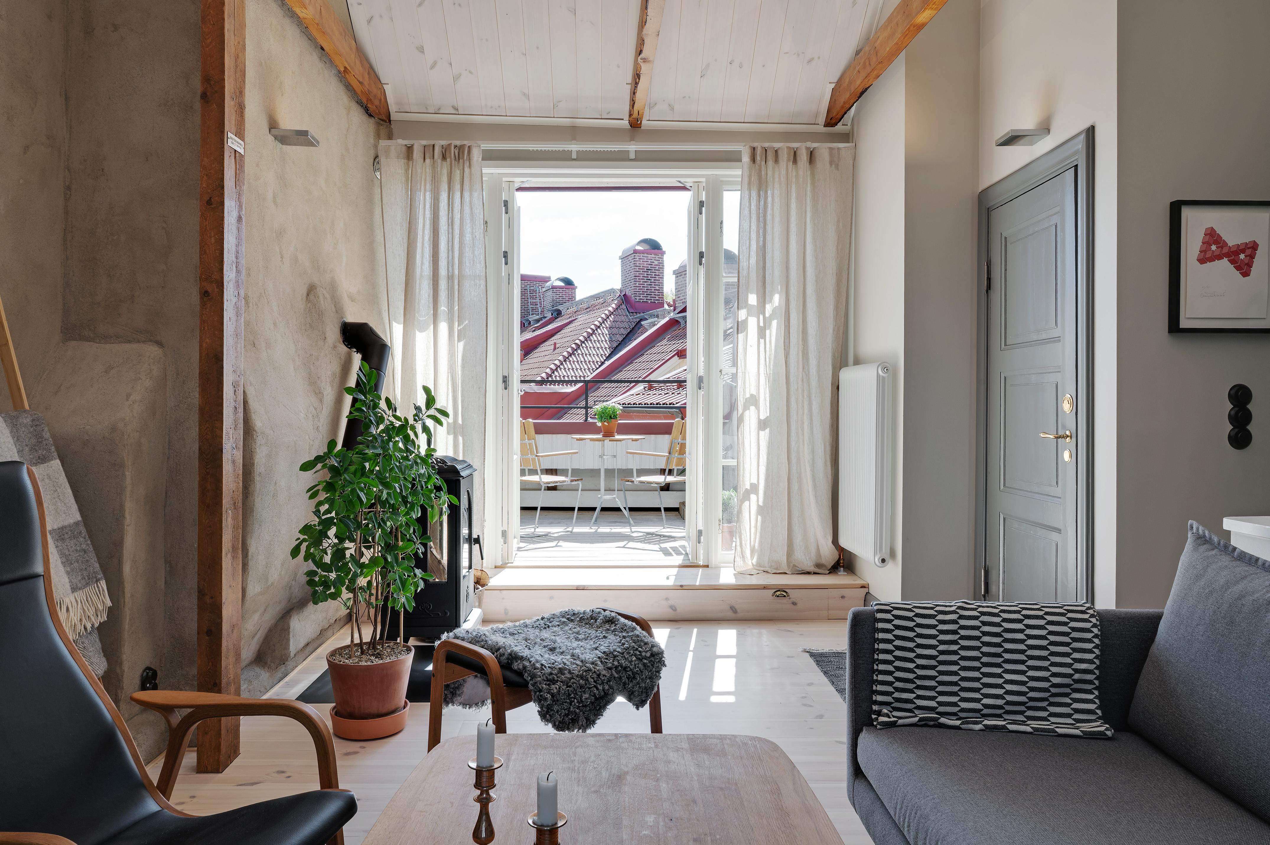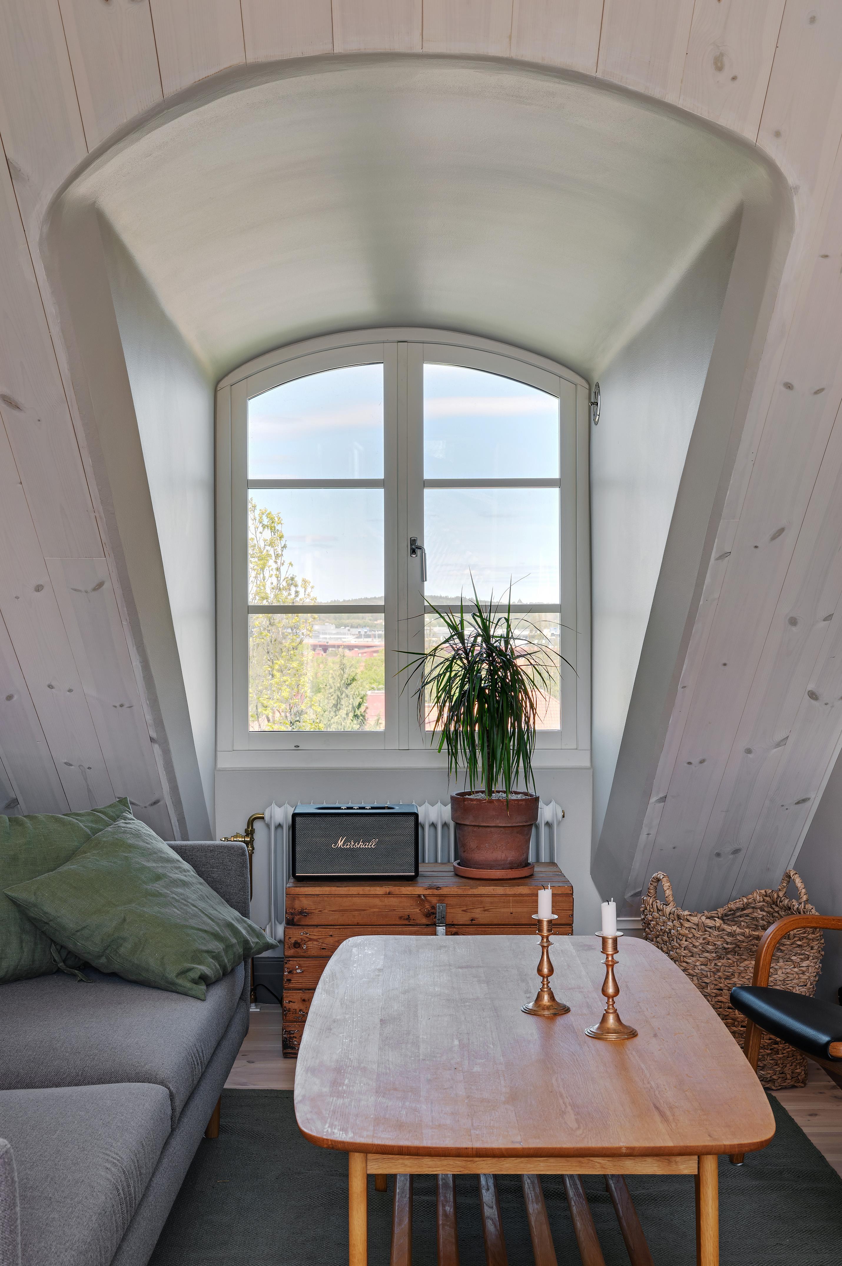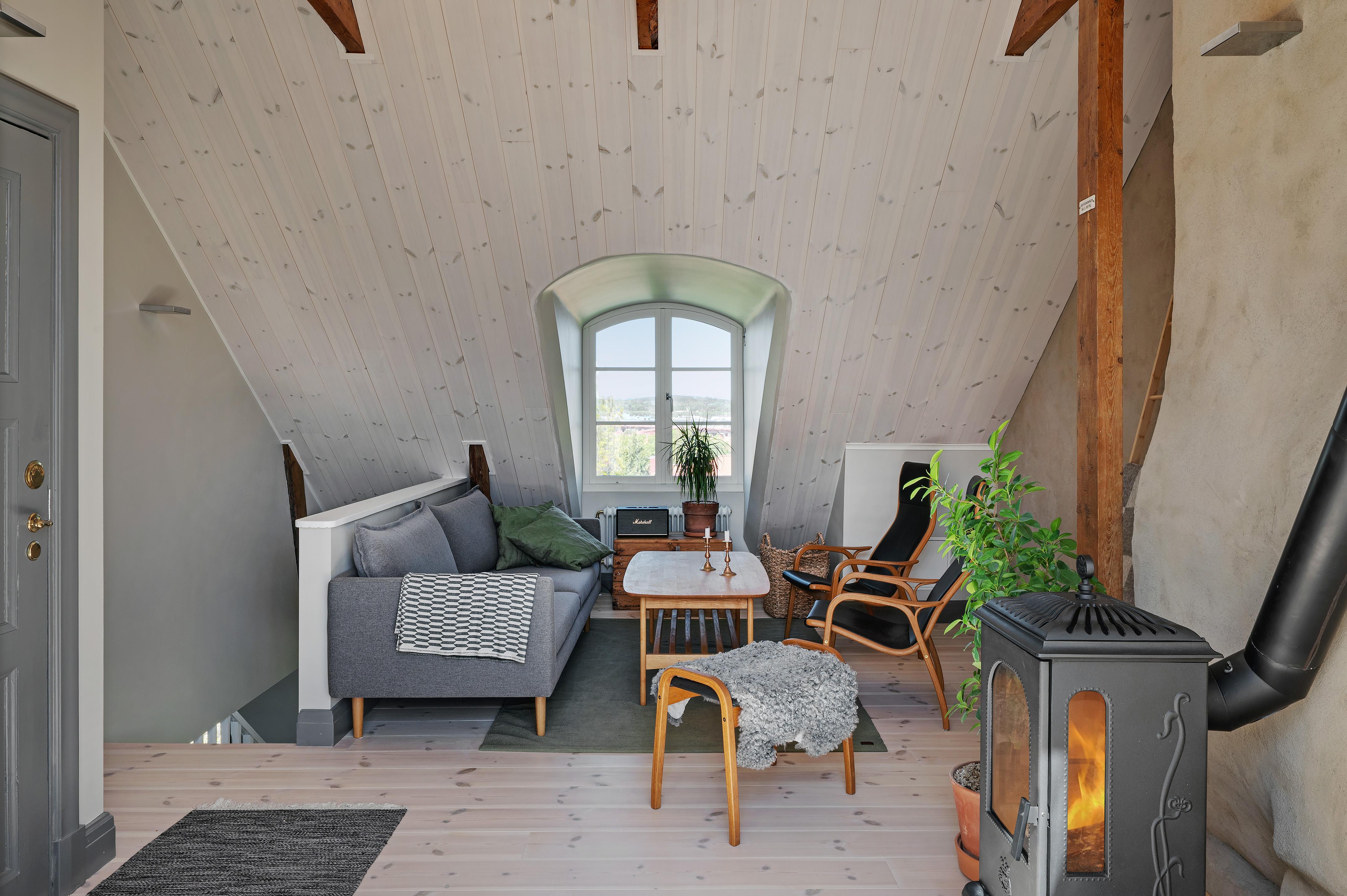 Från köket leder en luftig trappa upp till övervåningens vardagsrum. Rummet är verkligen trivsamt, och den milsvida utsikten från takkupan i nordväst ger en härlig frihetskänsla. Helglasade pardörrar i sydost leder ut till lägenhetens takterrass. Under sommarhalvåret flödar ljuset från förmiddag till kväll, och mörka höst- och vinterkvällar är det mysigt att elda i den vackra braskaminen i tidsenlig stil. Golvet och takpanelen är i vitpigmenterad och hårdvaxoljad furu, och väggarna har målats i en ljus gråbeige kulör. Murstocken är putsad i ljusgrått, och de synliga takbjälkarna betsade. Spegeldörrarna in till sovrummet och badrummet är restaurerade originaldörrar från huset.