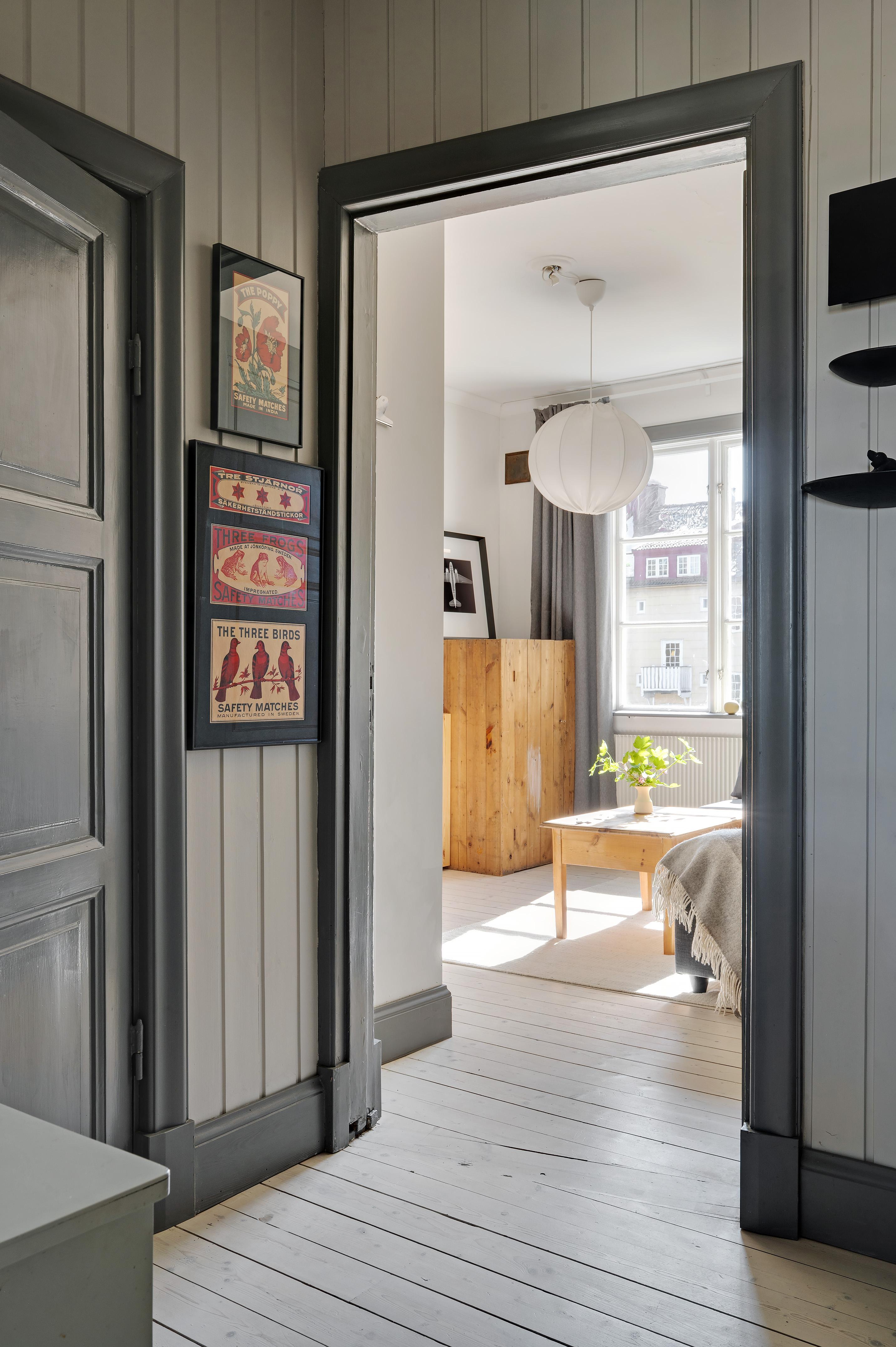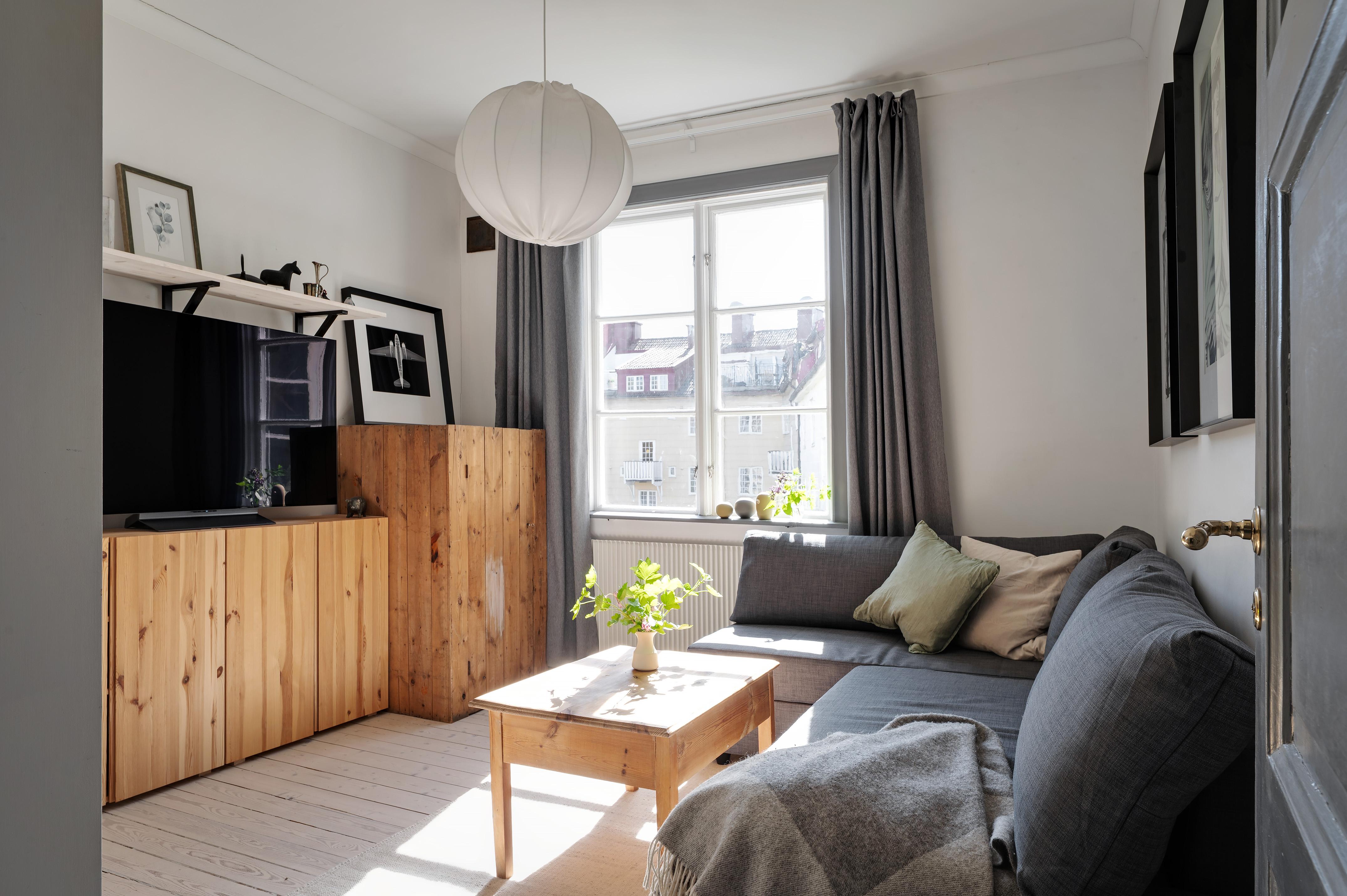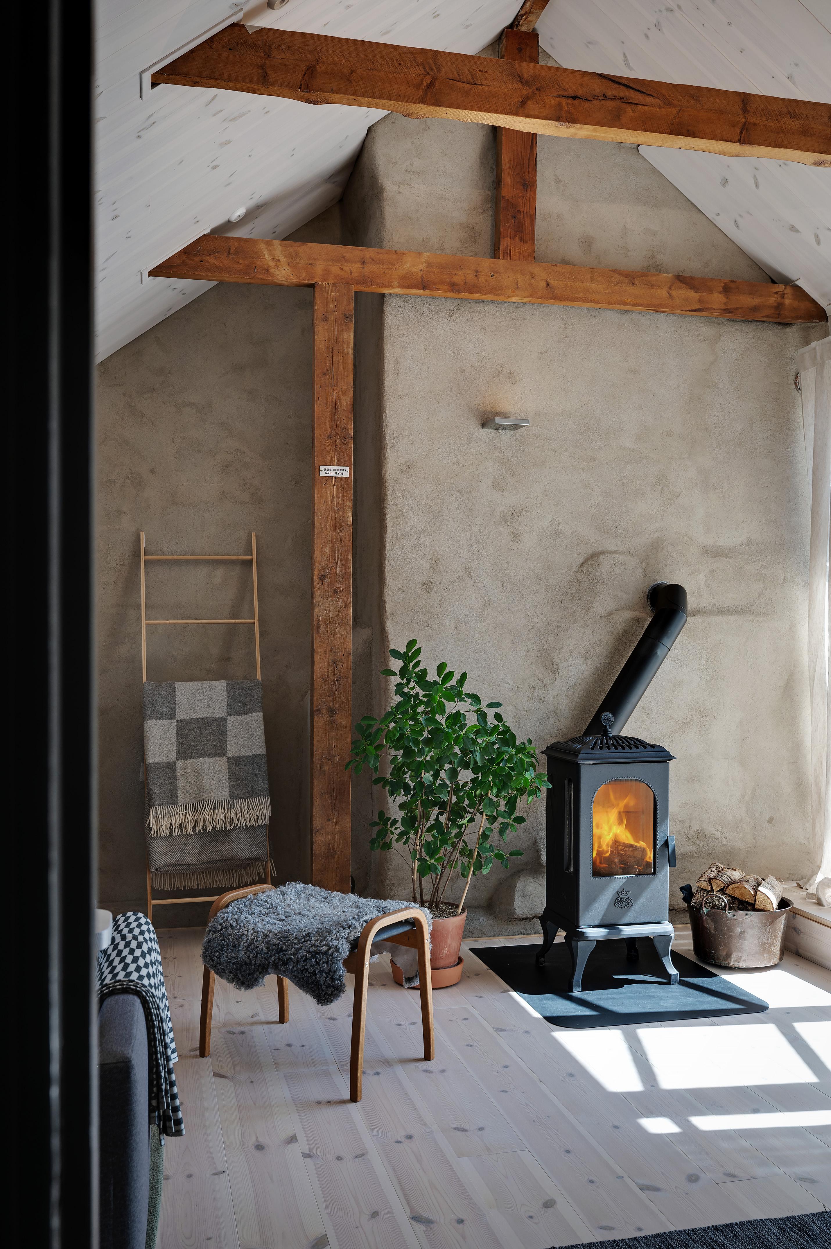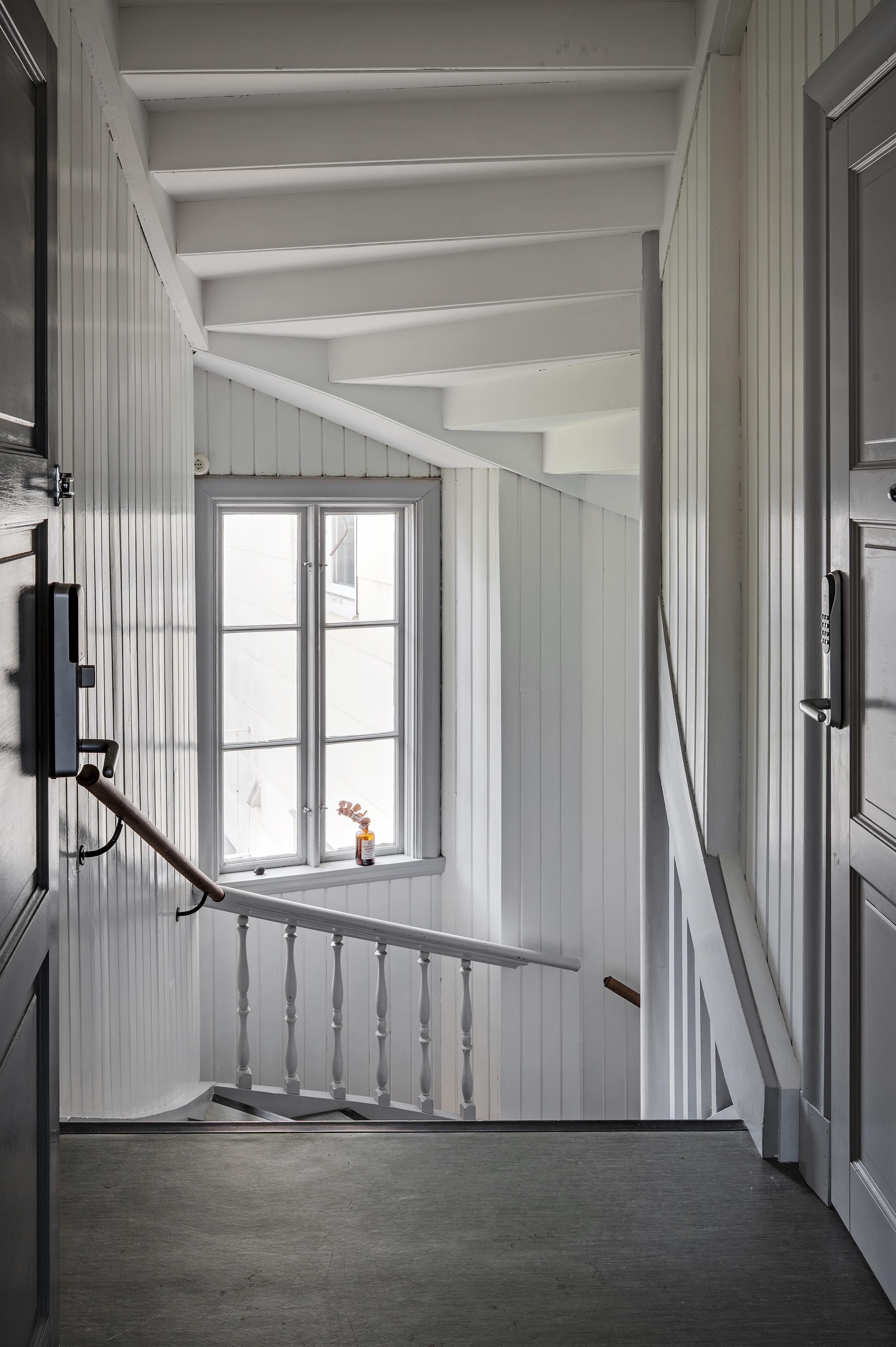 Från köket leder en luftig trappa upp till övervåningens vardagsrum. Rummet är verkligen trivsamt, och den milsvida utsikten från takkupan i nordväst ger en härlig frihetskänsla. Helglasade pardörrar i sydost leder ut till lägenhetens takterrass. Under sommarhalvåret flödar ljuset från förmiddag till kväll, och mörka höst- och vinterkvällar är det mysigt att elda i den vackra braskaminen i tidsenlig stil. Golvet och takpanelen är i vitpigmenterad och hårdvaxoljad furu, och väggarna har målats i en ljus gråbeige kulör. Murstocken är putsad i ljusgrått, och de synliga takbjälkarna betsade. Spegeldörrarna in till sovrummet och badrummet är restaurerade originaldörrar från huset.