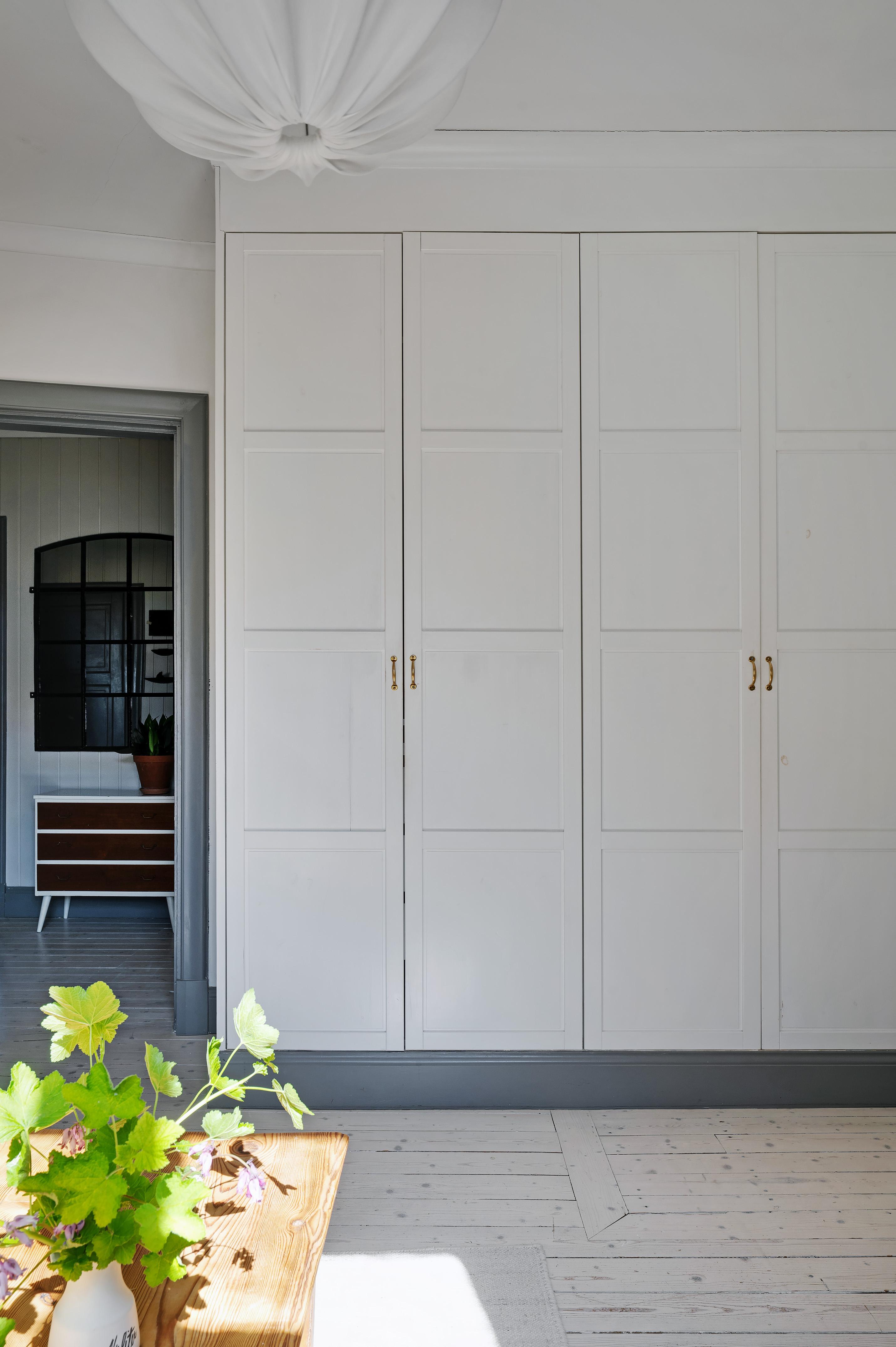 Även nedervåningens sovrum har plats för en dubbelsäng och ypperliga förvaringsmöjligheter för kläder och sänglinne erbjuds i form av två dubbelgarderober. Rummet passar även bra som barnrum eller kombinerat gästrum och hemmakontor. Brädgolvet är framtaget och väggarna målade i ljusgrått.
