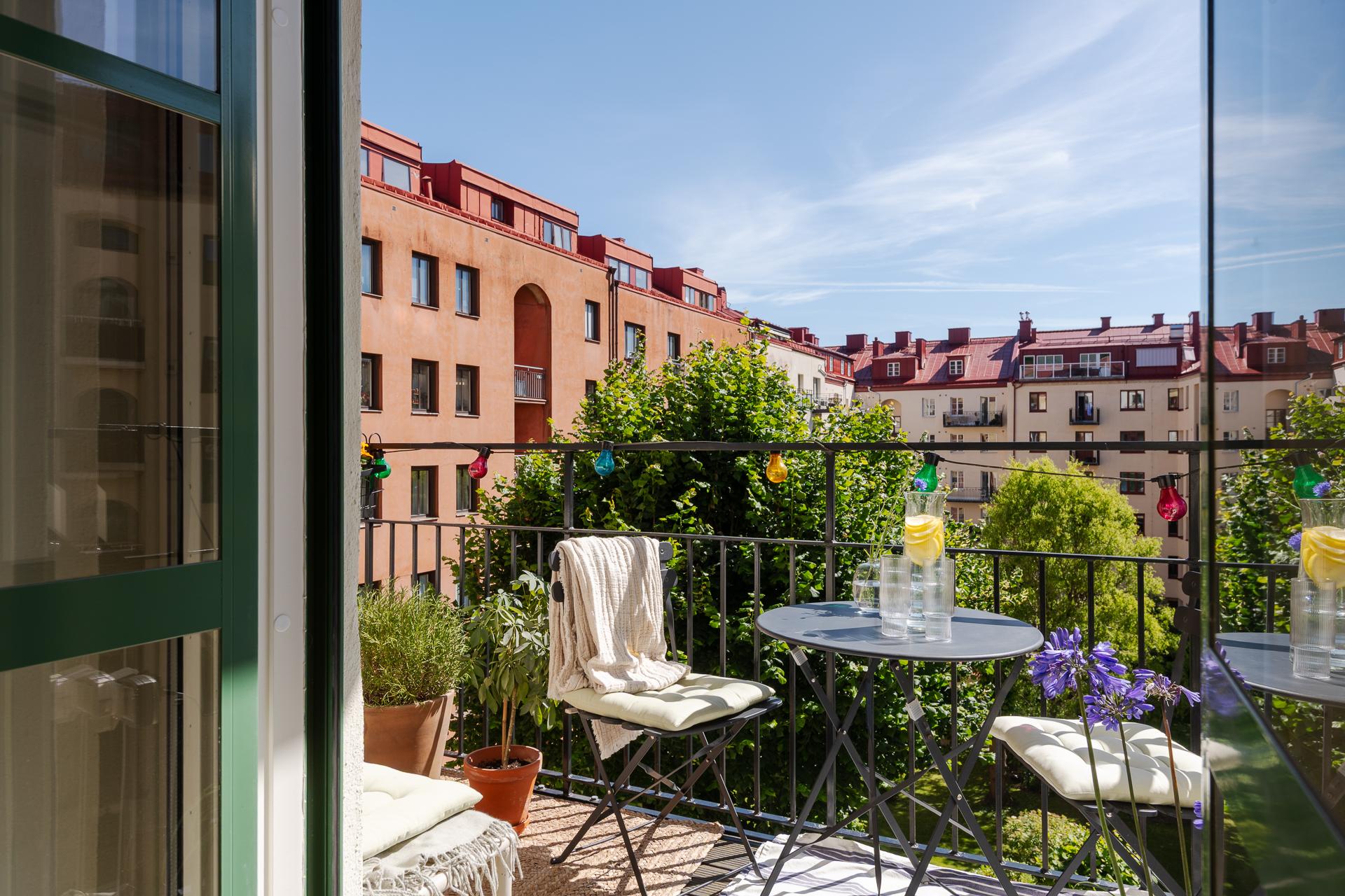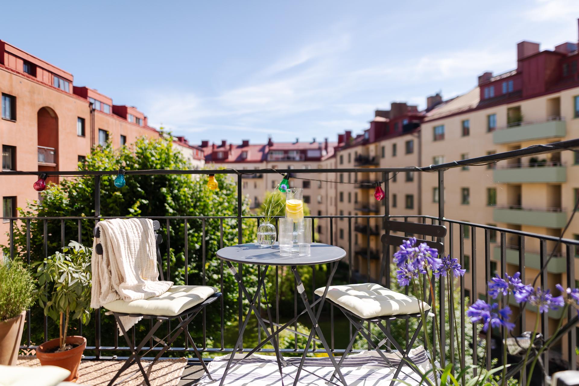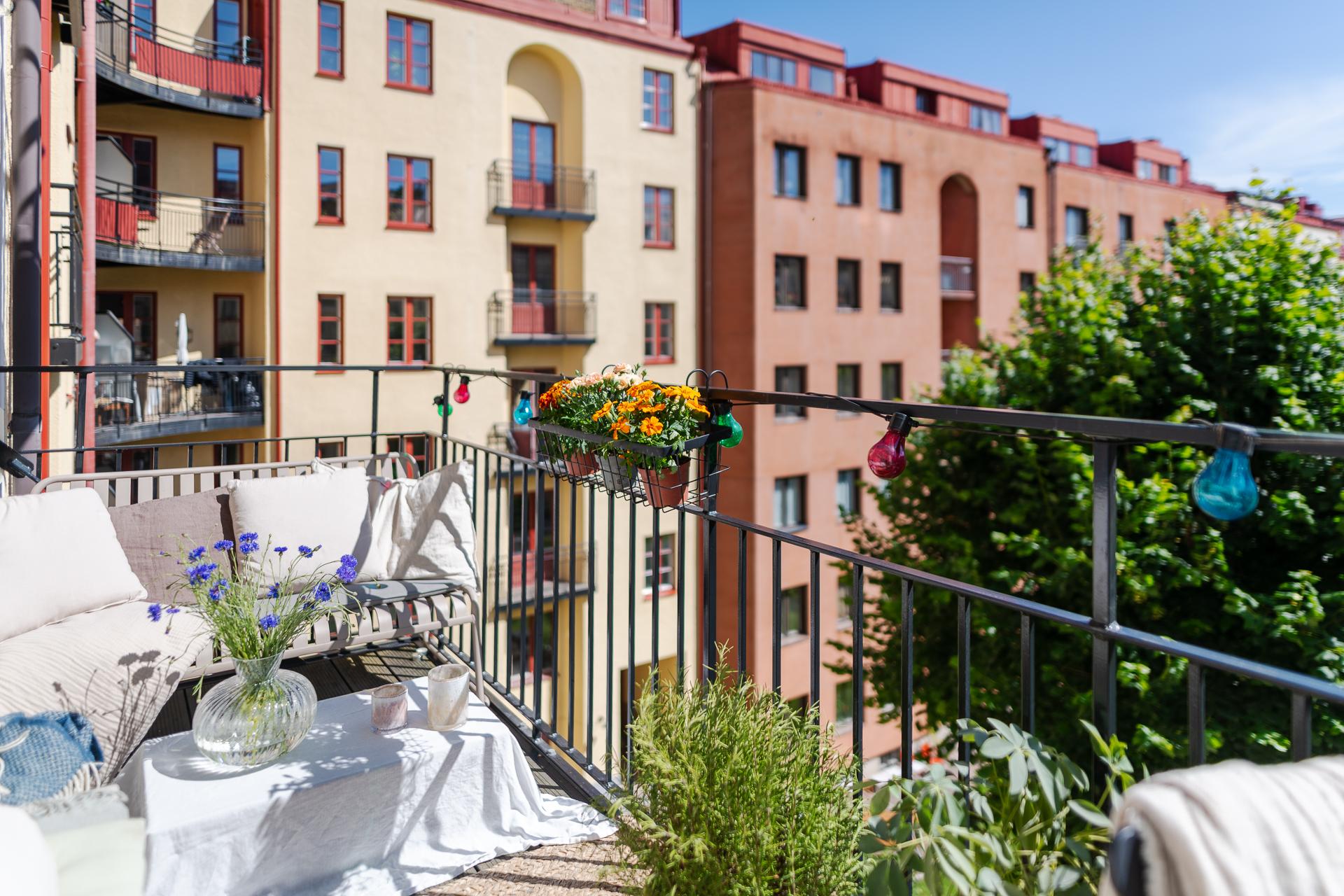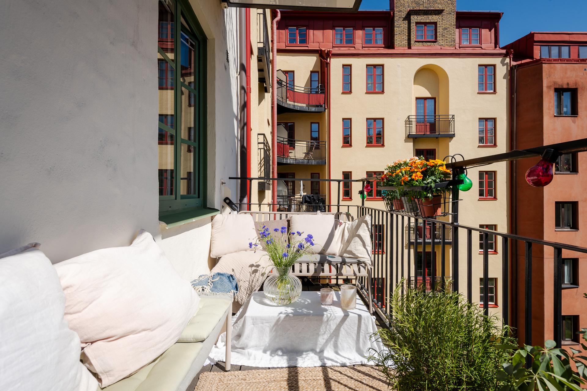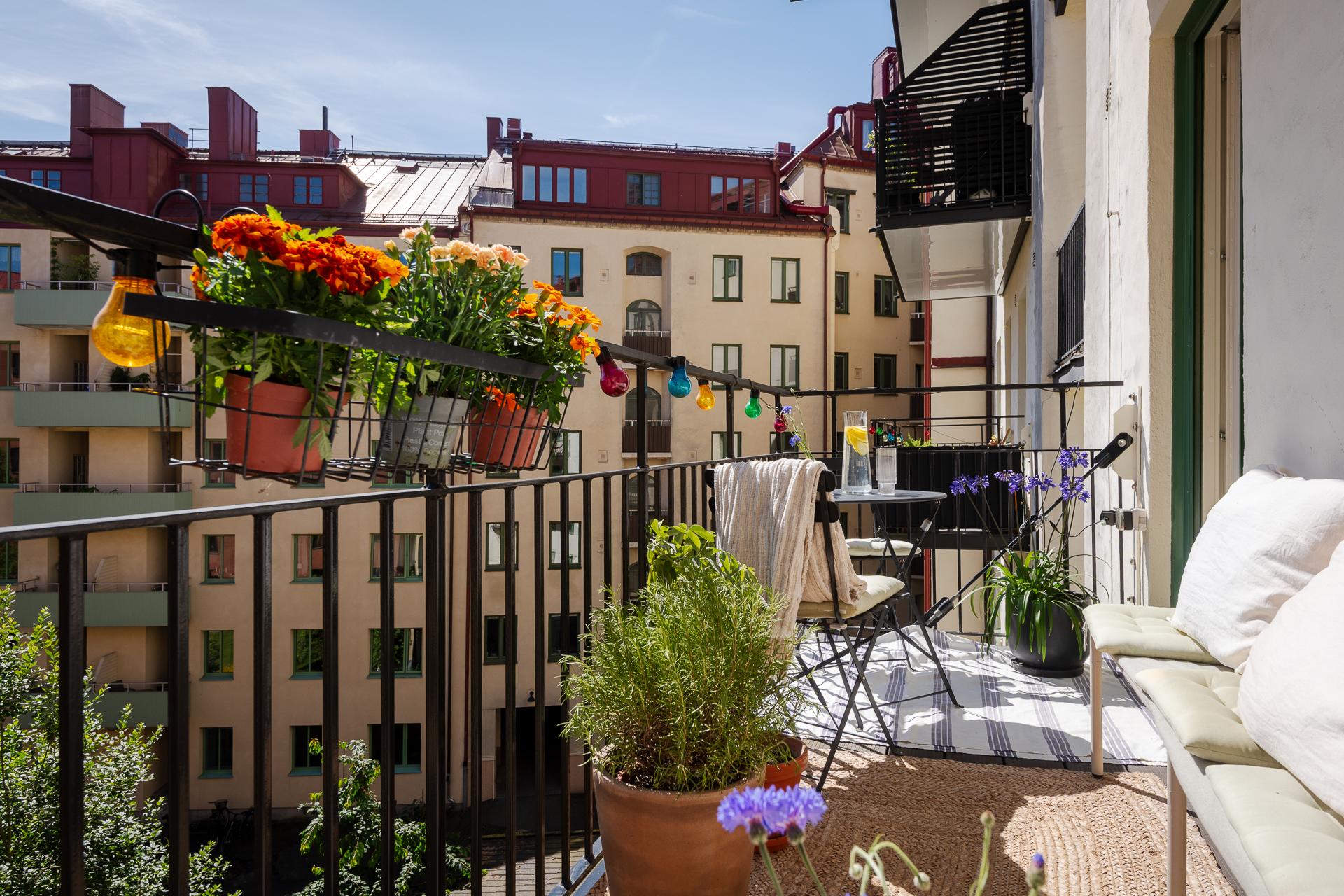 På den 4,5 meter breda balkongen i österläge kan man skapa sin egen grönskande oas med krydd- och blomsterodling, njuta i solen eller enkelt duka upp matbordet för fyra personer. Här är sol från morgon till eftermiddagen. Du befinner dig på våning 3, men får känslan av att du är mycket högre upp, tack vare gården som ligger i suterräng.