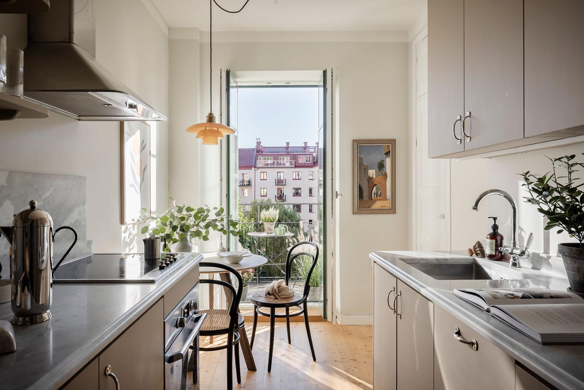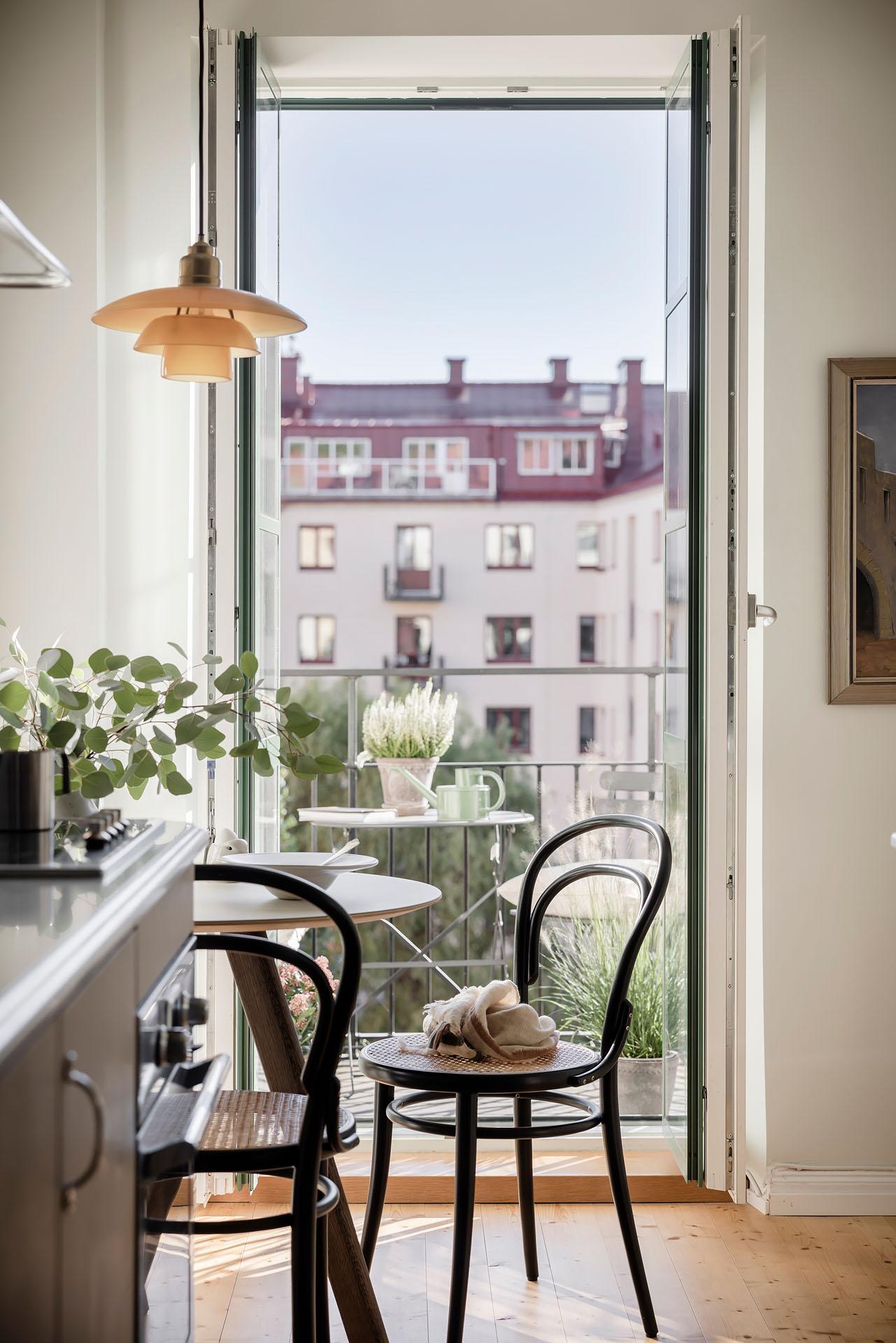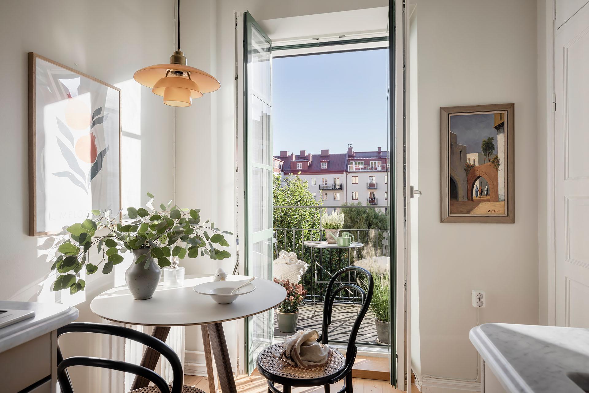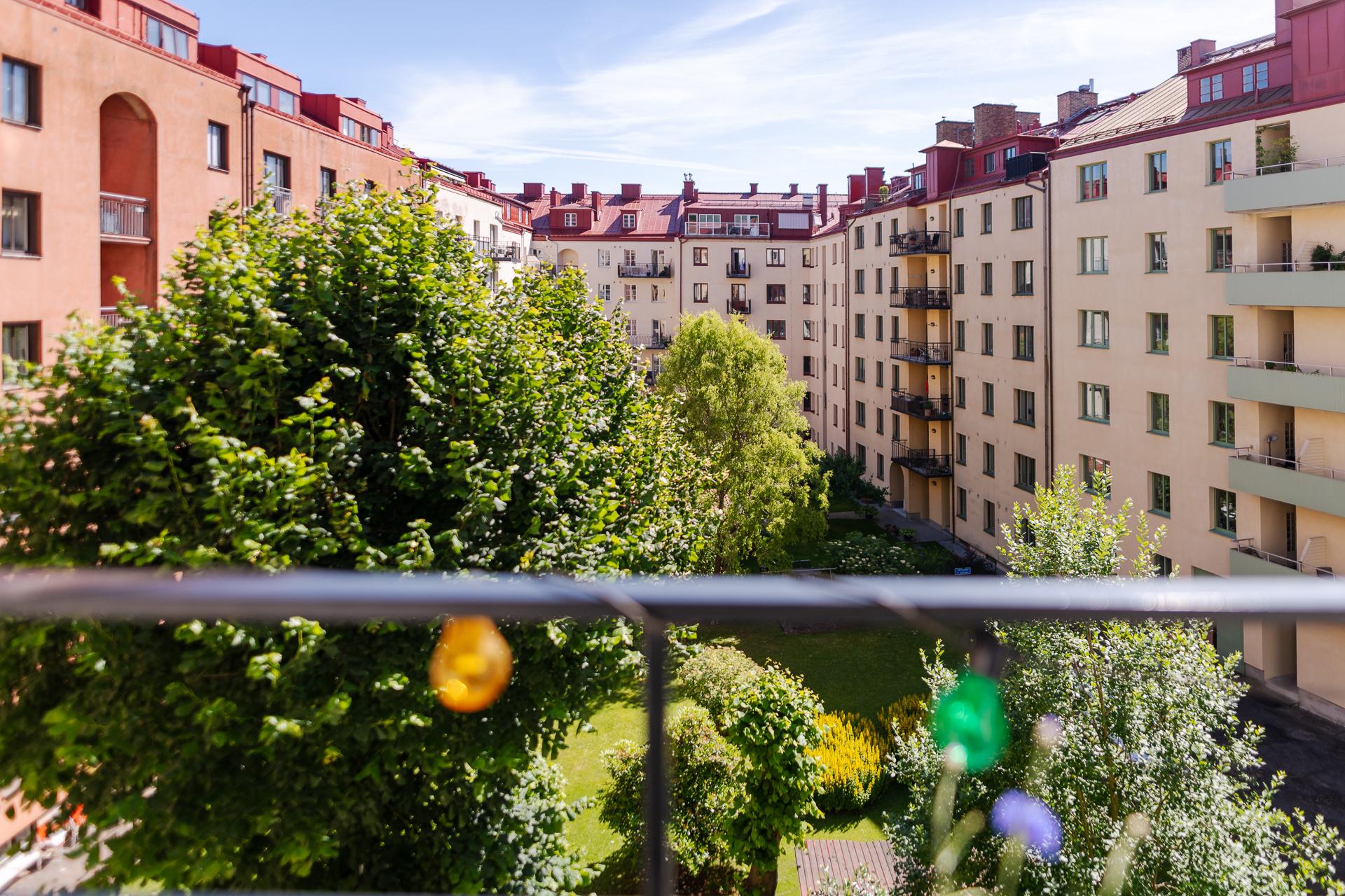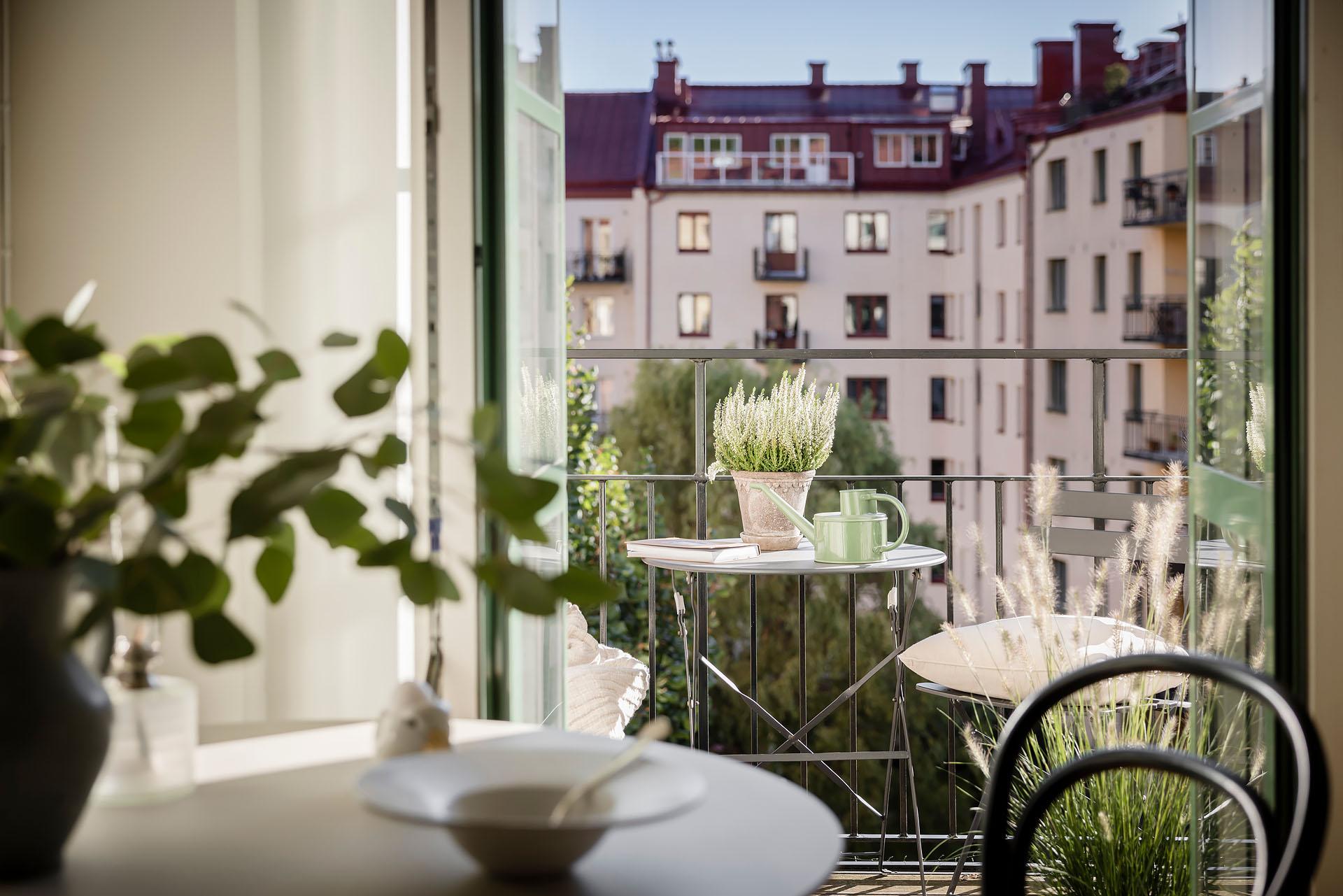 På den 4,5 meter breda balkongen i österläge kan man skapa sin egen grönskande oas med krydd- och blomsterodling, njuta i solen eller enkelt duka upp matbordet för fyra personer. Här är sol från morgon till eftermiddagen. Du befinner dig på våning 3, men får känslan av att du är mycket högre upp, tack vare gården som ligger i suterräng.