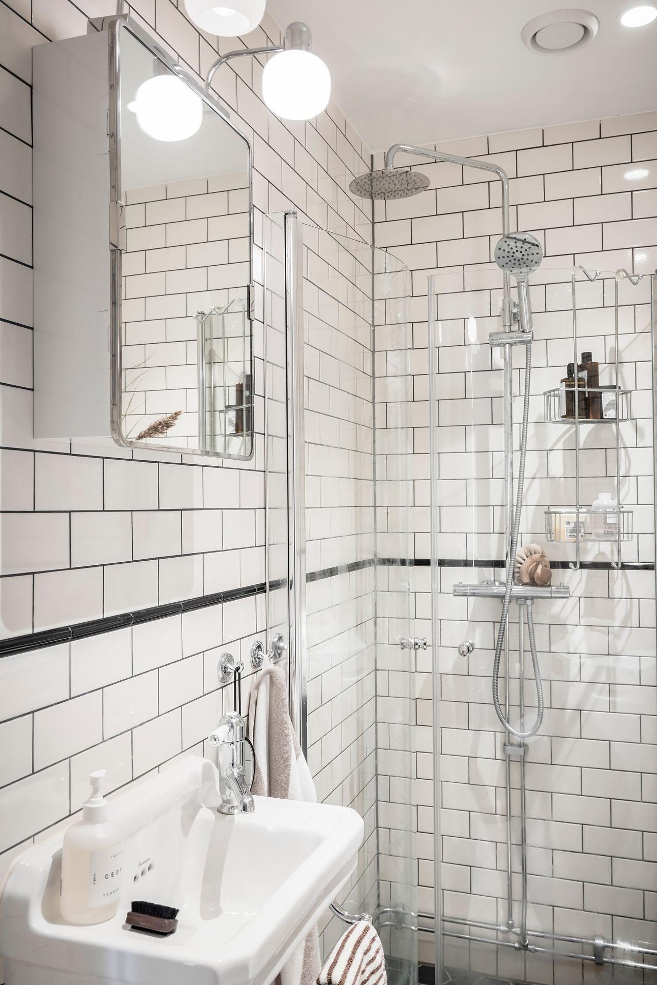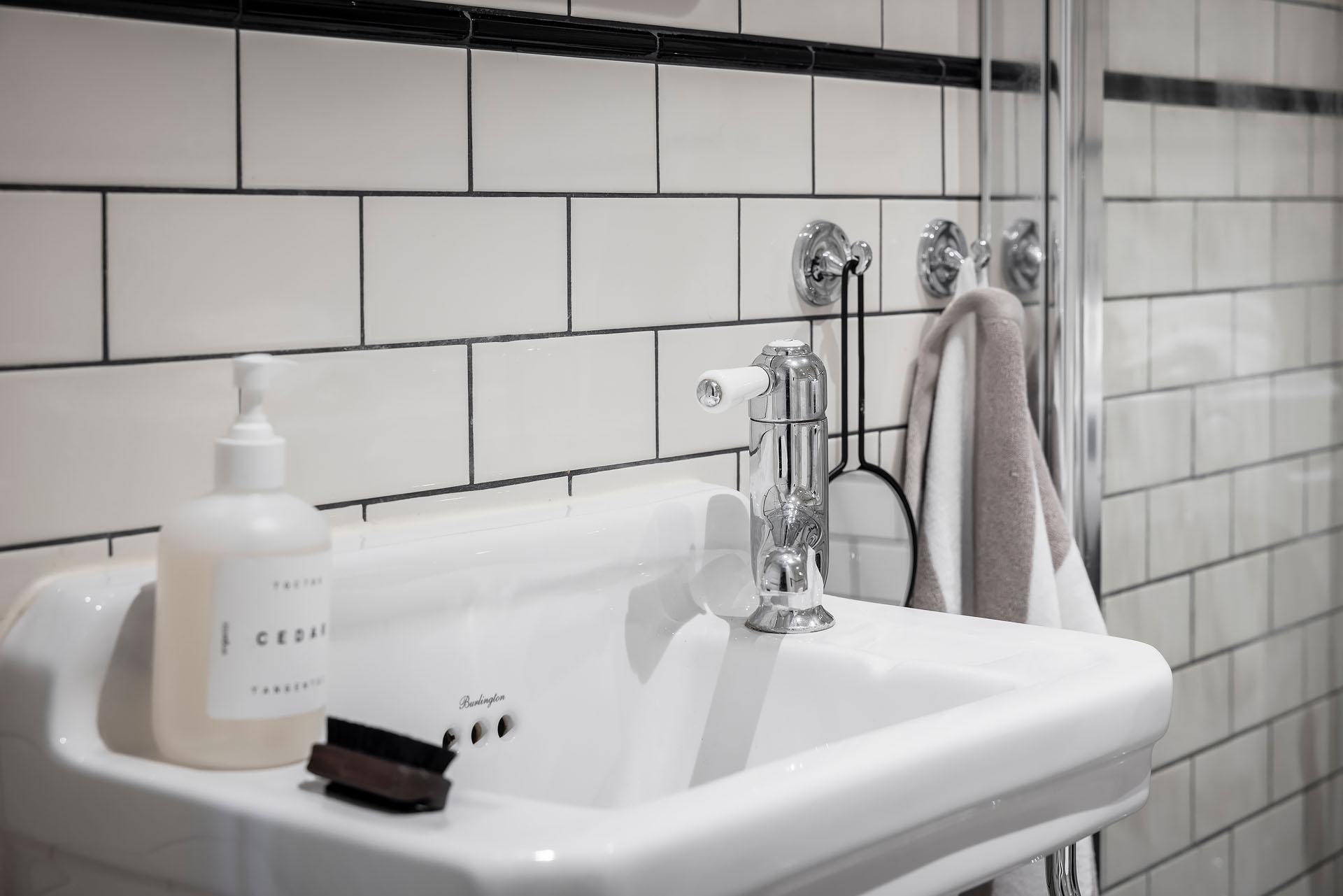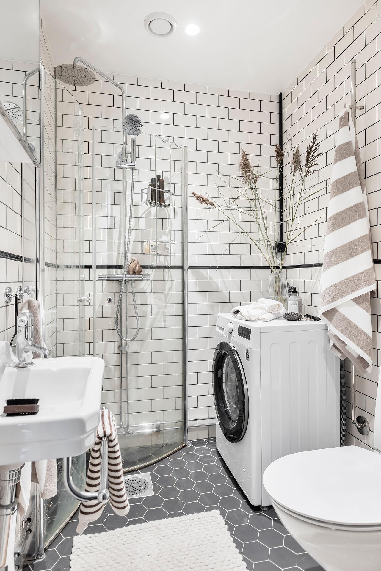 Totalrenoverat under 2022, grått hexagonformat klinker på golvet och vitt kakel lagt i halvförband på väggarna. Det finns plats till en rejäl dusch samt tvättmaskin. Givetvis finns här handdukstork och golvvärme.