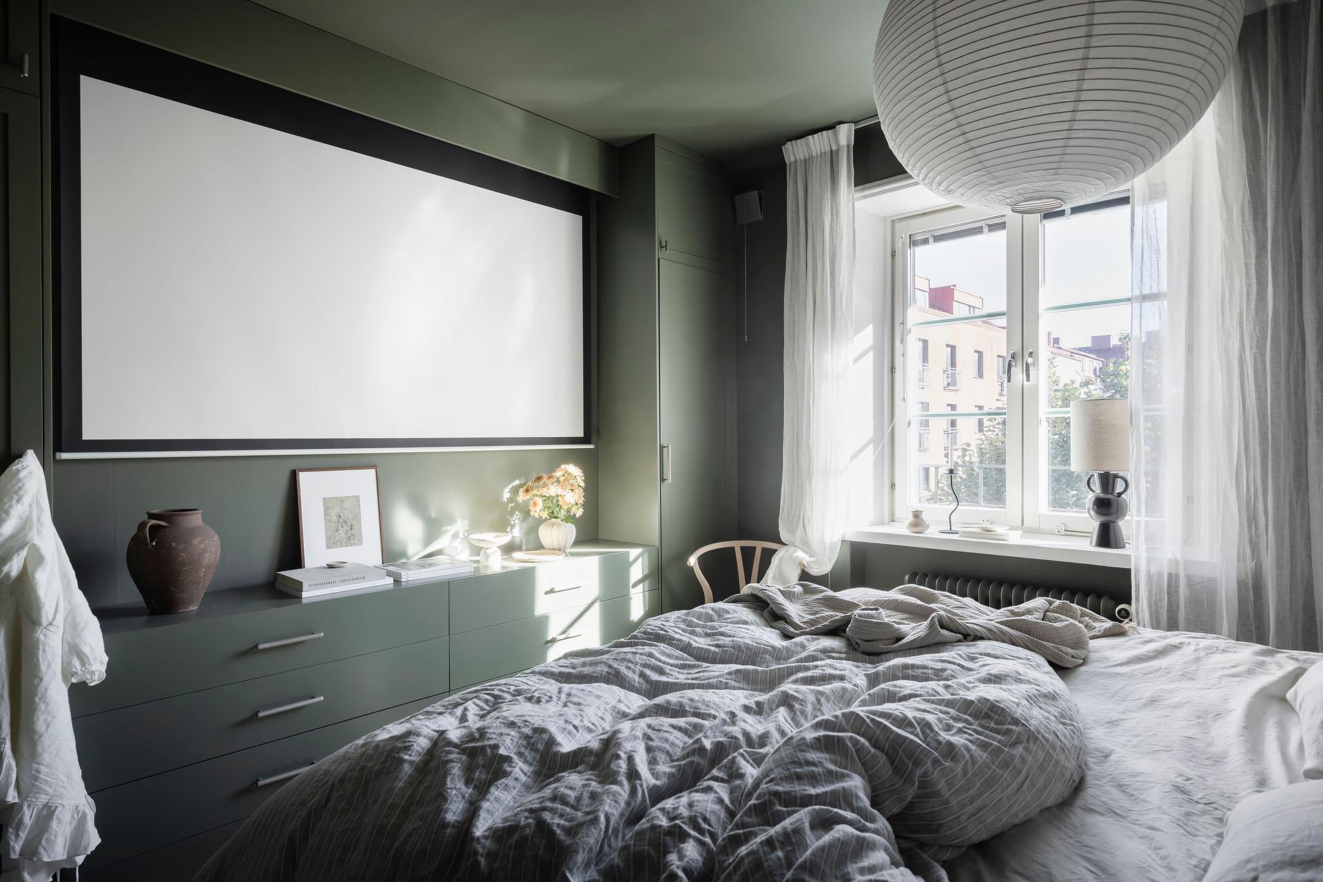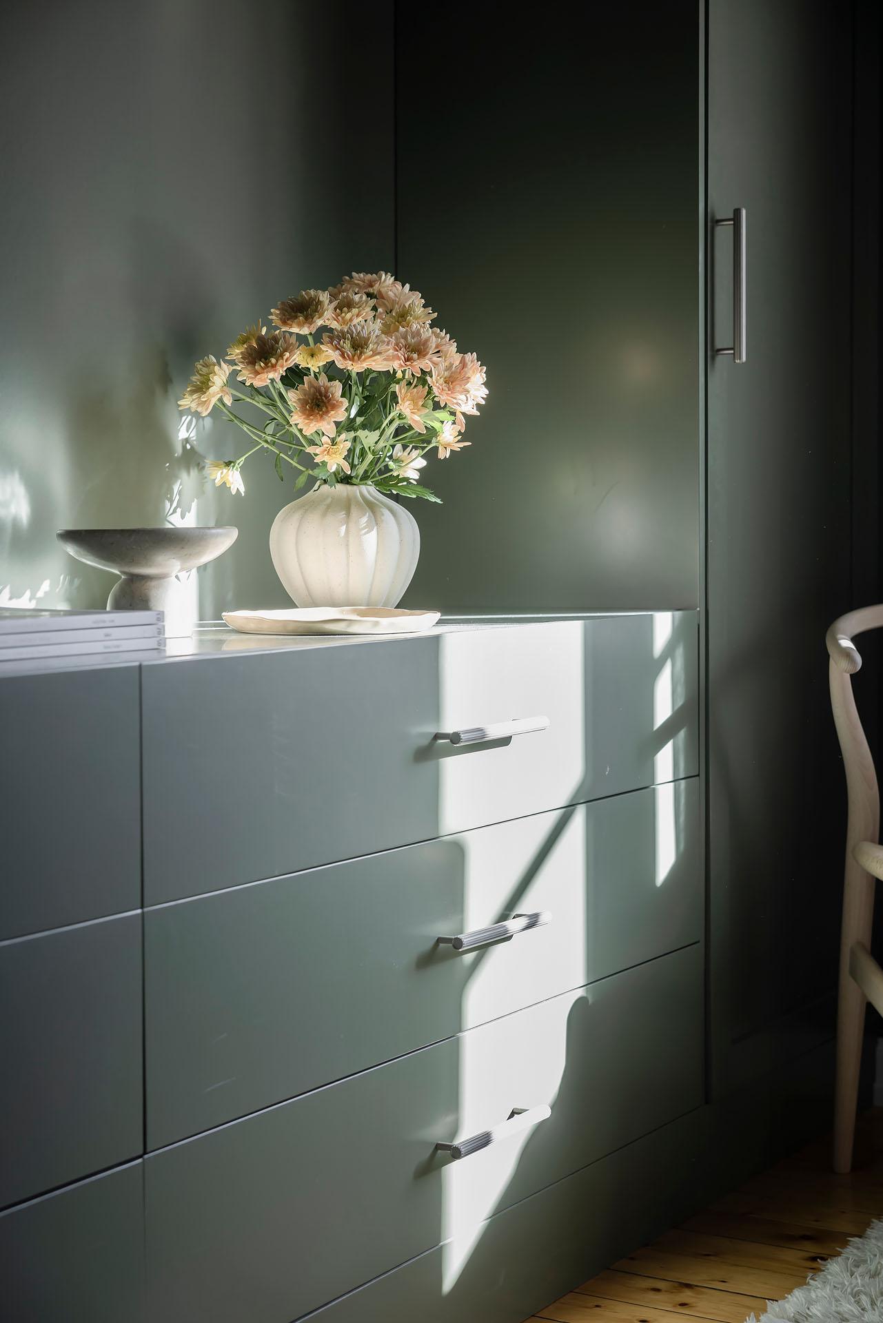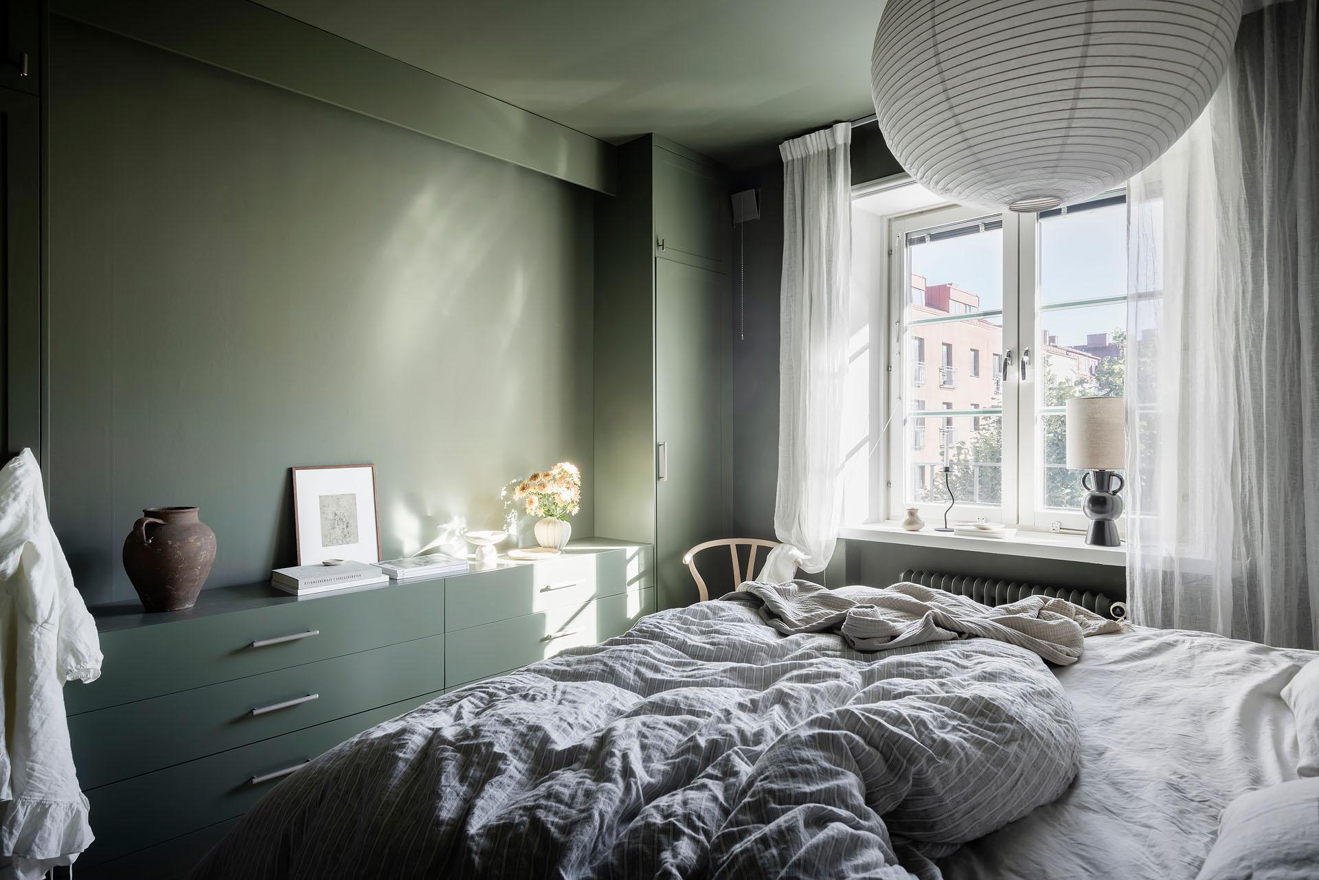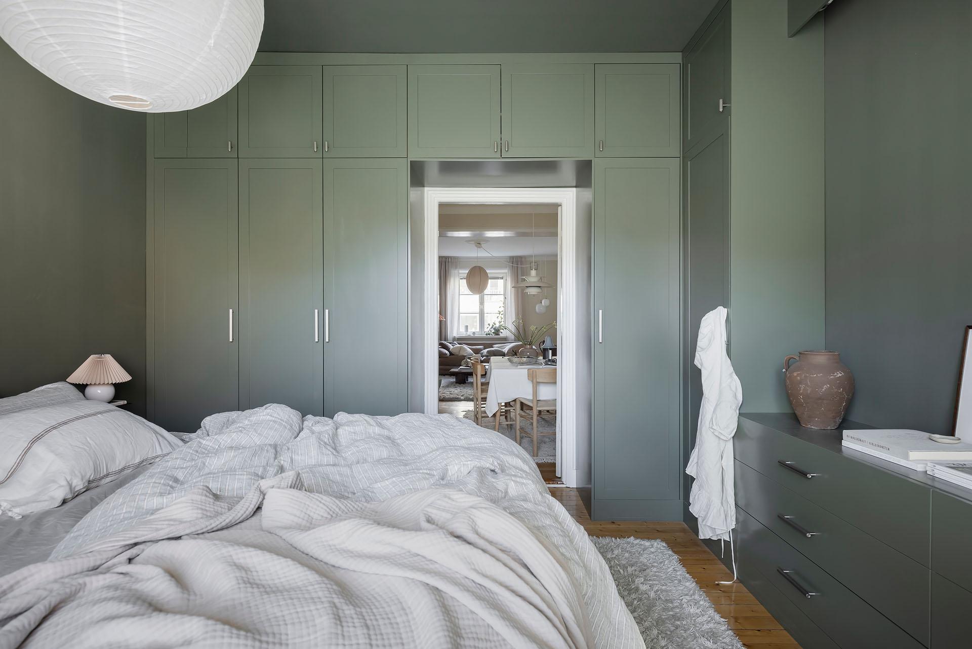 Mot gården ligger sovrummet. Stämningen är vilsam, precis som sig bör i ett sovrum. Närheten till gården gör att rummet upplevs som ett med naturen utan att störa och utan insyn. Väggarna är målad i en harmonisk grön färg och förvaringen är inmålad samma kulör. Här finns plats för en stor dubbelsäng med tillhörande sängbord. Garderoberna platsbyggdes 2025 och har en fin ekpanel på insidan. Här finns gott om förvaring.
